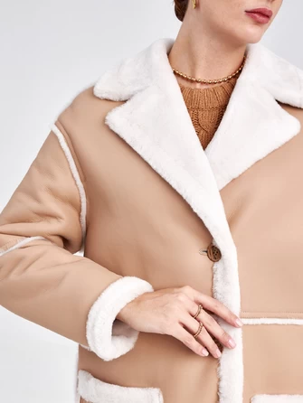 Длинная женская дубленка оверсайз с капюшоном премиум класса 2008, бежевая, размер 48, артикул 62610
