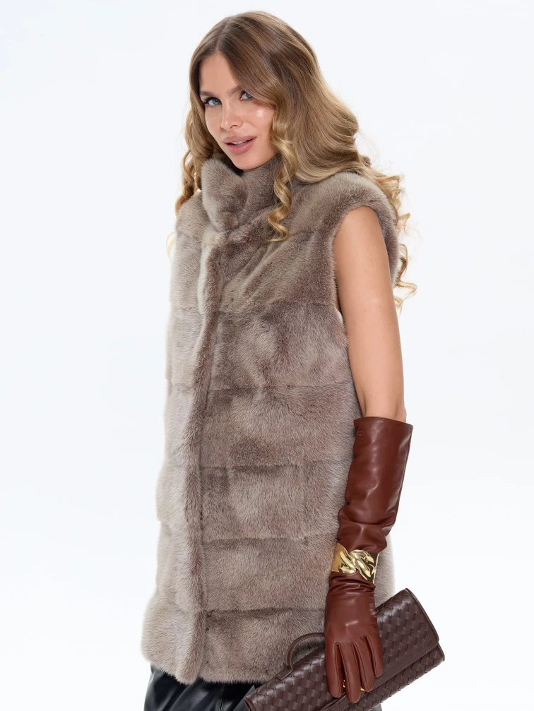 Товар бежевый норковый жилет 01, размер 44, артикул 65470 выполнен из мех норки с застежкой клипсы. Рассчитан на сезон: осень-зима. Длина изделия 75 см, силуэт прямой.