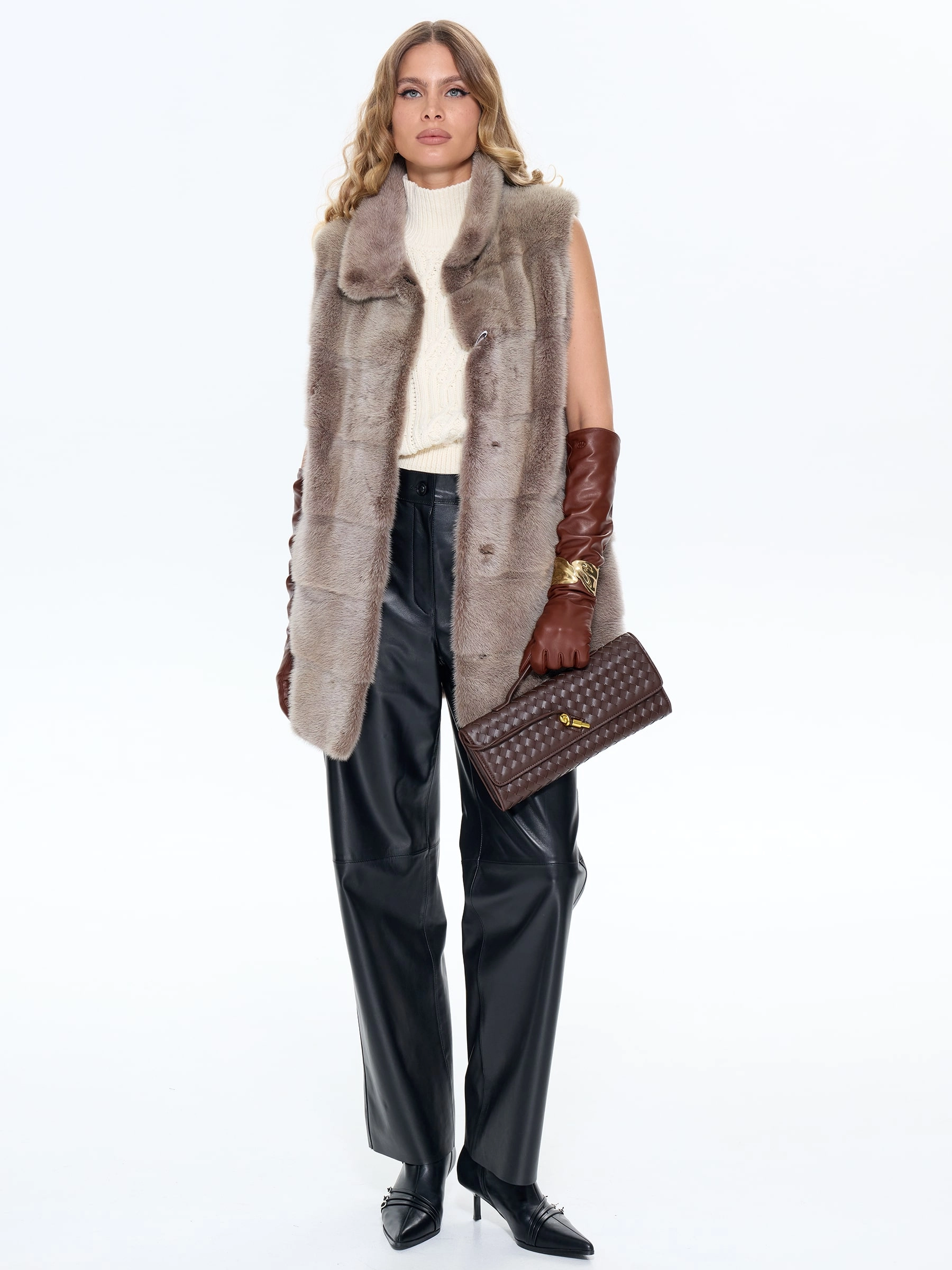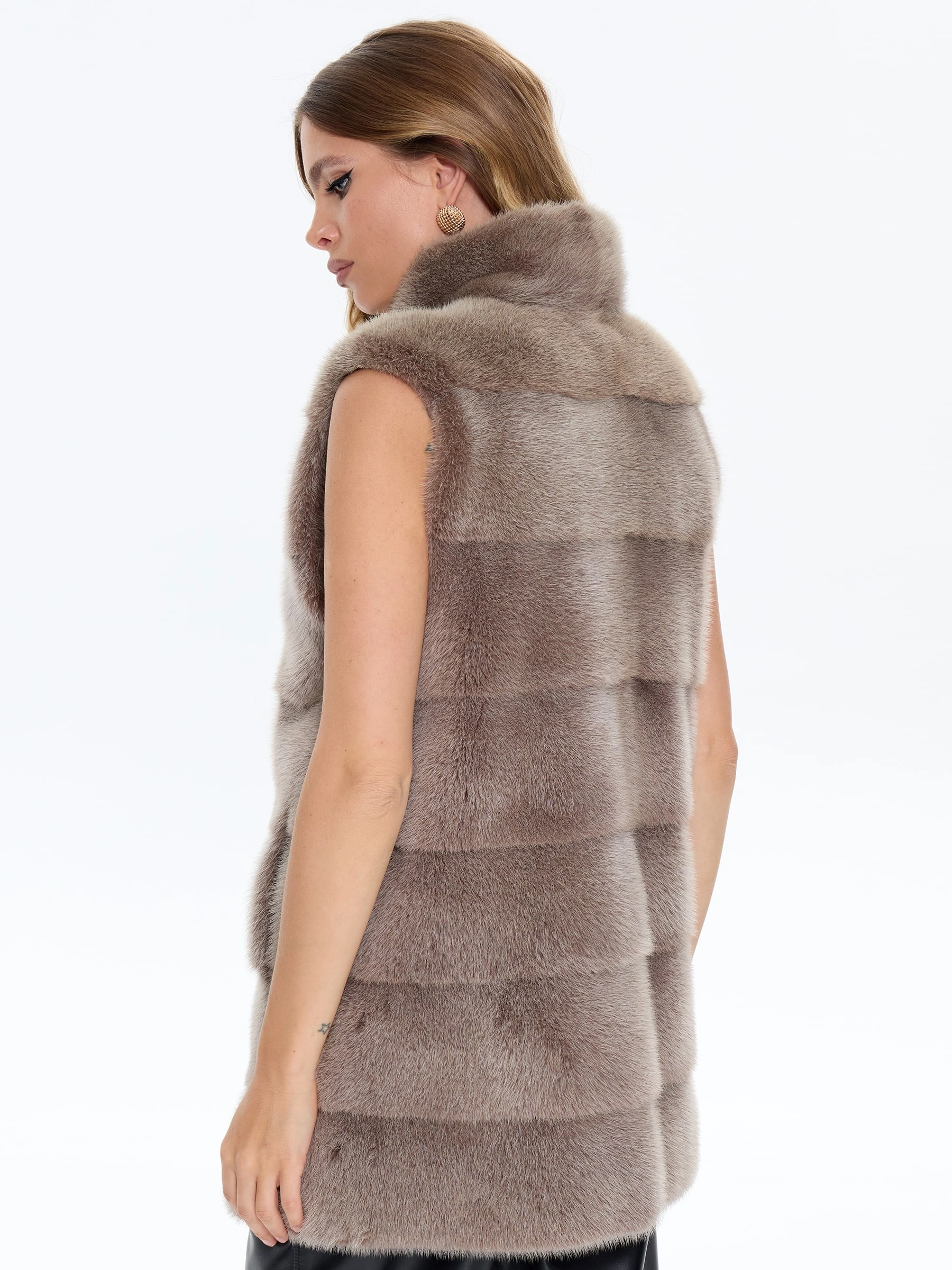 Элегантный длинный жилет из меха норки бежевого оттенка выполнен в классическом прямом силуэте с поперечной раскладкой меха и аккуратным воротником-стойкой. Модель с врезными карманами и длиной 75 см воплощает утонченную роскошь и универсальность. Рекомендация стилиста: сочетайте с водолазкой и кюлотами для дневного образа или накиньте поверх платья-миди с высокими сапогами для вечернего выхода. Этот жилет станет жемчужиной гардероба, добавляя образу безупречный шарм и благородную эстетику.