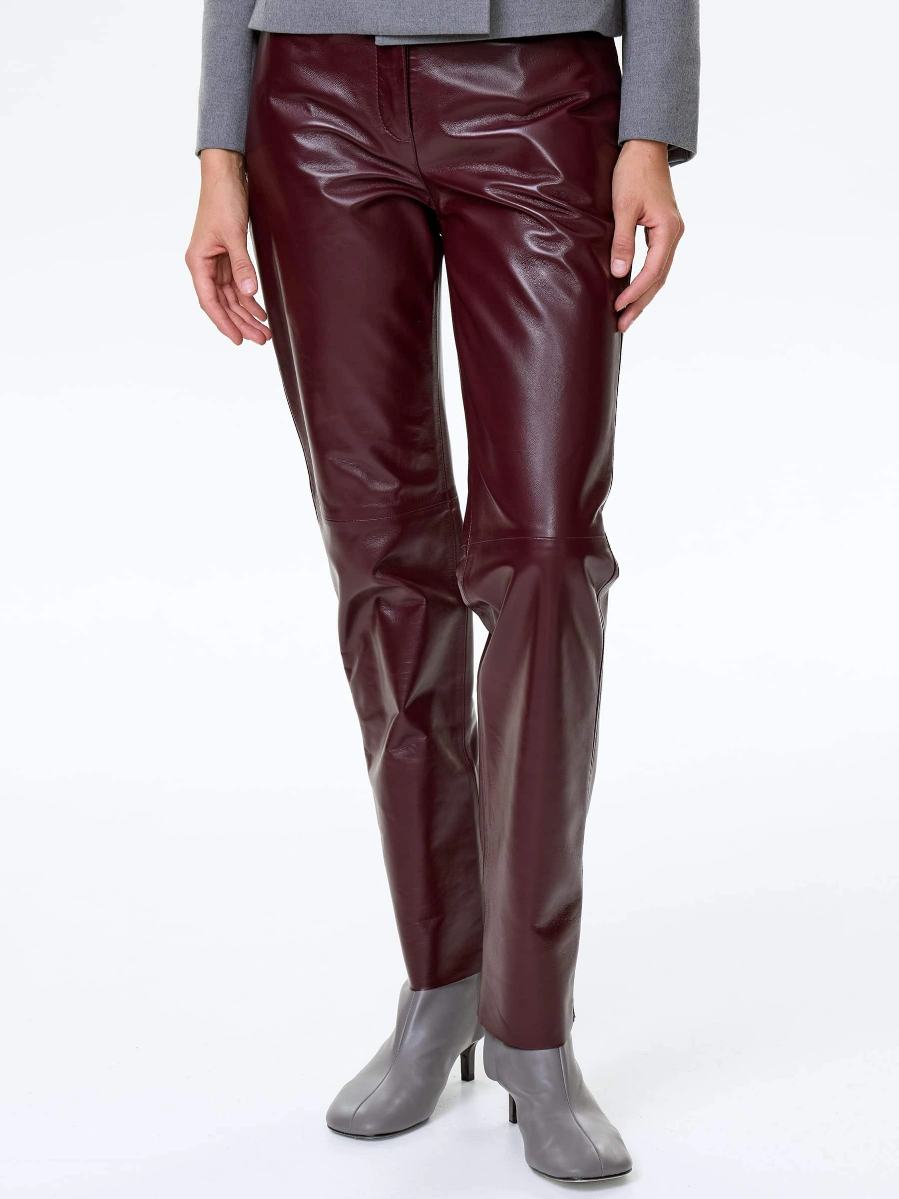 Зауженные брюки из натуральной кожи насыщенного бордового оттенка сочетают элегантность и комфорт. Модель прямого силуэта со средней посадкой идеально подчеркивает женственность. Длина 105 см создает стройный силуэт. Четыре функциональных кармана — два боковых и два задних — добавляют практичности, сохраняя лаконичность дизайна. Потайная застежка-молния с декоративной планкой обеспечивает аккуратный внешний вид и подчеркивает чистоту линий. Глубокий бордовый цвет позволяет создавать разнообразные образы — от классических сочетаний с белой рубашкой до современных луков с объемными свитерами или кожаными жакетами. Эти брюки станут универсальным выбором как для повседневной носки, так и для особых случаев.