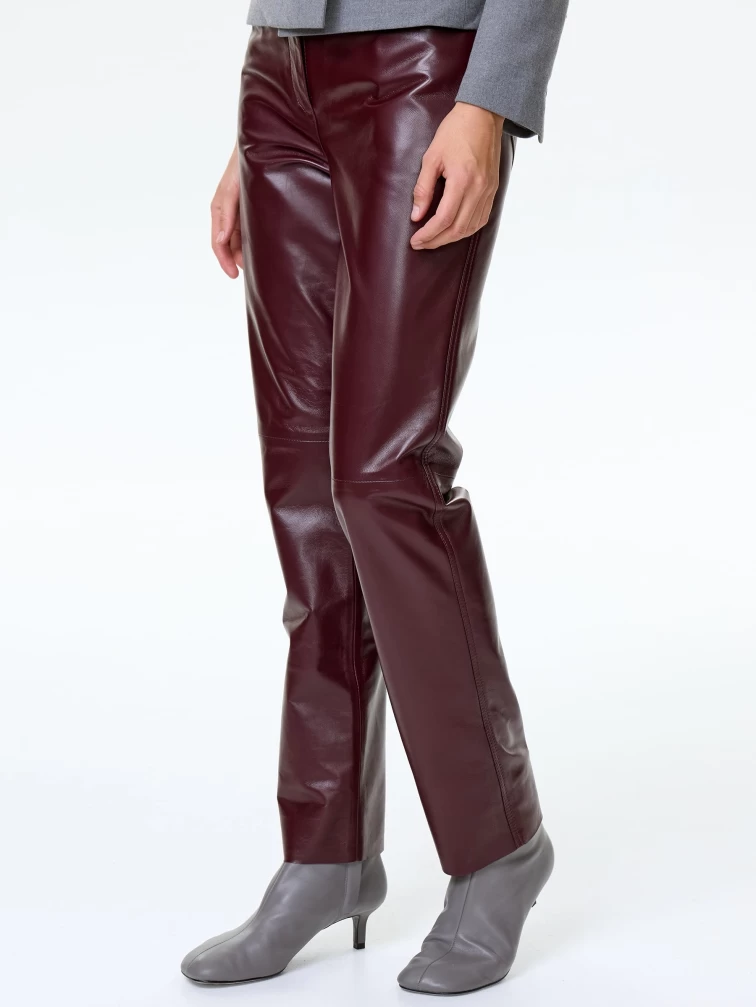 Зауженные брюки из натуральной кожи бордового и черного цвета прямого силуэта со средней посадкой. Модель выполнена из качественной кожи, длина изделия составляет 105 см. Практичность подчеркивают четыре кармана - два боковых и два задних. Элегантность силуэта завершает потайная застежка-молния с декоративной планкой.