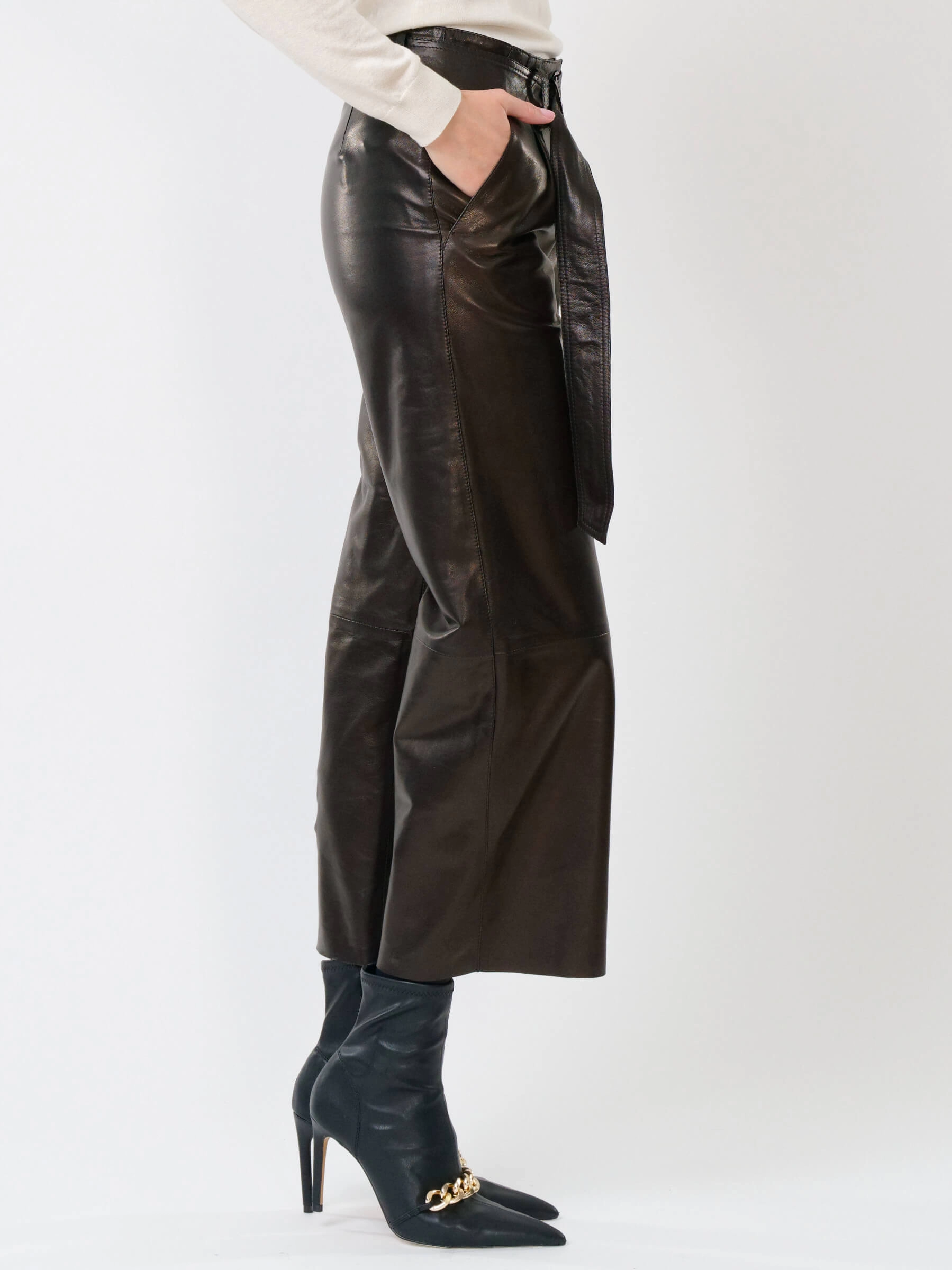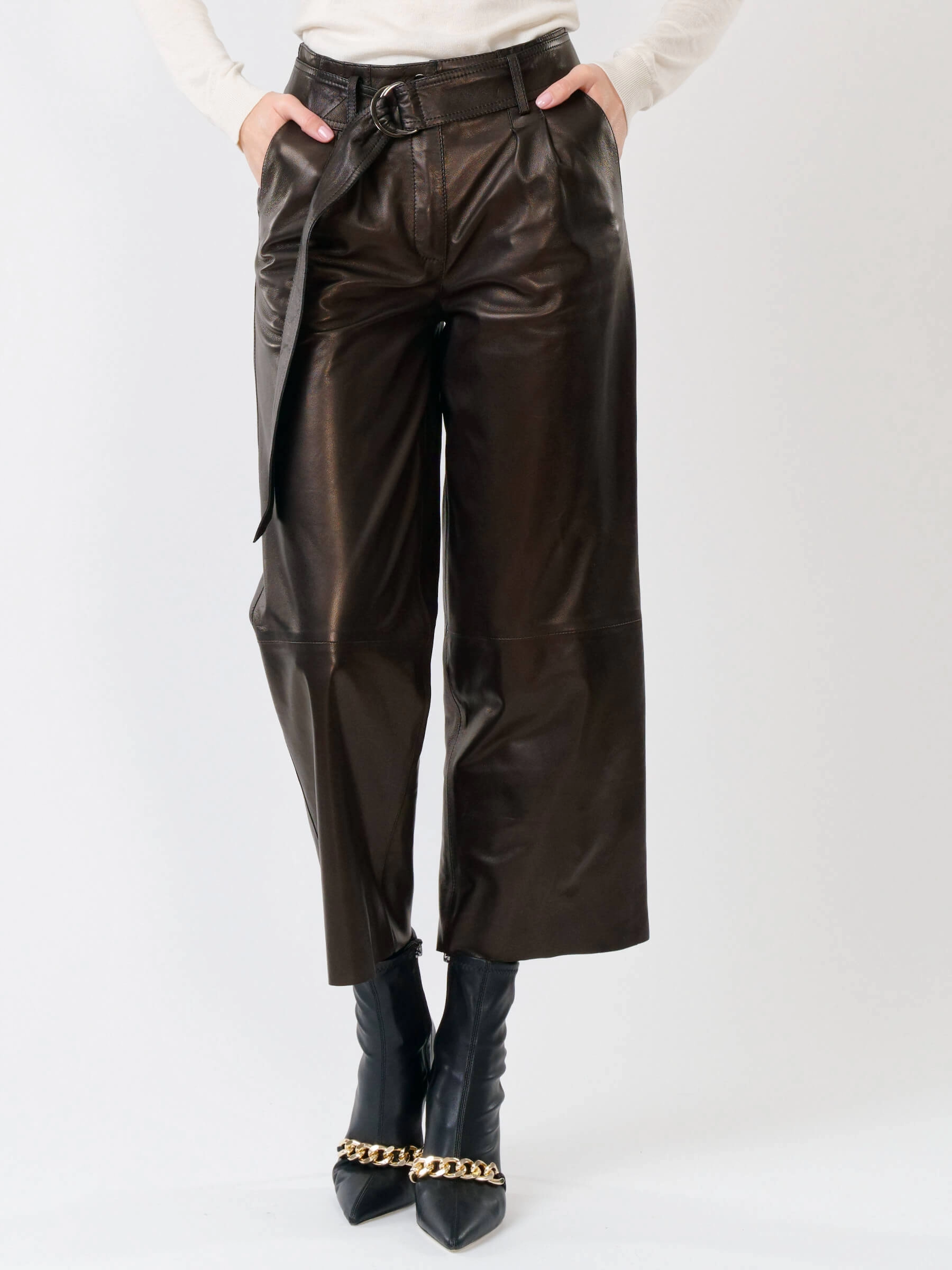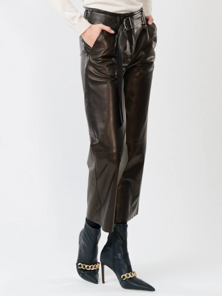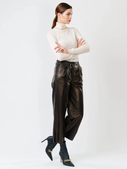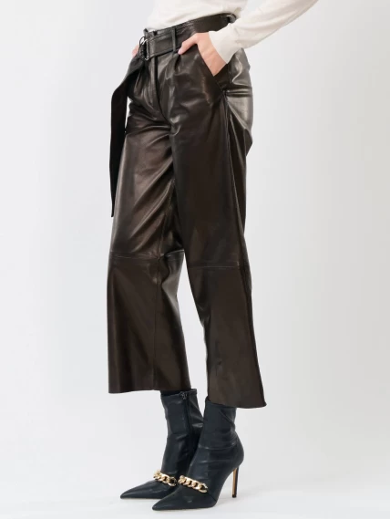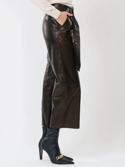 Женские укороченные брюки из натуральной кожи черного цвета выполнены в свободном крое. Длина составляет 91 см. Модель с двумя врезными карманами дополнена широким ремнём с пряжкой. Вискозная подкладка обеспечивает комфорт, а скрытая застежка-молния под планкой сохраняет лаконичный силуэт. Брюки сочетаются с шелком, хлопком, денимом и другими материалами.