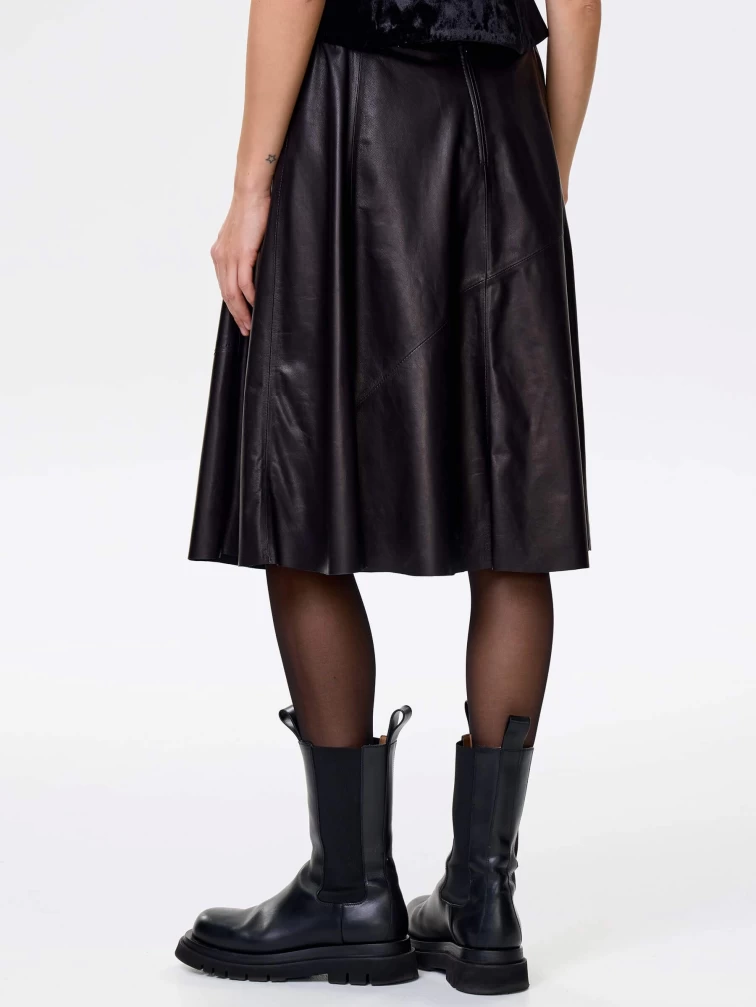 Облегающая расклешённая юбка из натуральной мягкой кожи черного цвета с благородным блеском сочетает комфорт, долговечность и безупречный стиль. Её летящий крой визуально стройнит фигуру, добавляя образу лёгкость и динамику, а эксклюзивная отделка ручной строчкой подчёркивает премиальное качество материала. Длинный пояс из той же кожи служит стильным акцентом, а потайная молния сзади обеспечивает идеальную посадку и чистоту линий, делая эту модель по-настоящему уникальной.