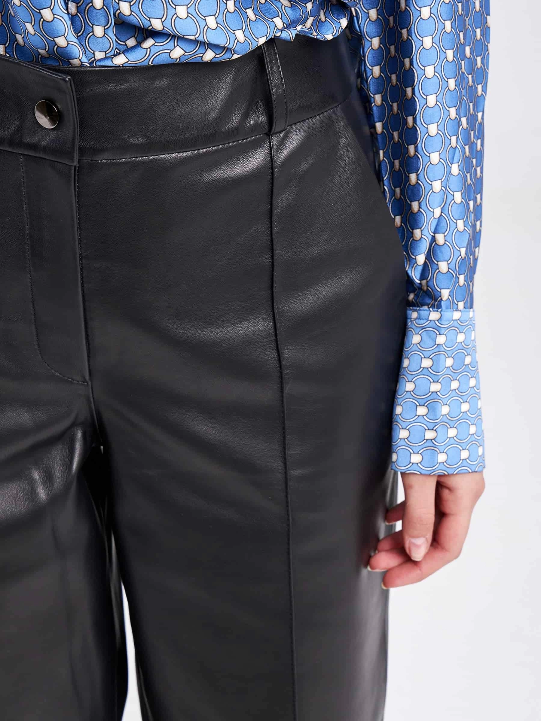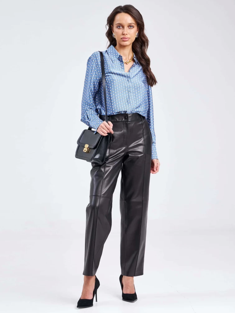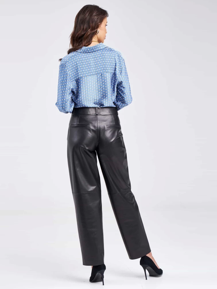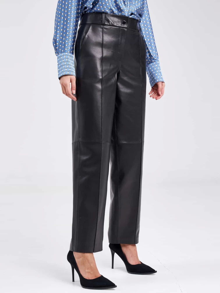 Создать эффектный образ помогут брюки со стрелками из натуральной кожи премиум-класс. Прямой крой, средняя посадка, удобные боковые карманы.