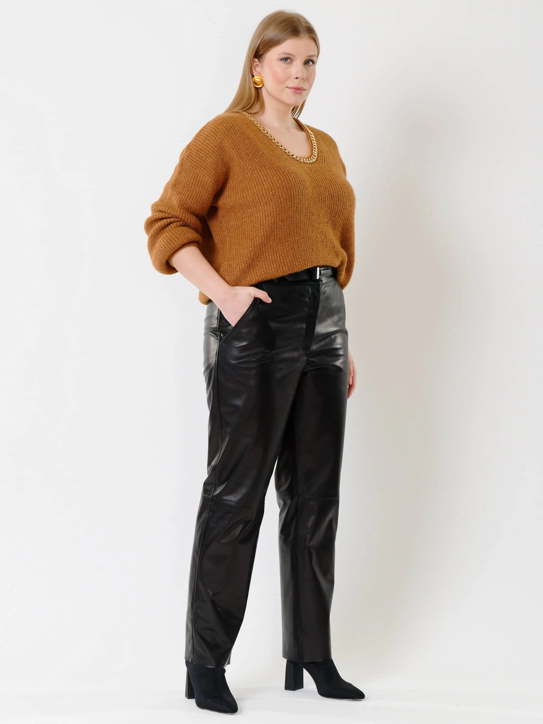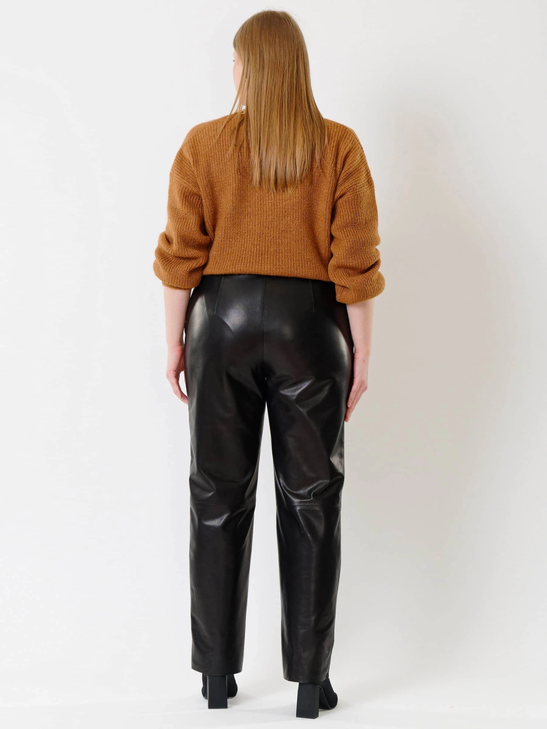 Товар черные прямые женские кожаные брюки 04, размер 46, артикул 85392 выполнен из натуральной кожи с застежкой молния. Рассчитан на сезон: демисезон. Длина изделия 105 см, силуэт свободный.