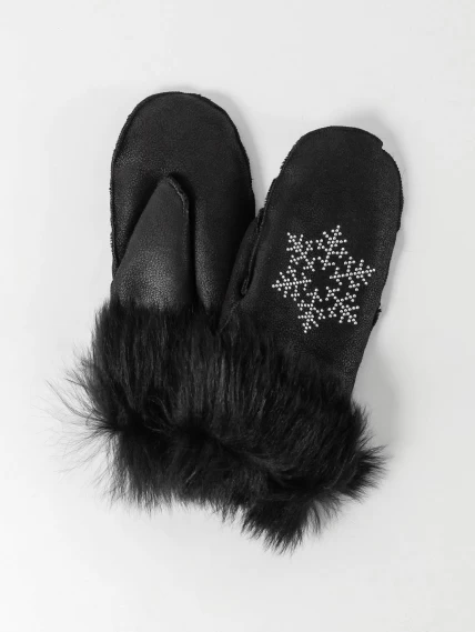 Черные варежки-снежинка из овчины меховой женские, размер One Size, артикул 20450