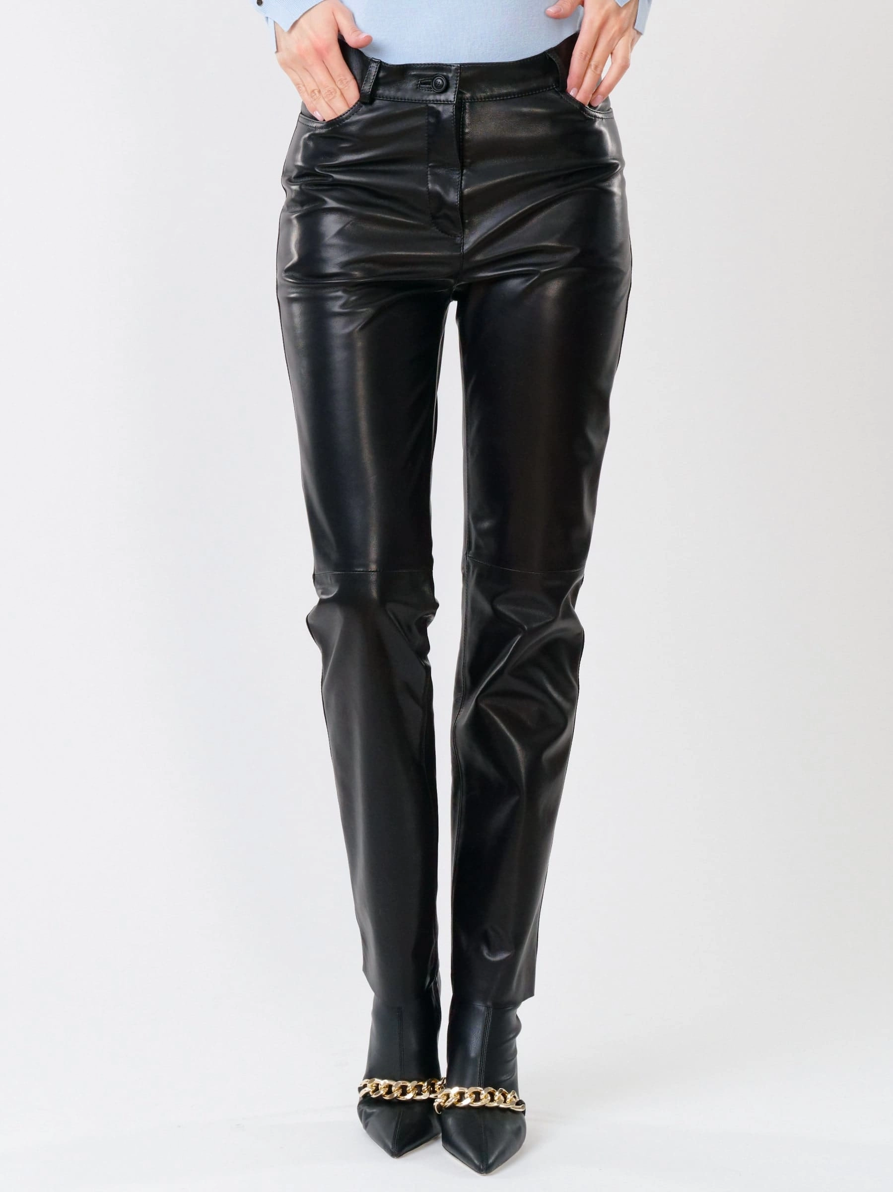 Строгие зауженные брюки из натуральной черной кожи воплощают современную элегантность. Классический прямой силуэт со средней посадкой подчеркивает женственный образ, сохраняя при этом максимальный комфорт. Идеальная длина 105 см создает визуальную стройность. Четыре продуманных кармана - два накладных спереди и два скрытых сзади - сочетают функциональность с чистотой линий. Глубокий черный цвет открывает безграничные возможности для создания образов: от офисных ансамблей с классическими блузами до дерзких вечерних луков с атласными топами или кожаными косухами. Эти брюки - образец вневременной стильности, где каждая деталь продумана для тех, кто ценит лаконичность и безупречный вкус.