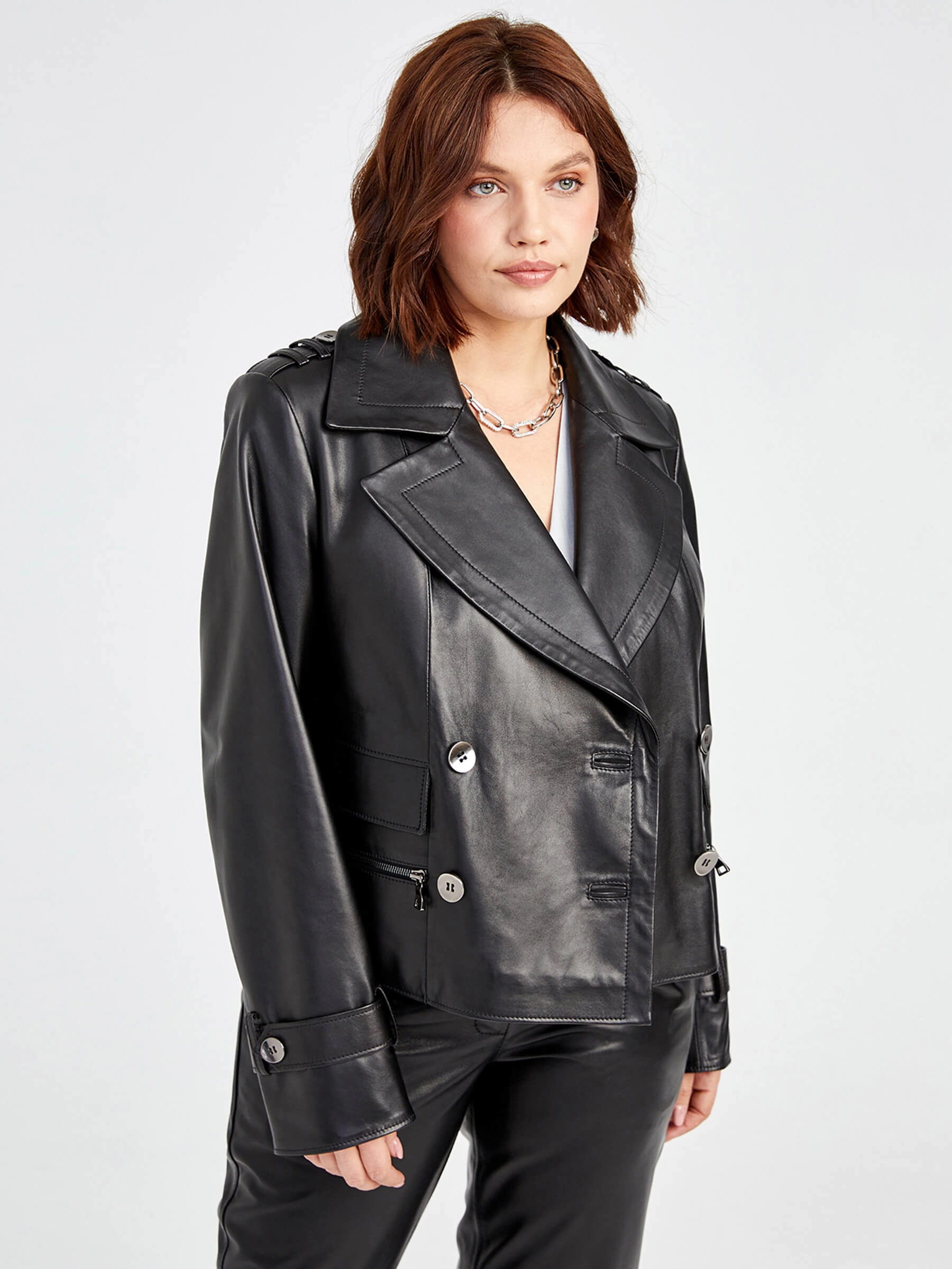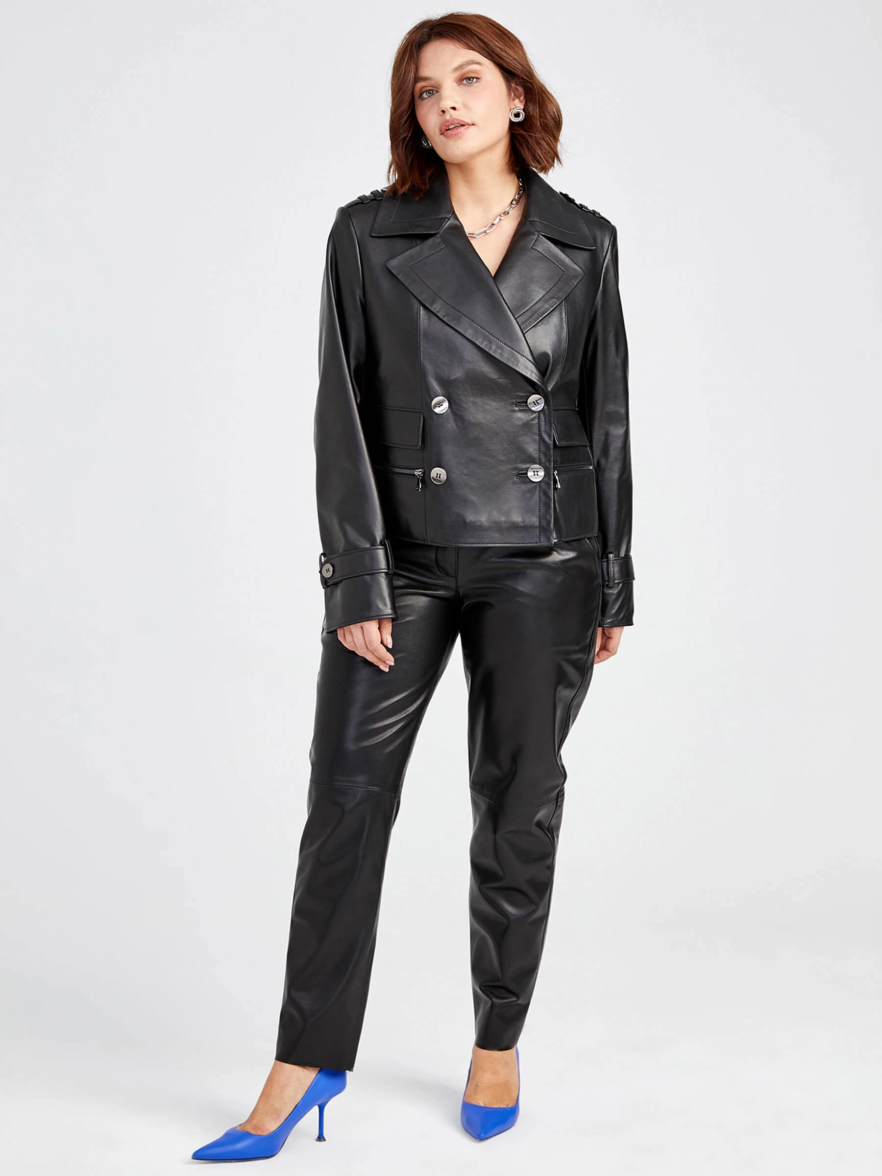 Брутальная черная косуха обрела силуэт знакового двубортного жакета. Четко очерченные плечи, острые лацканы и два ряда гладких пуговиц. Модель из мягкой кожи с легким глянцевым блеском.