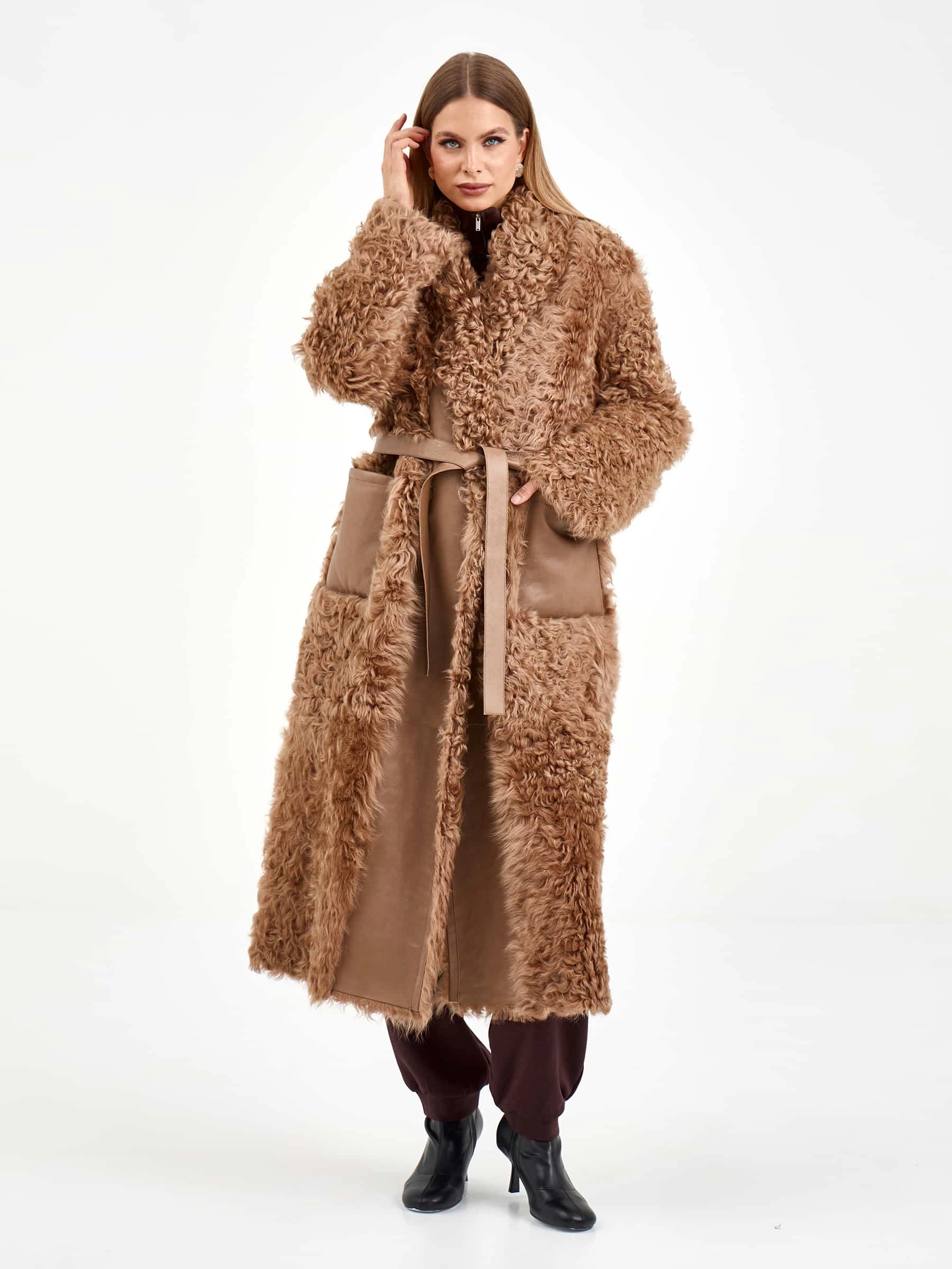 Товар длинная дубленка из натуральной овчины тиградо для женщин премиум класса 2020, светло-коричневая, размер 42, артикул 62470 выполнен из овчина "тиградо" с застежкой пояс. Рассчитан на сезон: осень-зима. Длина изделия 122 см, силуэт прямой.