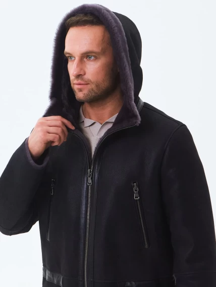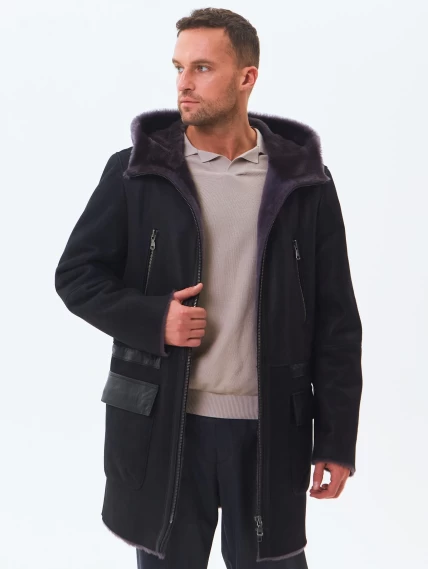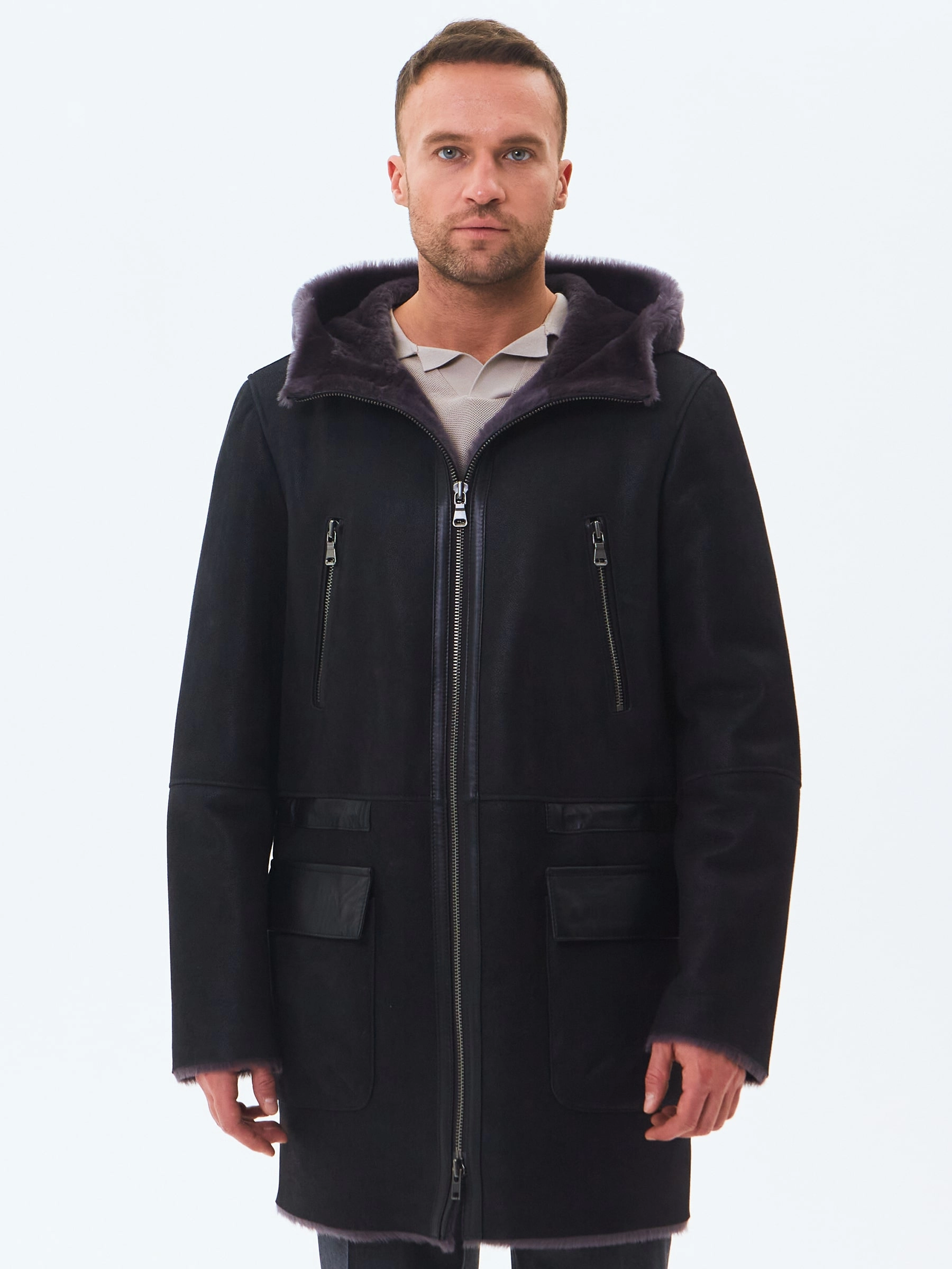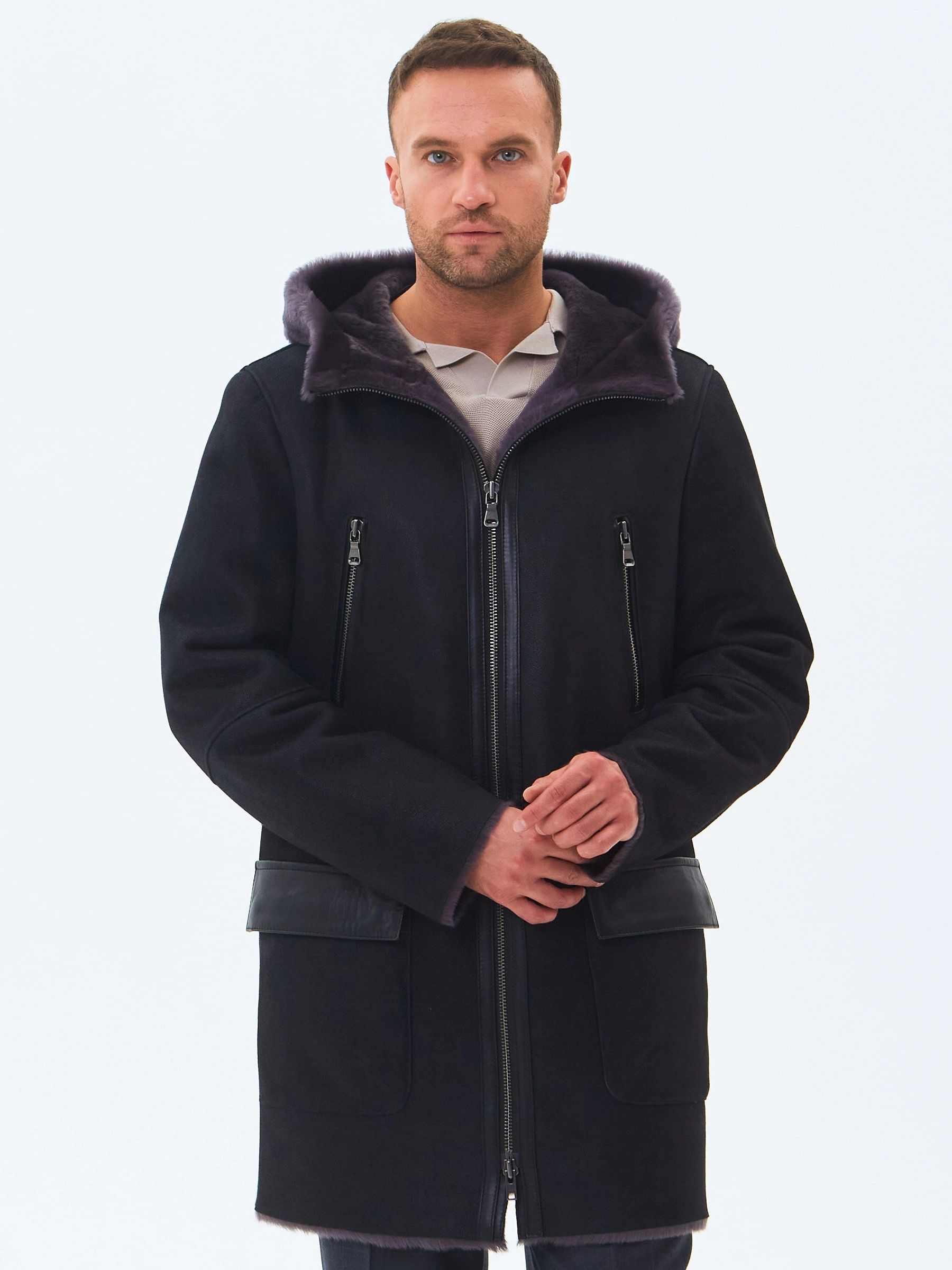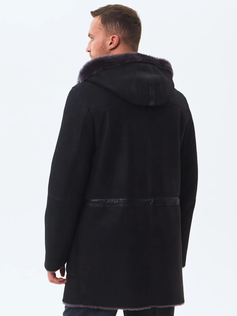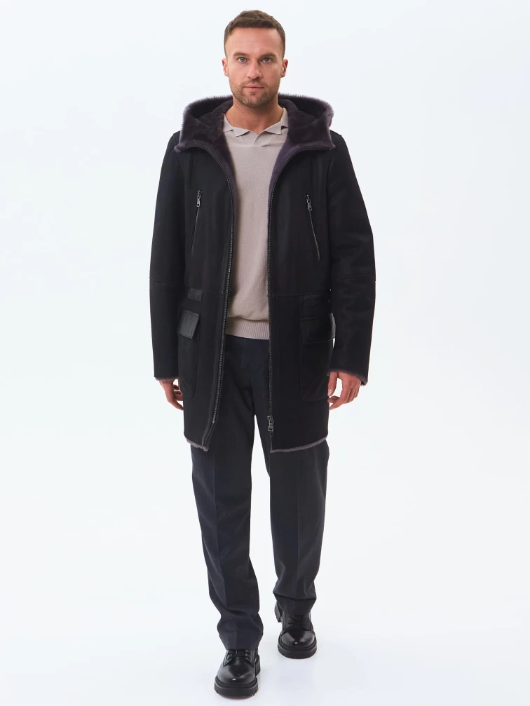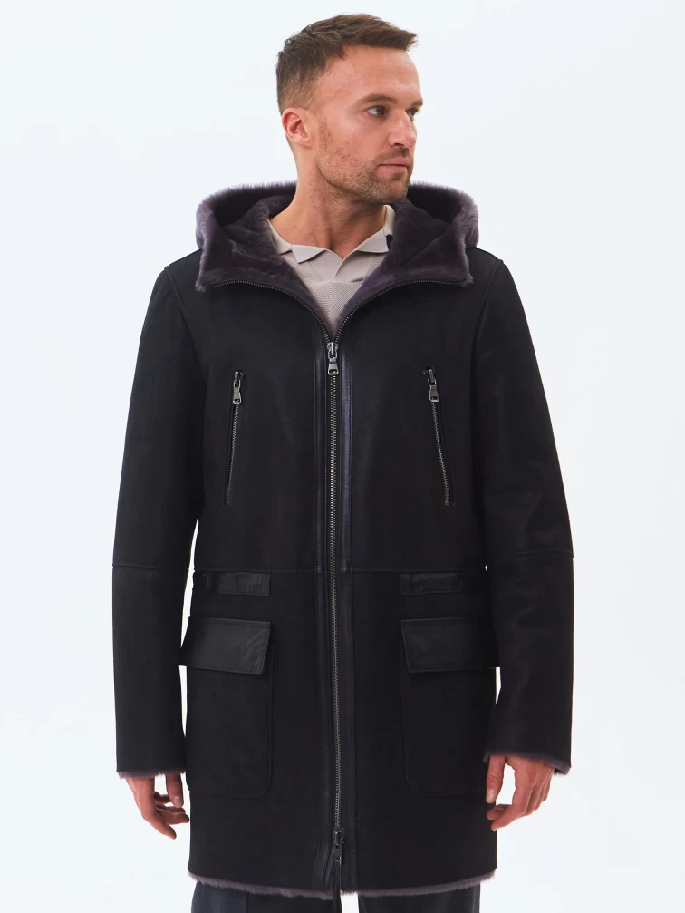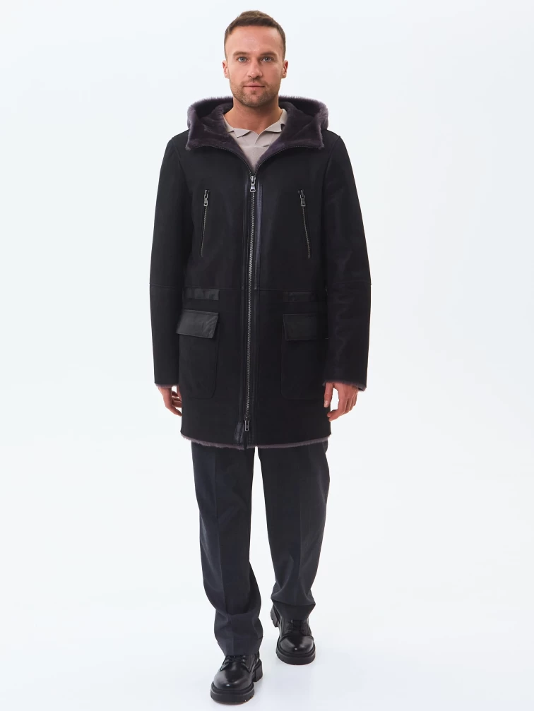 Длинная мужская дубленка с капюшоном премиум класса 429, черная, размер 52, артикул 71460