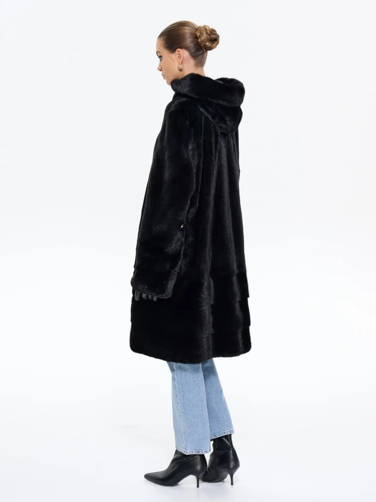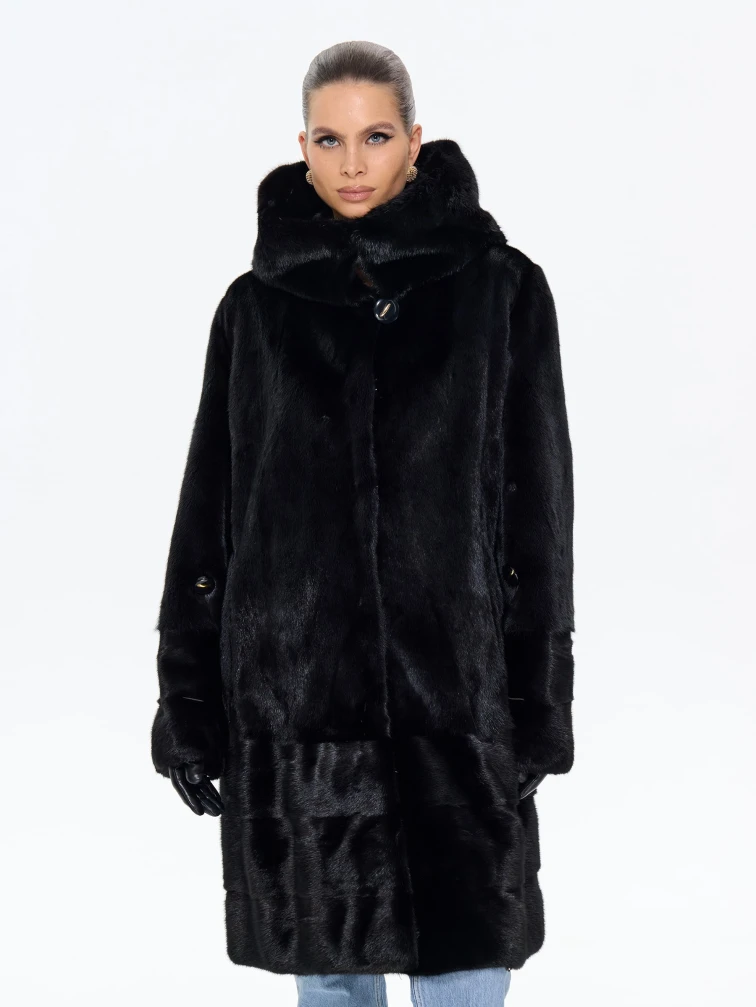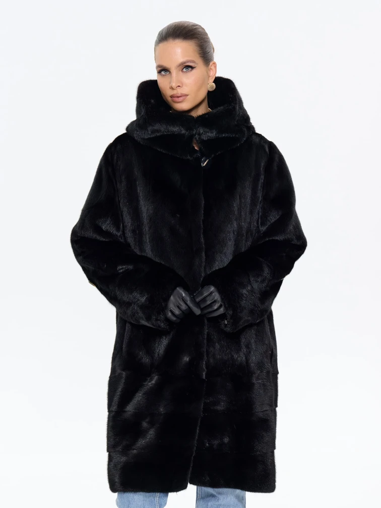 Длинная норковая женская шуба с капюшоном М-102- 664, черная, размер 56, артикул 65360