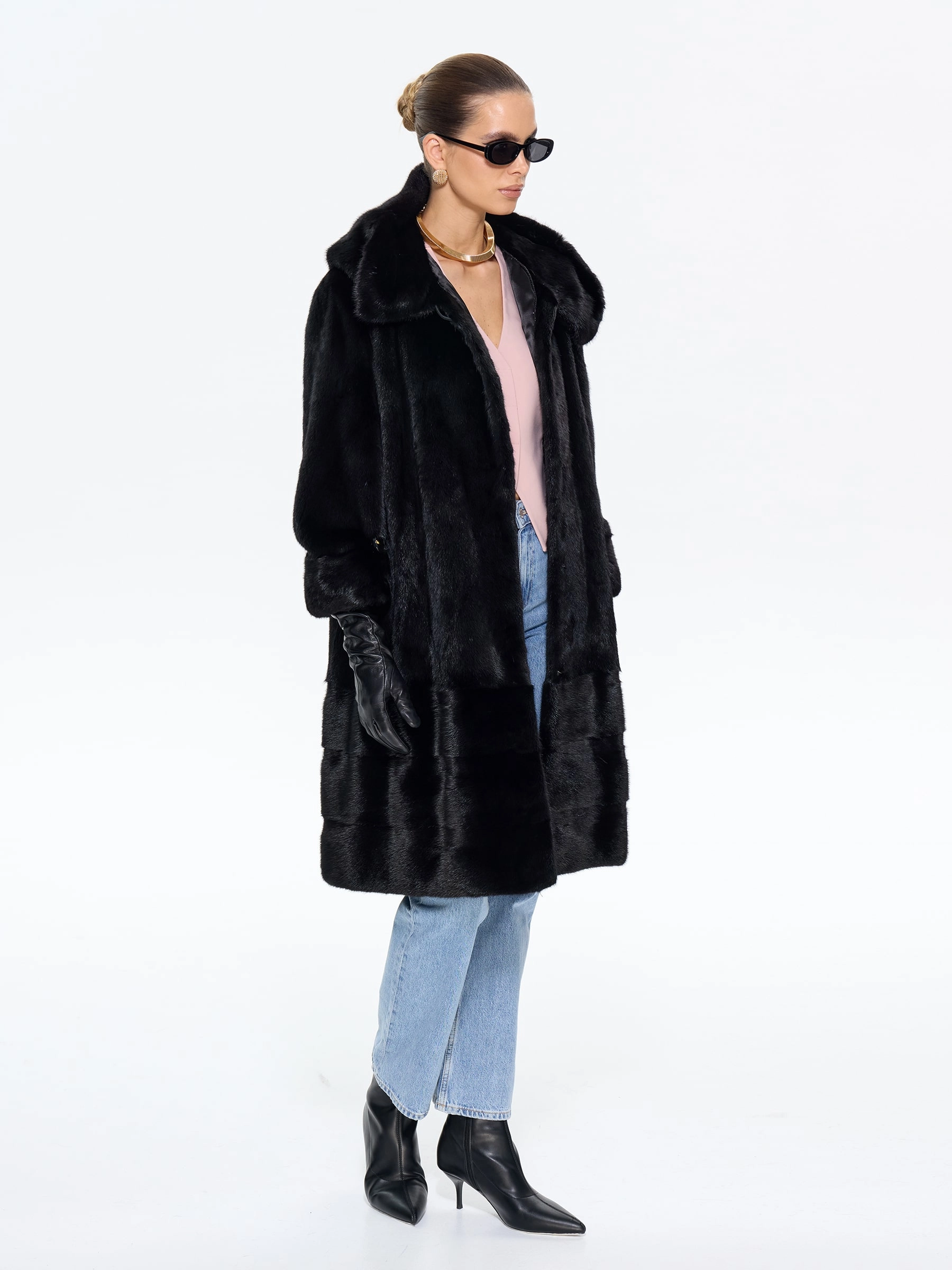 Роскошная шуба из черной норки премиум-класса с глубоким капюшоном и элегантным прямым силуэтом. Модель длиной 100 см отличается изысканной деталью — поперечной выкладкой меха по низу изделия, а также практичными втачными рукавами с регулируемой длиной. Стилисты рекомендуют носить эту утепленную шубу с джинсами, грубыми ботинками и объемным свитером для повседневного образа или с кожаными брюками и каблуками для вечернего выхода — ее универсальность и вневременная элегантность обеспечат вам безупречный вид в любую погоду.