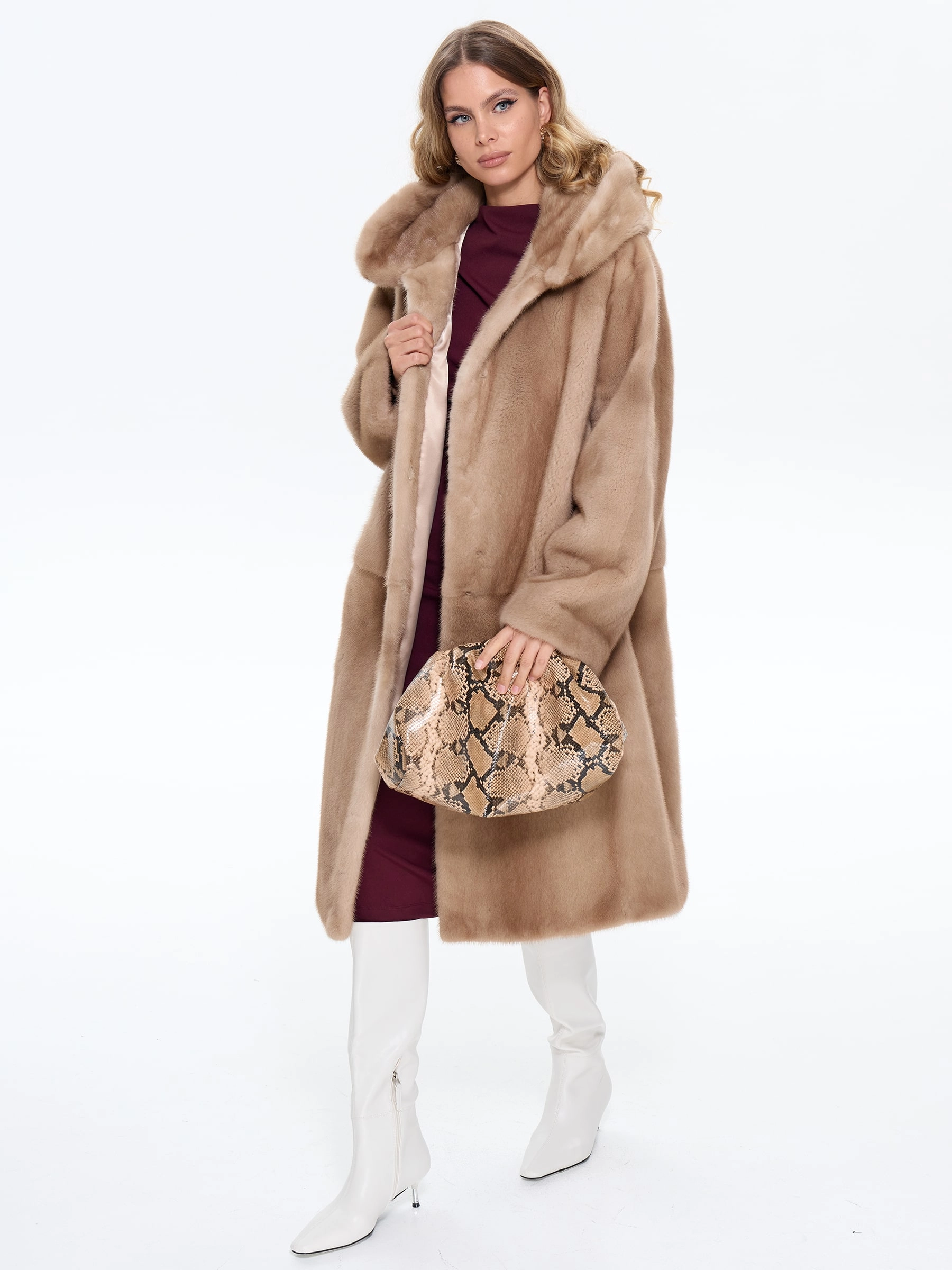 Длинная норковая женская шуба с капюшоном Жанет, пастельная, размер 52, артикул 65170