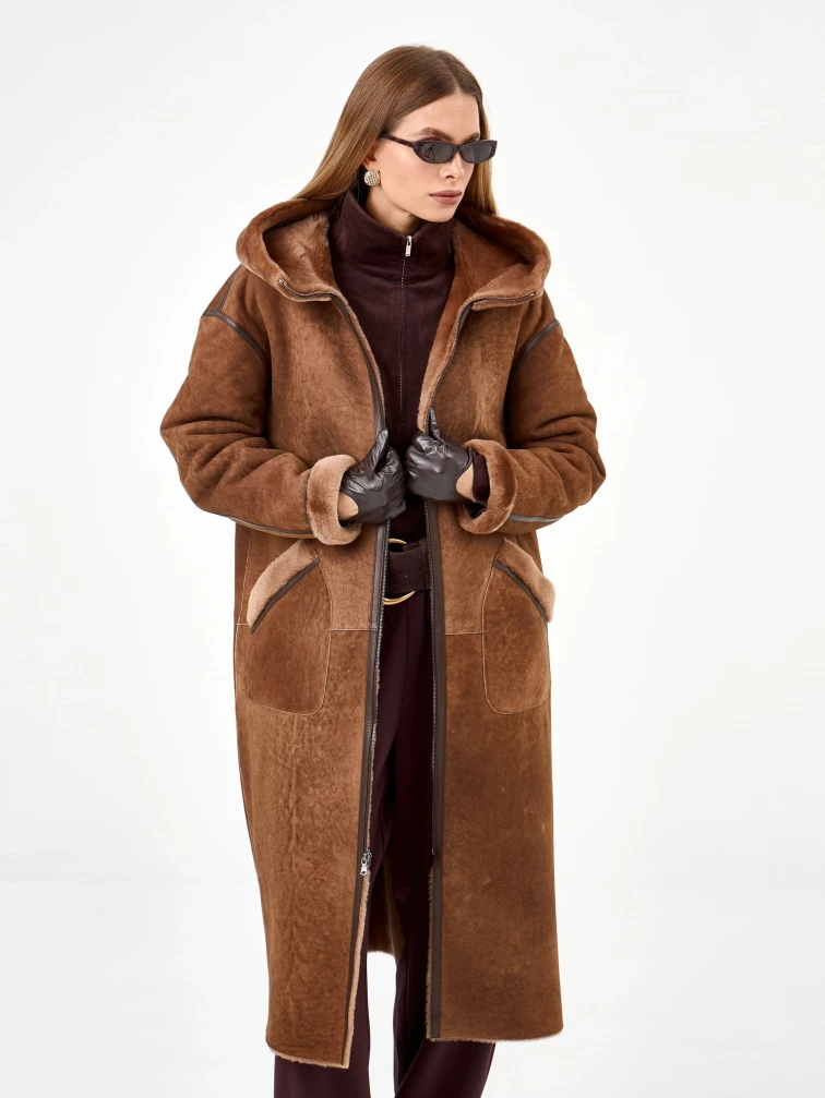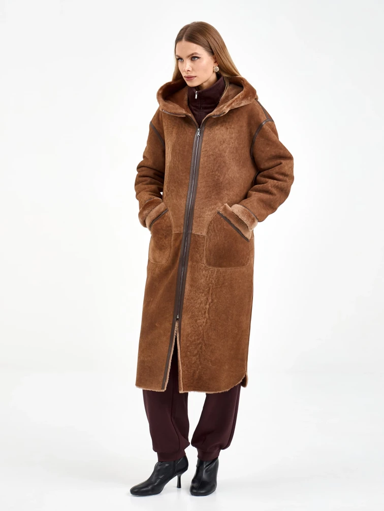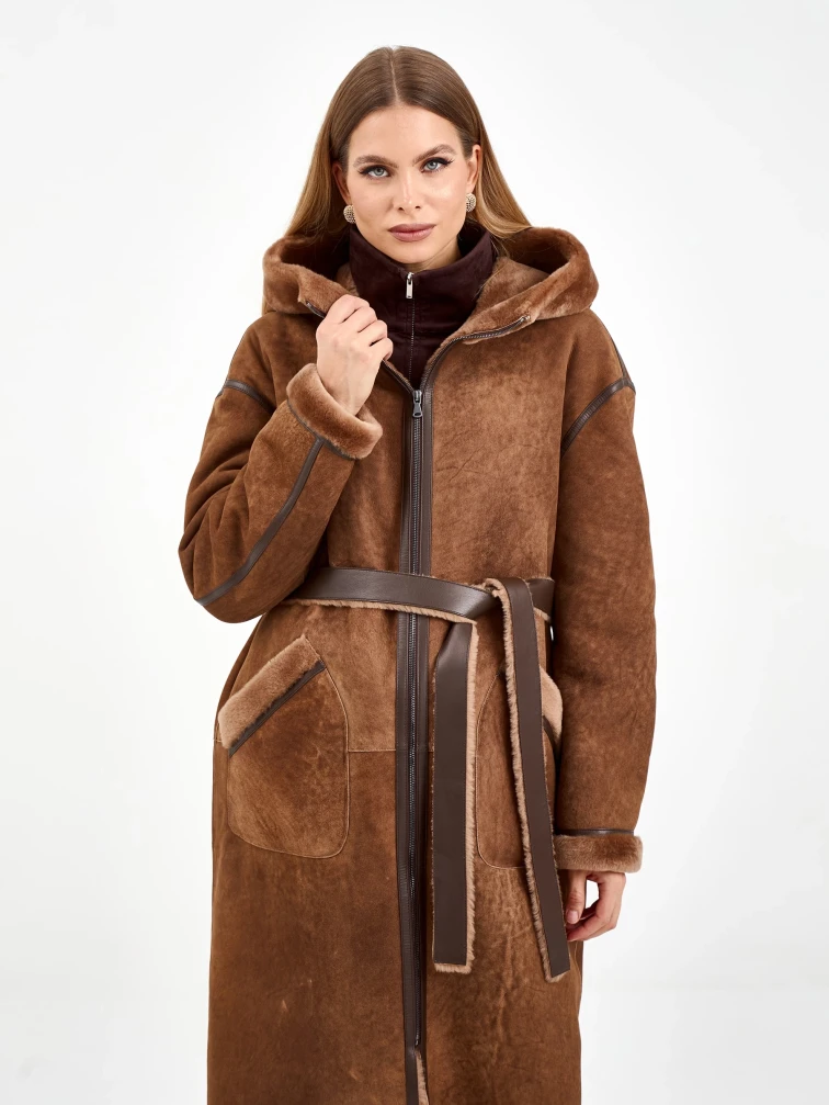 Товар длинная женская дубленка с капюшоном 2073, коричневая, размер 46, артикул 65240 выполнен из овчина "мерино" с застежкой молния. Рассчитан на сезон: зима. Длина изделия 115 см, силуэт свободный.