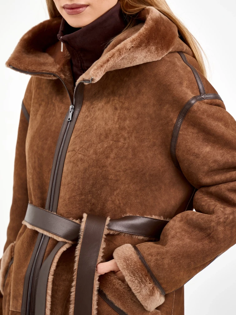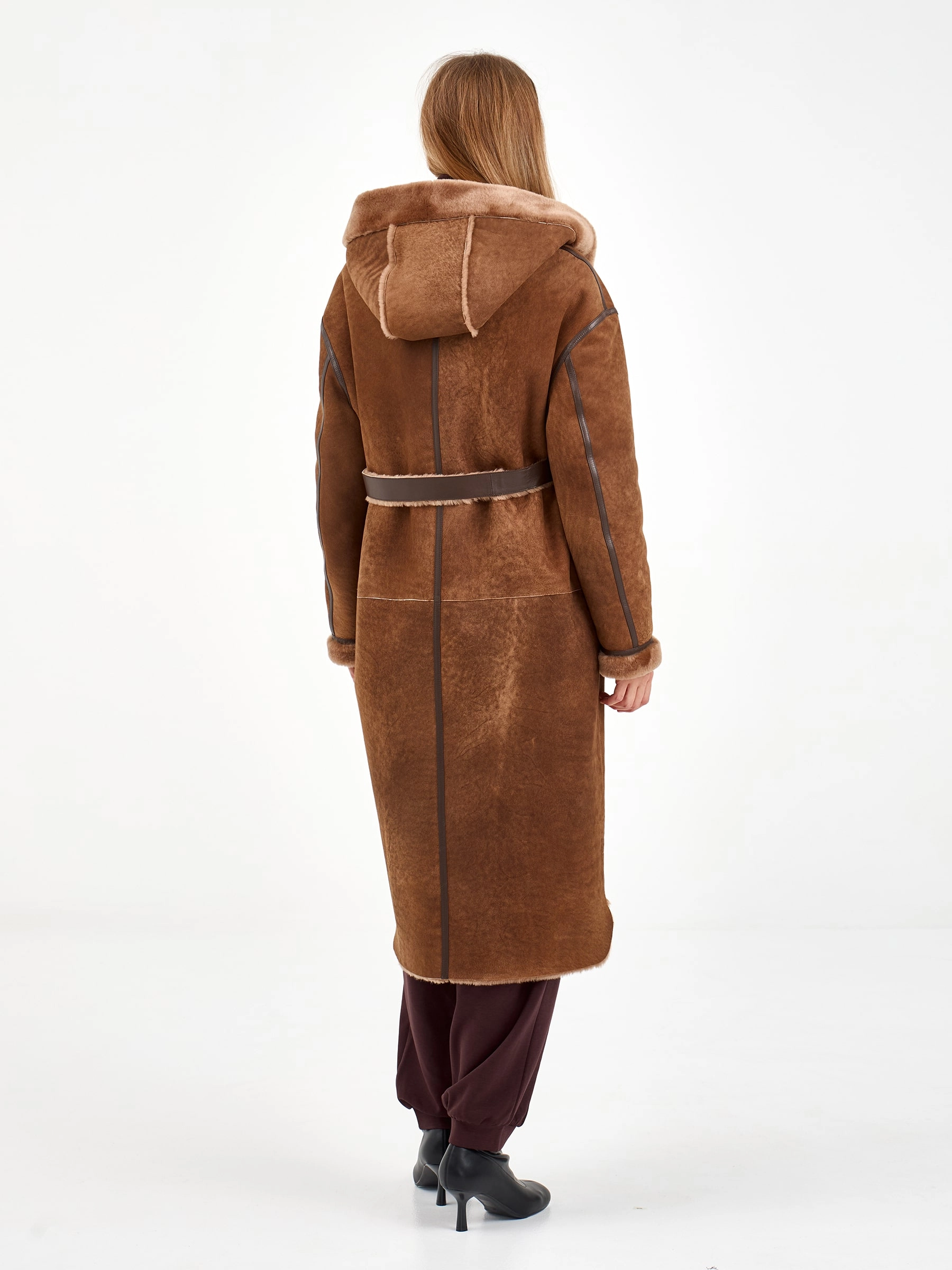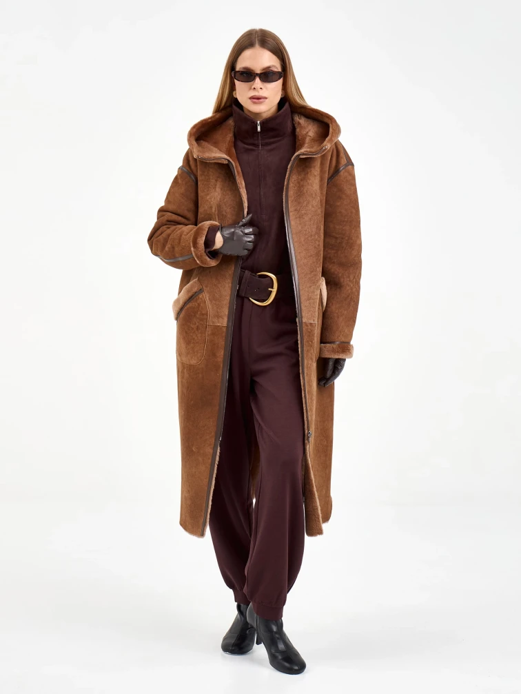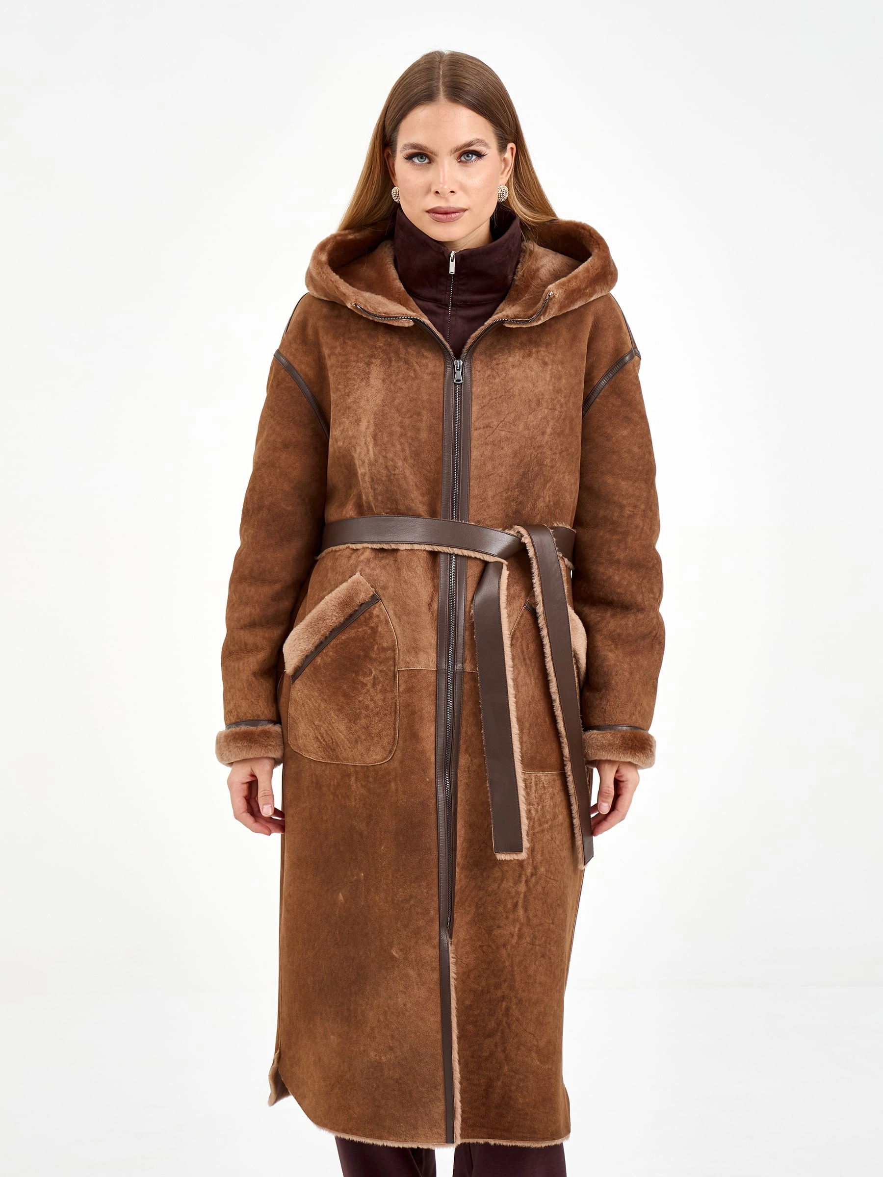 Длинная дубленка с капюшоном из элитной овчины мерино. Модель свободного кроя длиной 115 см с несъемным капюшоном и спущенным рукавом создает элегантный повседневный образ. Дополнена длинным поясом для регулирования силуэта, меховой опушкой капюшона и стильными кожаными кантами. Стилисты рекомендуют носить с объемными свитерами, удлиненными платьями и высокими сапогами — такой ансамбль подчеркнет вашу элегантность и подарит ощущение комфорта в холодные дни. Идеальное сочетание роскоши, тепла и непревзойденного стиля.
