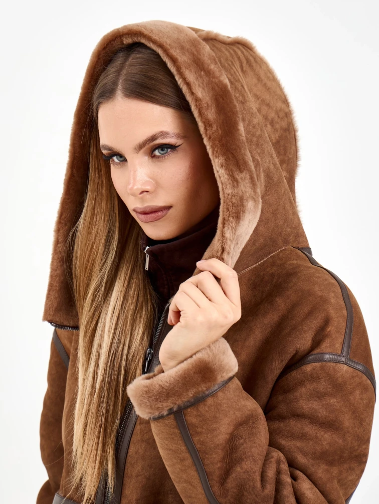 Длинная женская дубленка с капюшоном 2073, коричневая, размер 46, артикул 65240