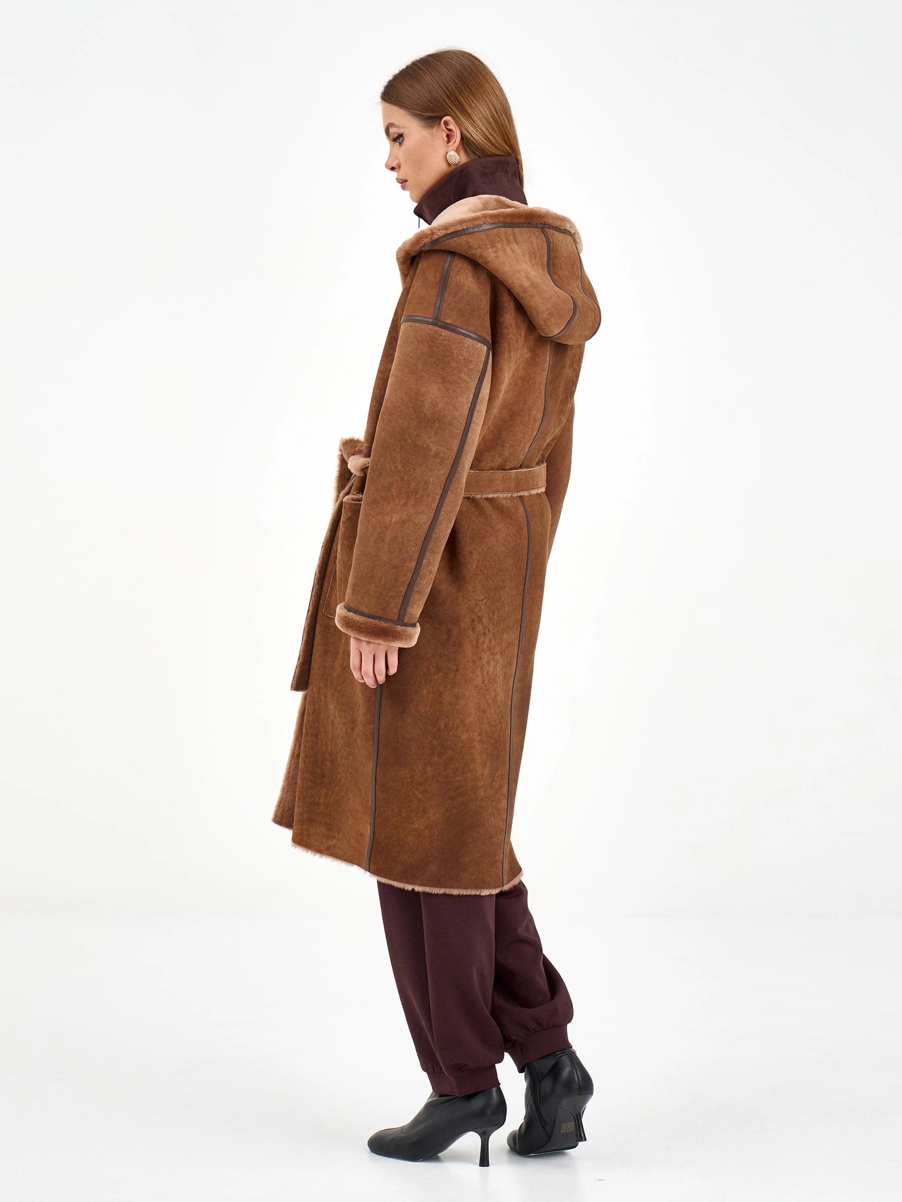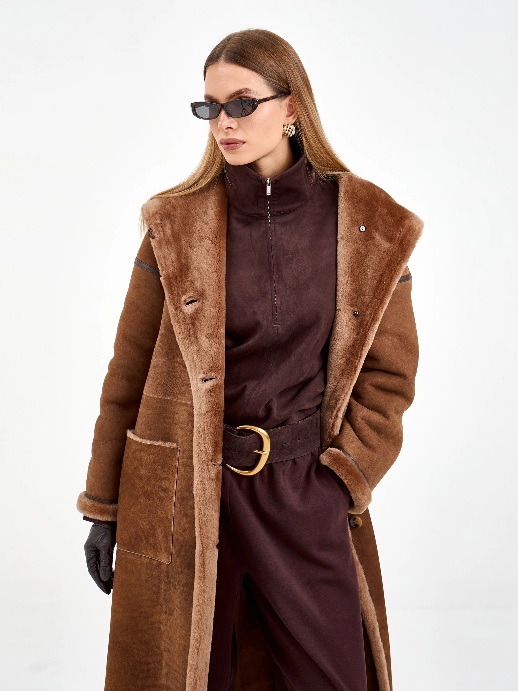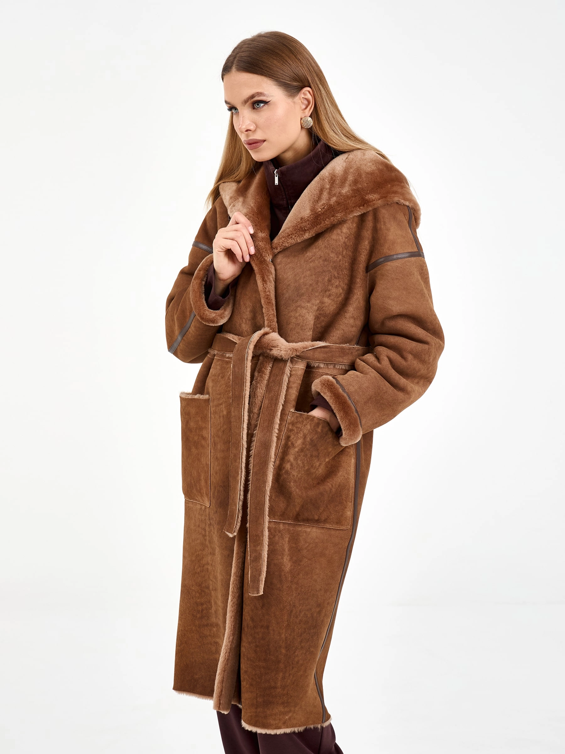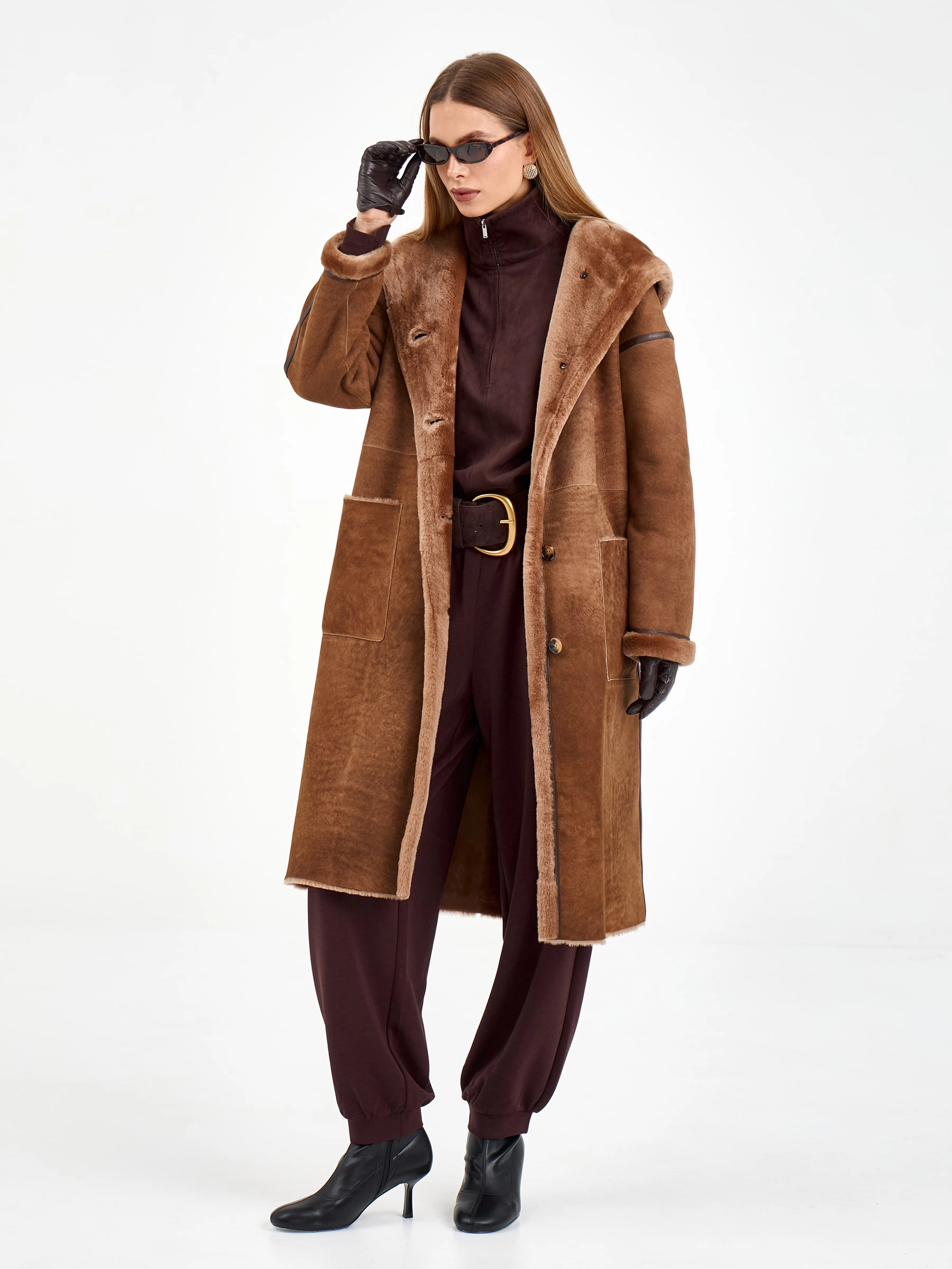 Эта модель создана для тех, кто ценит уют и стиль. Длинная дубленка из натуральной овчины мерино свободного кроя с глубоким капюшоном согреет и завершит любой образ. Детали, на которые стоит обратить внимание: изящный кожаный кант по линиям кроя и практичные накладные боковые карманы. Расслабленный силуэт и спущенный рукав создают ощущение непринужденной элегантности. Стилисты рекомендуют носить ее с объемным свитером, прямыми джинсами и ботинками челси для создания модного повседневного лука с драйвом.