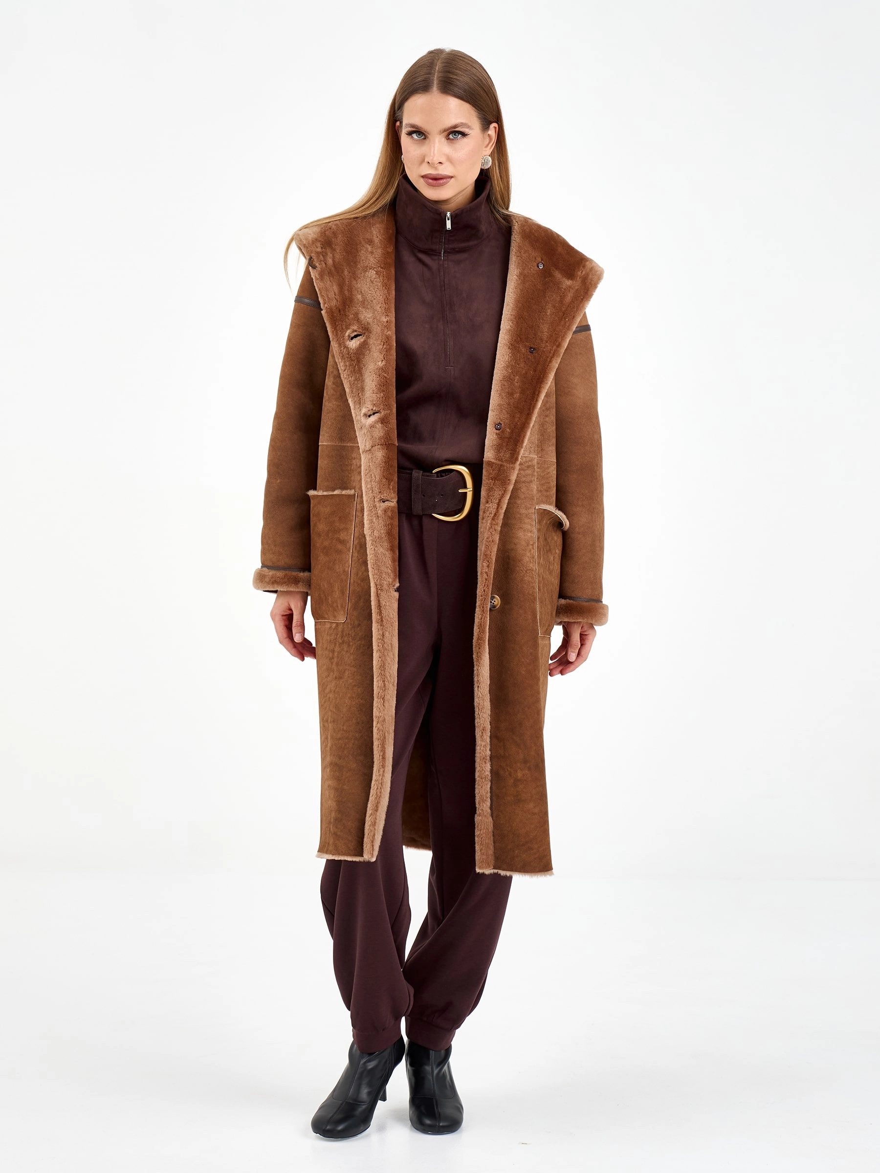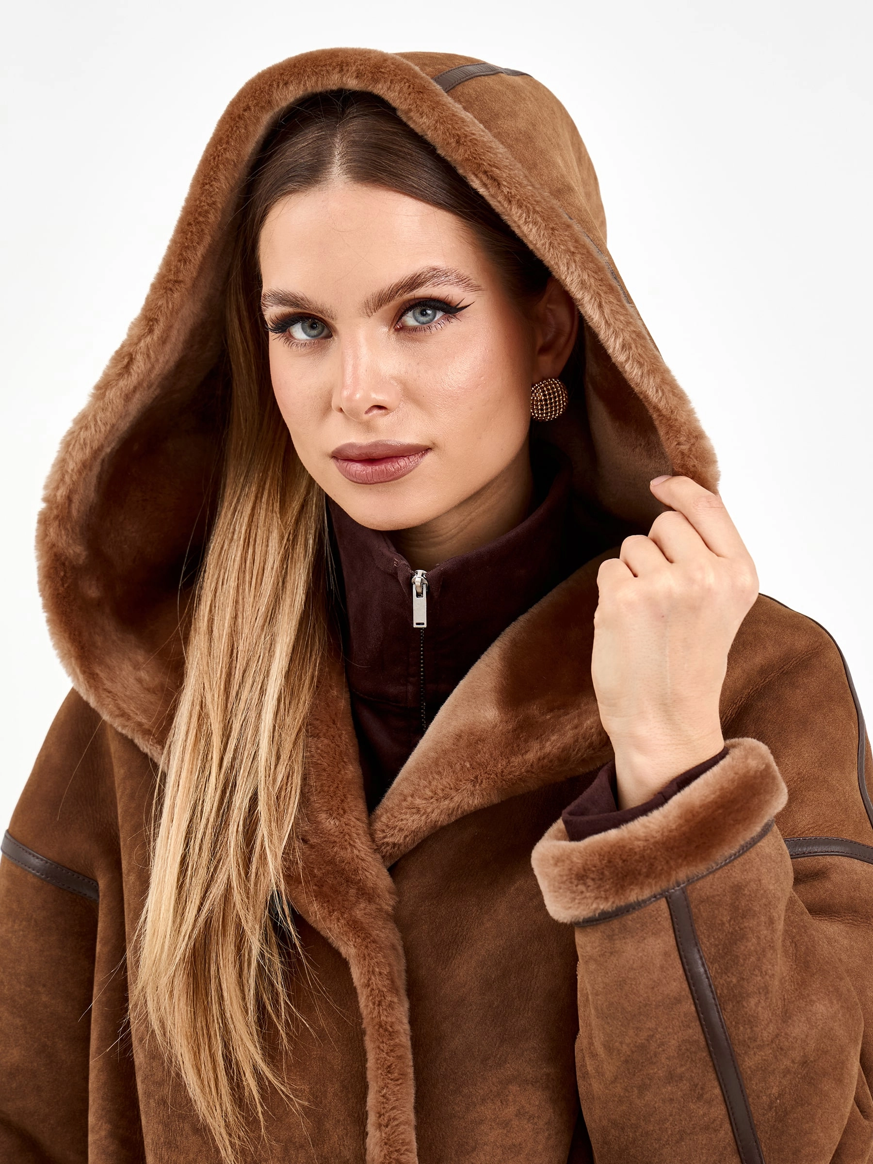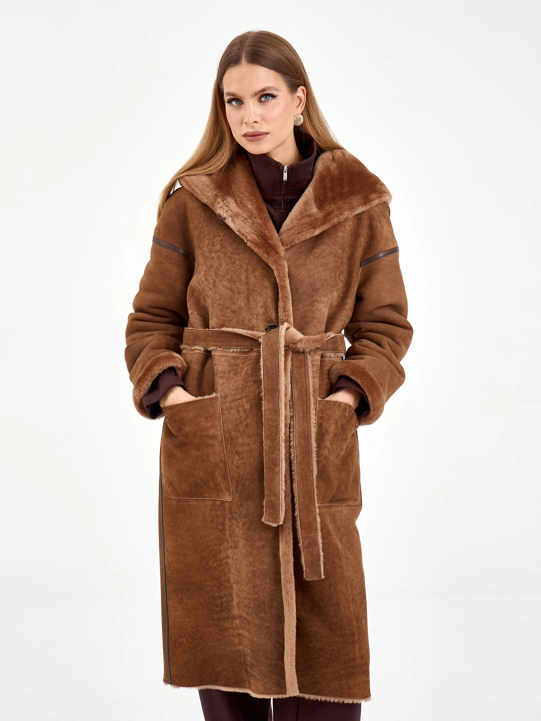 Длинная женская дубленка с капюшоном 2079, коричневая, размер 46, артикул 65120