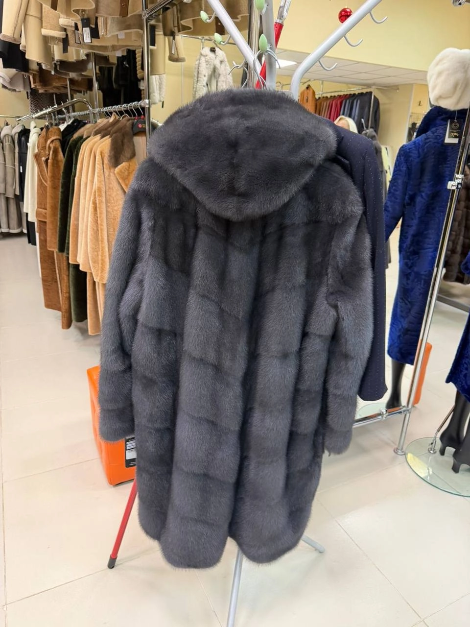 Товар длинная женская норковая шуба с капюшоном москвичка-132, графитовая, размер 52, артикул 65390 выполнен из мех норки с застежкой клипсы. Рассчитан на сезон: зима. Длина изделия 110 см, силуэт прямой.