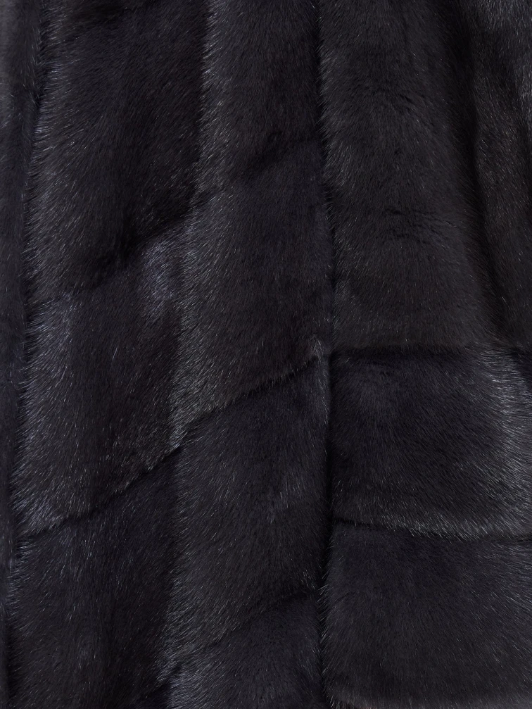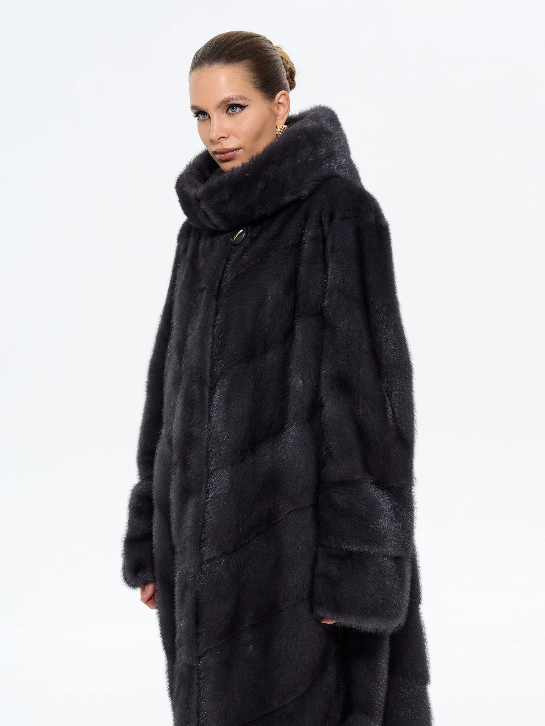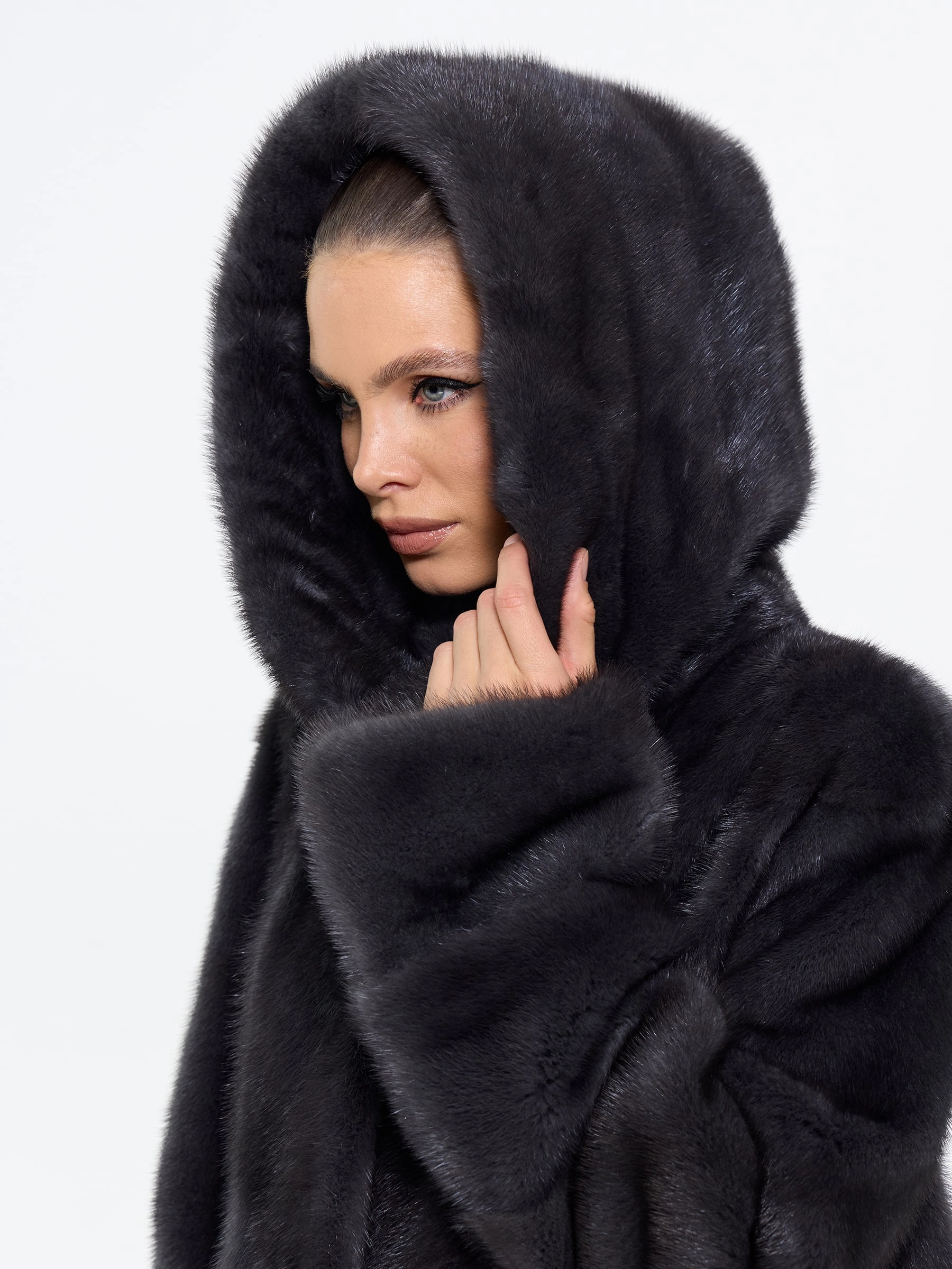Длинная женская норковая шуба с капюшоном Москвичка-132, черная, размер 52, артикул 65390