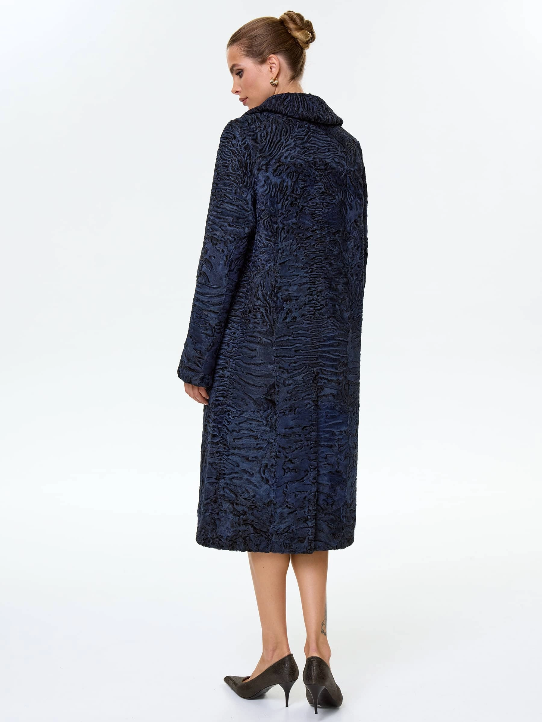 Товар длинная женская шуба из меха каракульчи премиум класса лола(ав), синяя, размер 48, артикул 34010 выполнен из каракульча с застежкой клипсы. Рассчитан на сезон: весна-осень. Длина изделия 118 см, силуэт прямой.