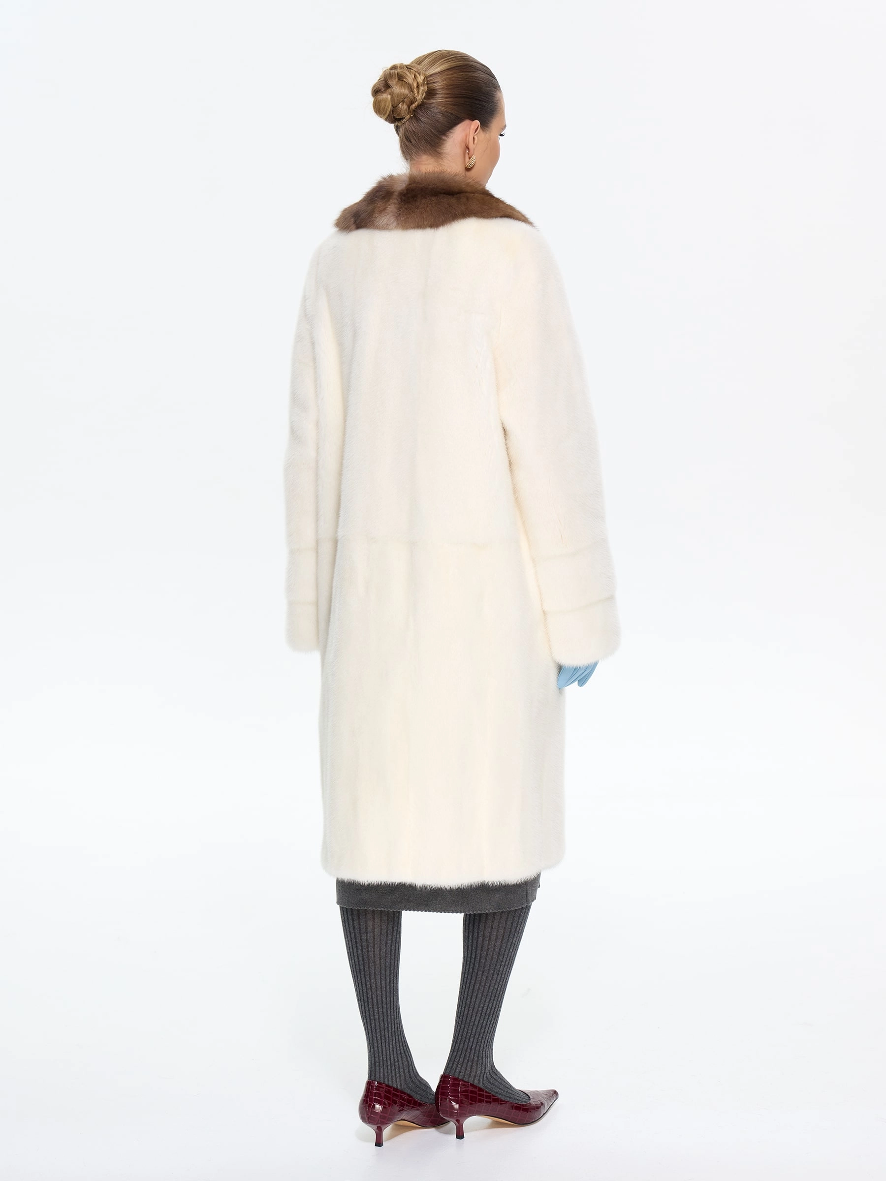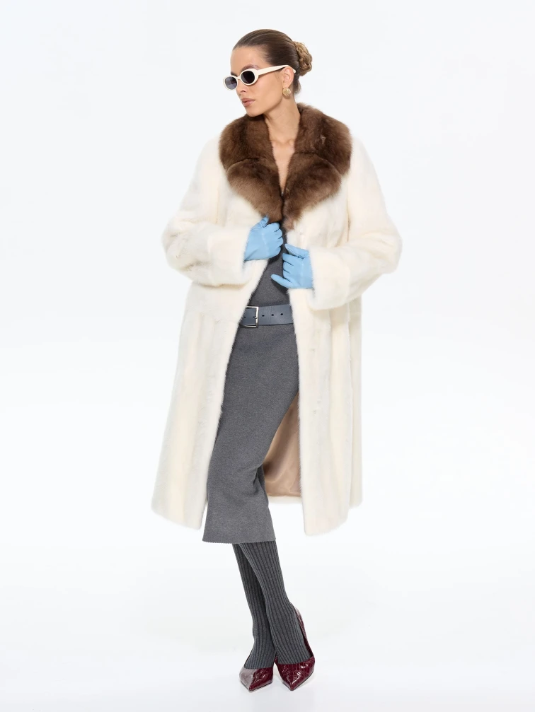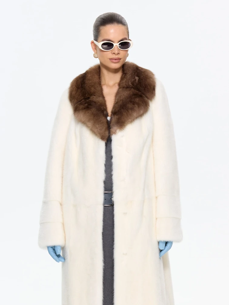 Изысканная длинная шуба из меха норки премиум-класса в белоснежном оттенке с элегантным английским воротником, отделанным ценным мехом соболя. Прямой силуэт длиной 108 см создает стройный вертикальный силуэт, подчеркивая аристократическую элегантность и зимний шарм. Стилисты рекомендуют носить эту модель с кожаными перчатками и сапогами до колена, дополнив сумочкой-портфелем, или с вязаной шапкой и утепленными ботильонами для повседневного образа. Белоснежная шуба из качественной норки с соболиной отделкой станет жемчужиной вашего гардероба, подчеркивая безупречный вкус в любой ситуации.