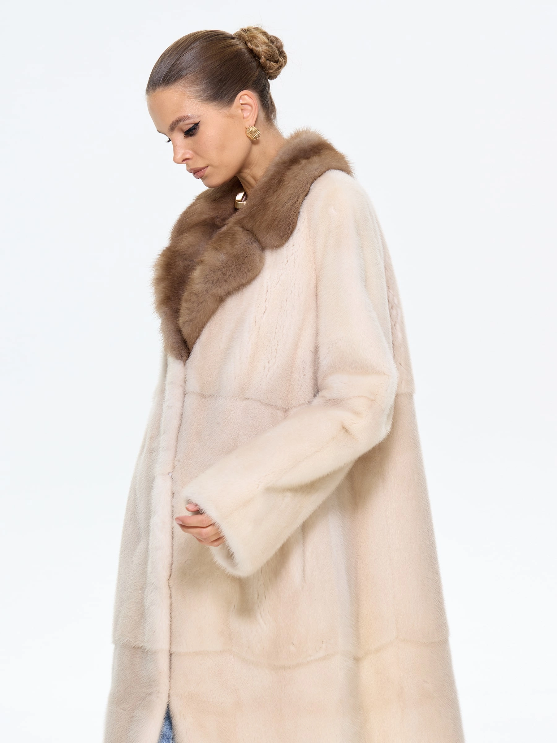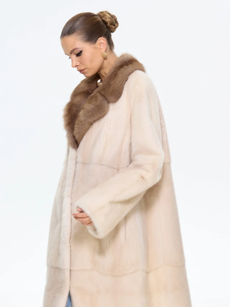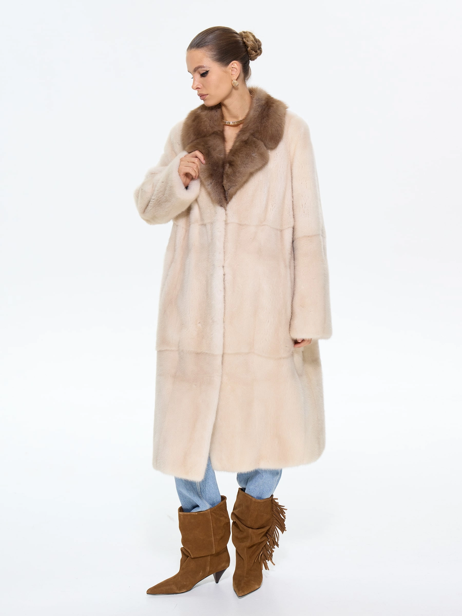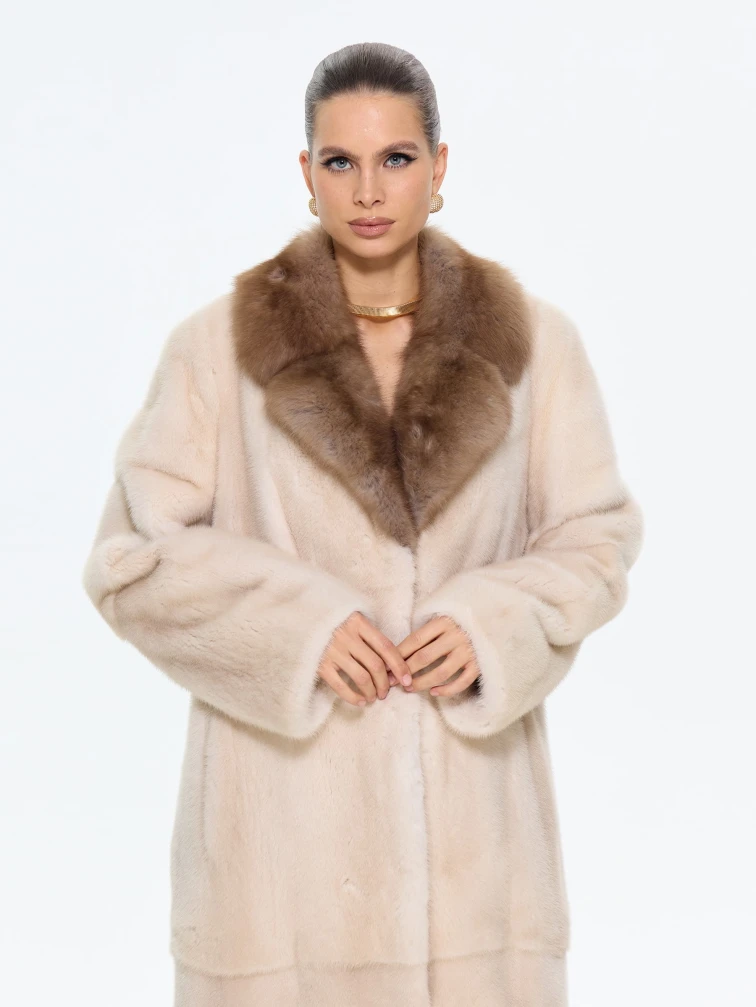 Изысканная длинная шуба из меха норки премиум-класса в белоснежном оттенке с элегантным английским воротником, отделанным ценным мехом соболя. Прямой силуэт длиной 108 см создает стройный вертикальный силуэт, подчеркивая аристократическую элегантность и зимний шарм. Стилисты рекомендуют носить эту модель с кожаными перчатками и сапогами до колена, дополнив сумочкой-портфелем, или с вязаной шапкой и утепленными ботильонами для повседневного образа. Белоснежная шуба из качественной норки с соболиной отделкой станет жемчужиной вашего гардероба, подчеркивая безупречный вкус в любой ситуации.