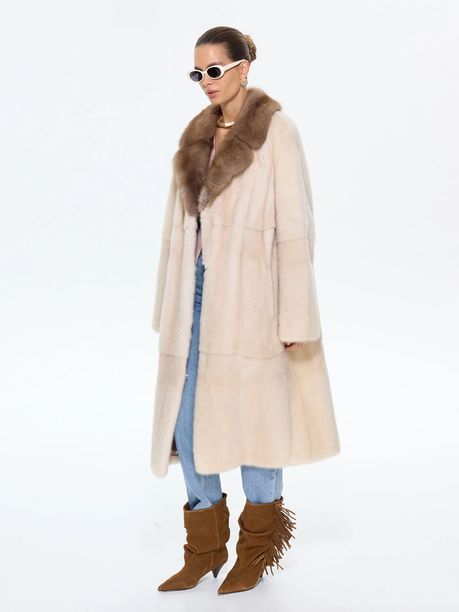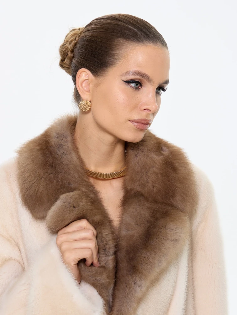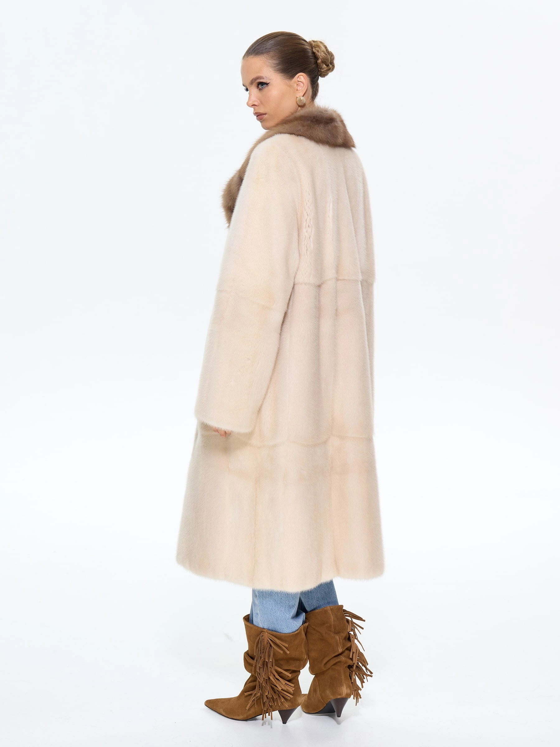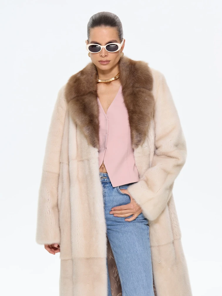 Изысканная длинная шуба из меха норки премиум-класса в белоснежном оттенке с элегантным английским воротником, отделанным ценным мехом соболя. Прямой силуэт длиной 108 см создает стройный вертикальный силуэт, подчеркивая аристократическую элегантность и зимний шарм. Стилисты рекомендуют носить эту модель с кожаными перчатками и сапогами до колена, дополнив сумочкой-портфелем, или с вязаной шапкой и утепленными ботильонами для повседневного образа. Белоснежная шуба из качественной норки с соболиной отделкой станет жемчужиной вашего гардероба, подчеркивая безупречный вкус в любой ситуации.