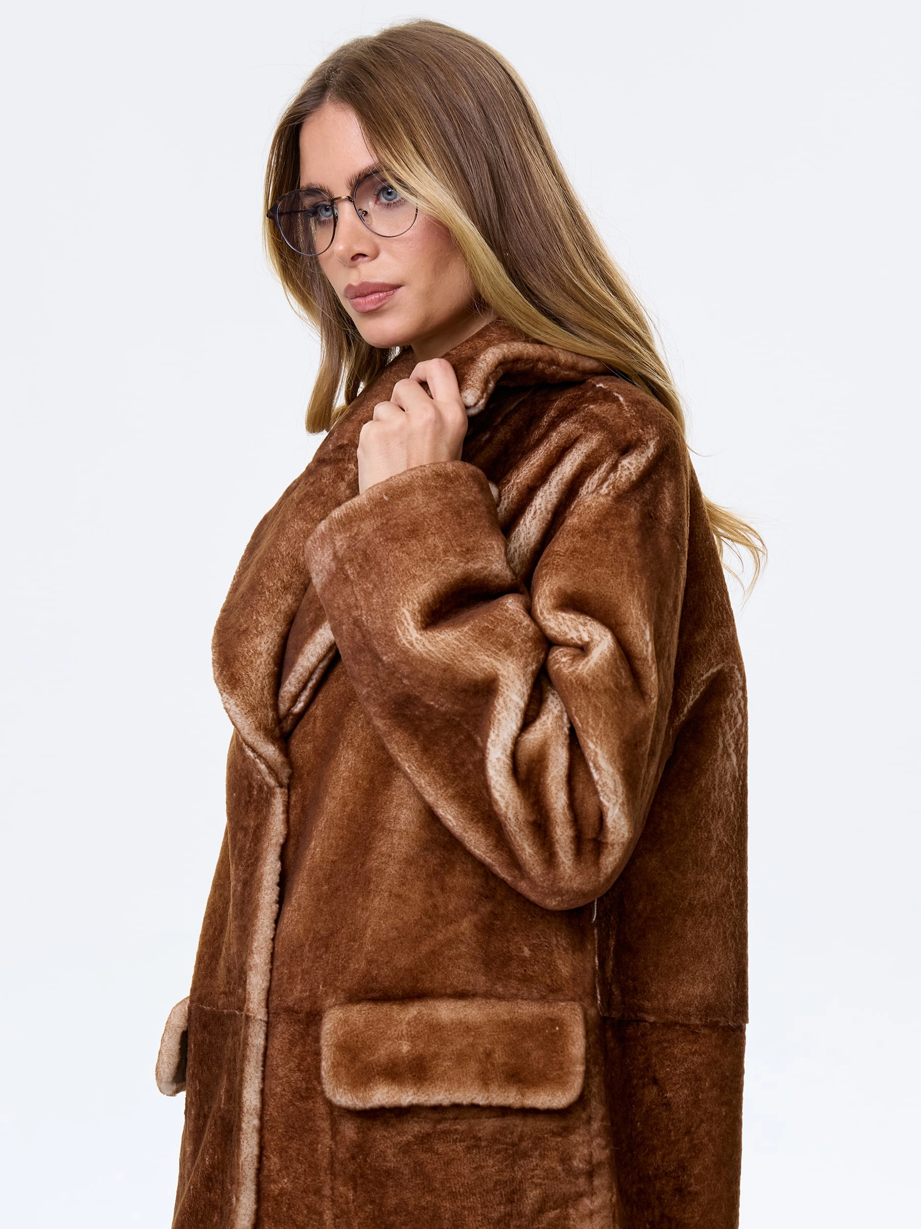 Сдержанное и одновременно стильное пальто с английским воротником и широкими лацканами выполнили из мягкой овчины. Прямой крой изделия обеспечивает комфортную посадку по фигуре и не ограничивает движения. Модель дополнили большими накладными карманами закрывающиеся клапанами. Застежка - кнопки.