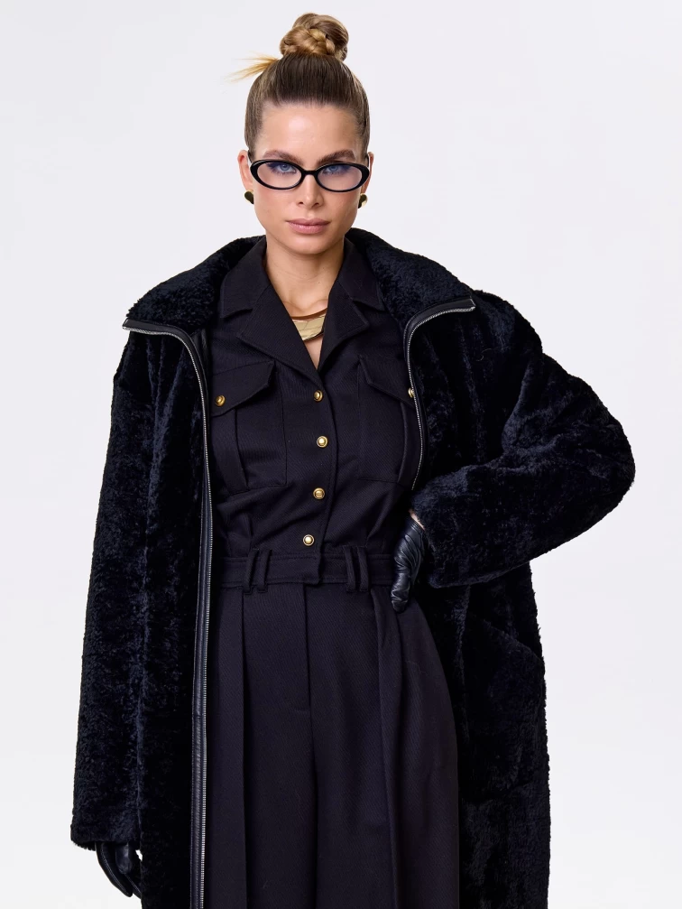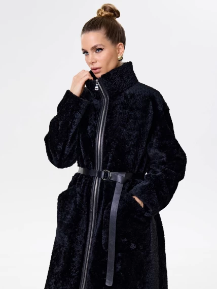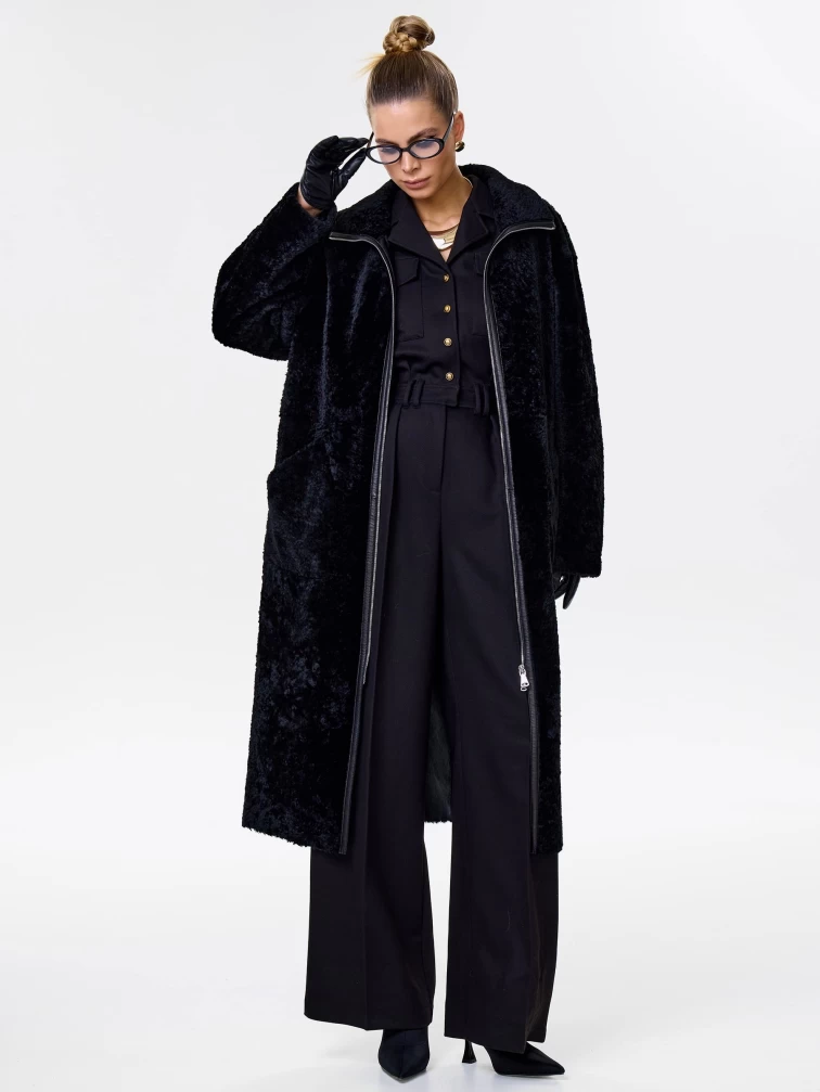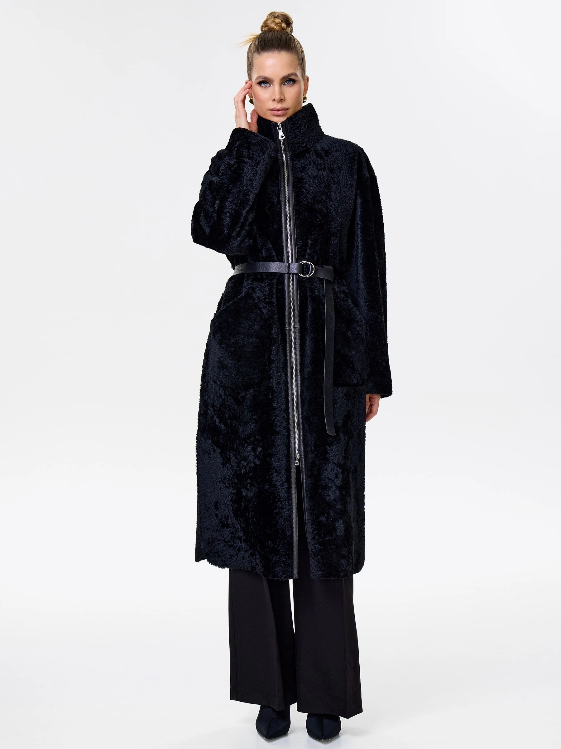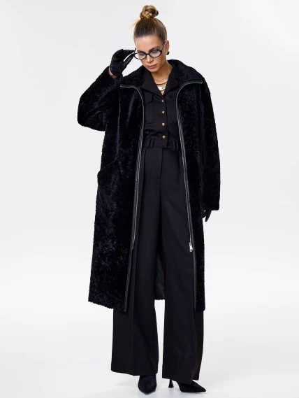 Товар длинное женское пальто из натуральной овчины астрагана премиум класса 2060, черное, размер 44, артикул 64320 выполнен из овчина "мерино" с застежкой молния. Рассчитан на сезон: осень-зима. Длина изделия 117 см, силуэт прямой.