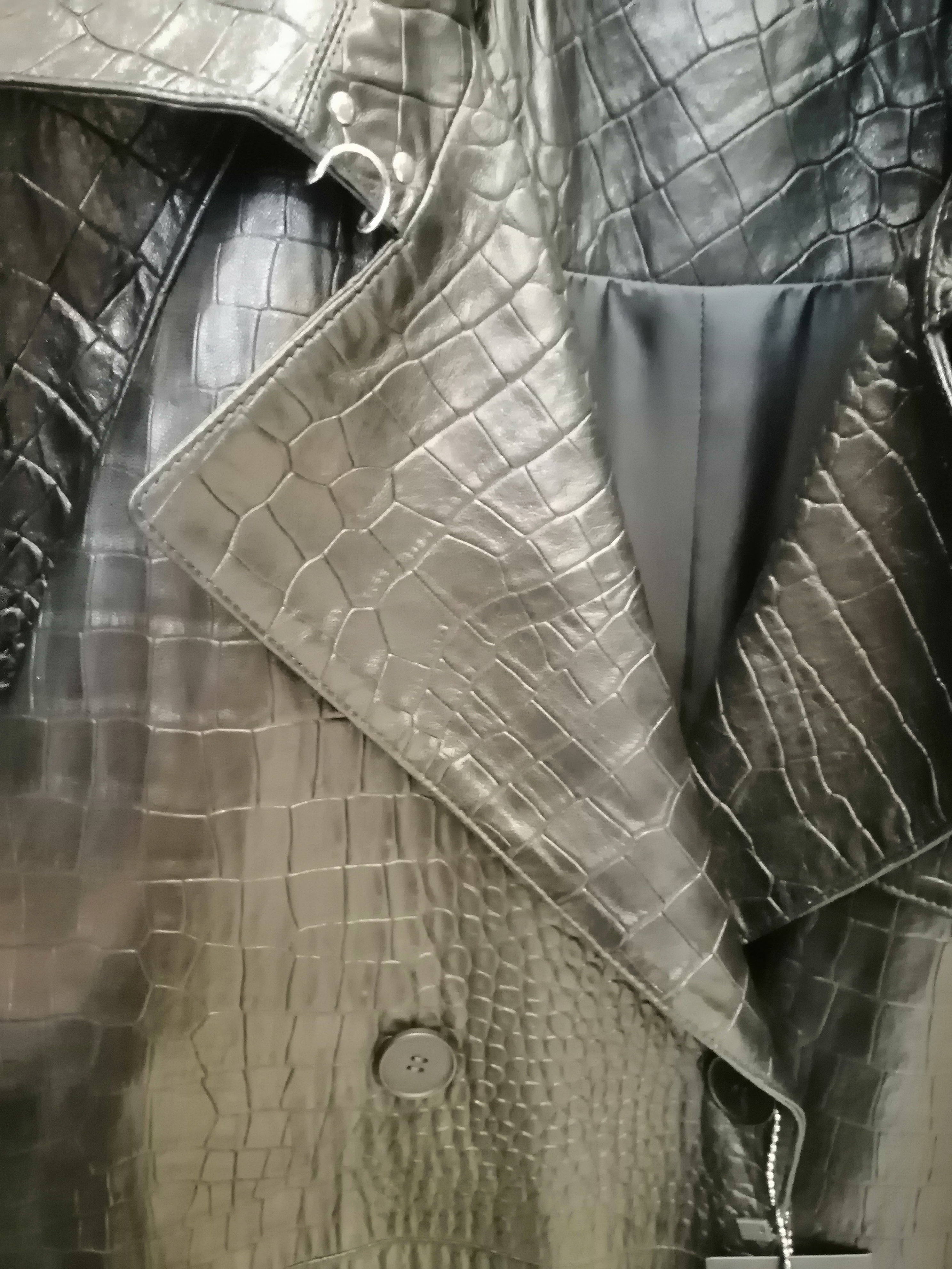 Товар длинный женский кожаный плащ с принтом под крокодила премиум класса 3071, черный, размер 54, артикул 23870 выполнен из натуральной кожи с застежкой пуговицы. Рассчитан на сезон: весна-осень. Длина изделия 120 см, силуэт свободный.