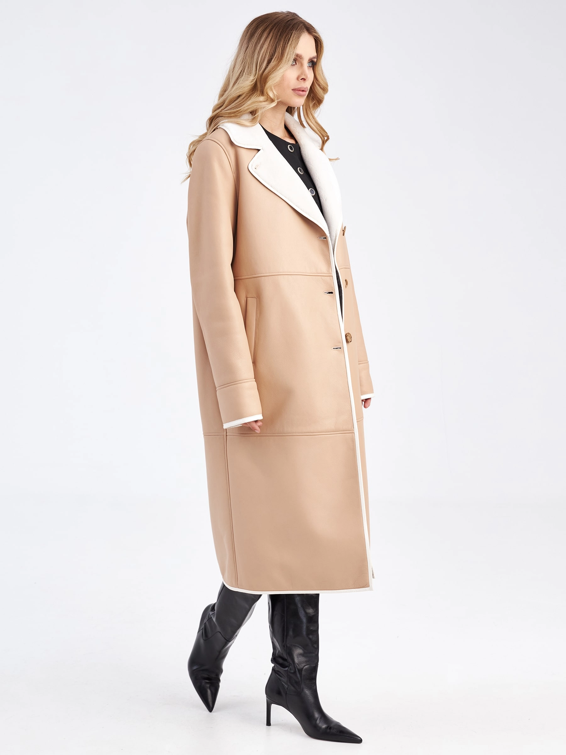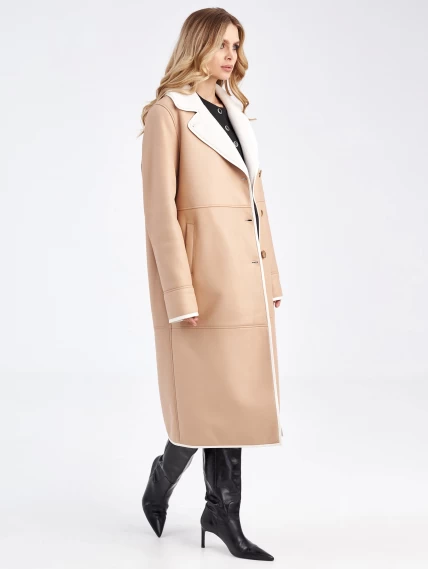 Длинная классическая дубленка премиум класса для женщин 2009н, бежевая, размер 46, артикул 63210