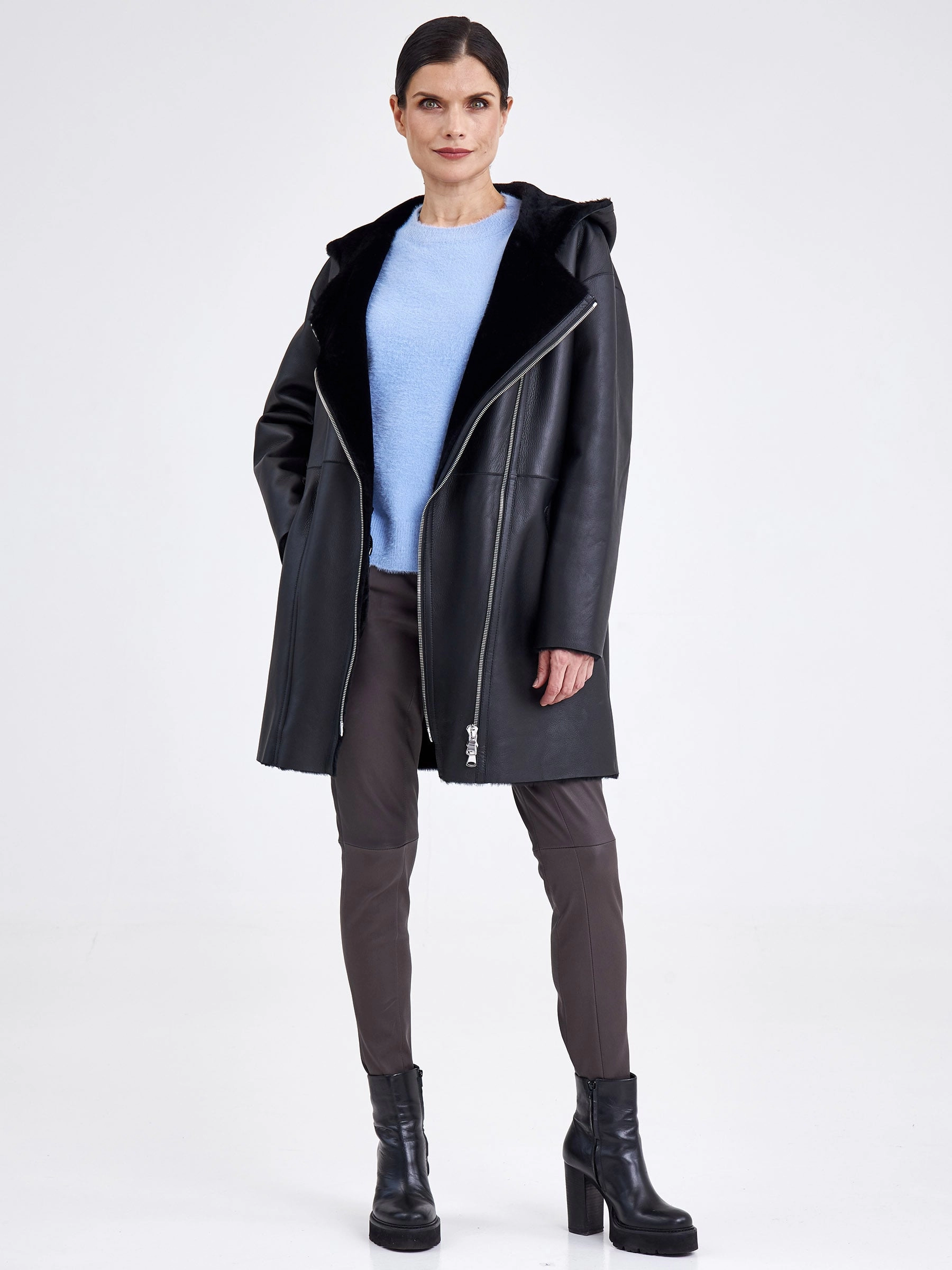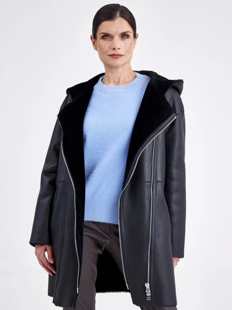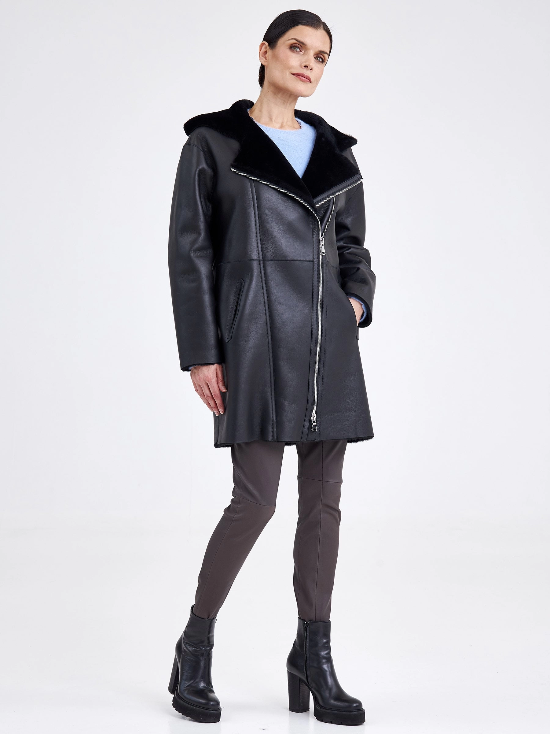 Товар двусторонняя женская дубленка косуха с капюшоном премиум класса 2012, черная, размер 44, артикул 62680 выполнен из овчина "мерино" с застежкой молния. Рассчитан на сезон: осень-зима. Длина изделия 75-90 см, силуэт прямой.