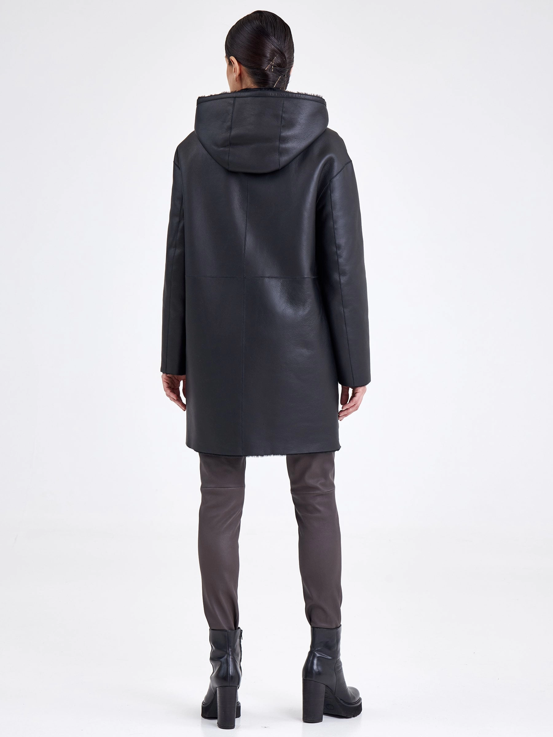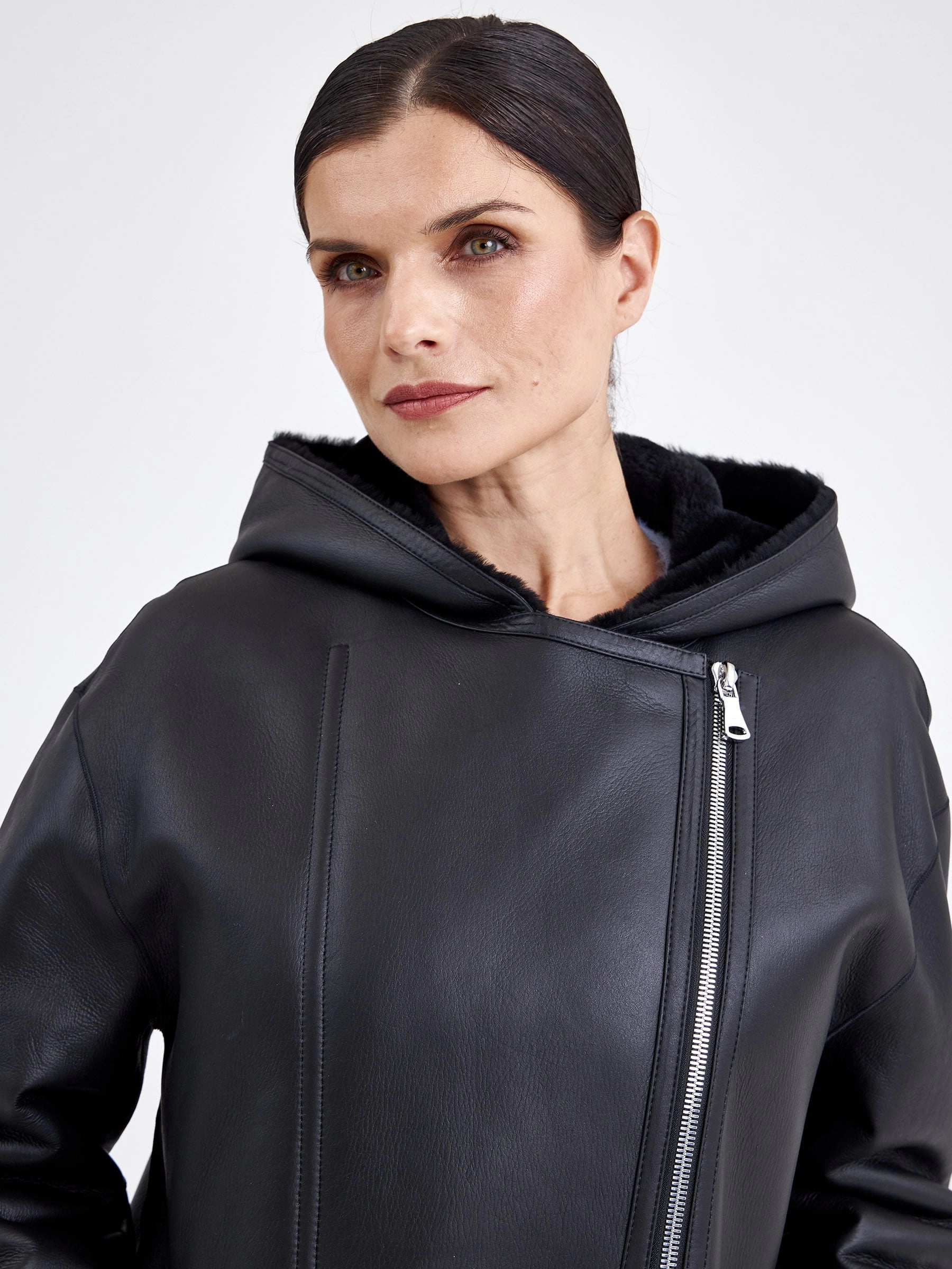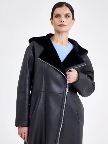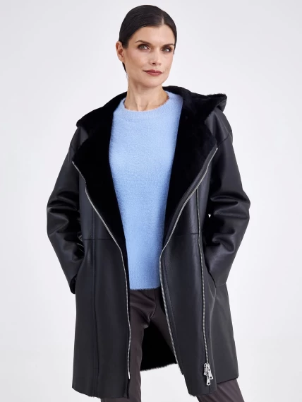 Двусторонняя женская дубленка косуха с капюшоном премиум класса 2012, черная, размер 44, артикул 62680