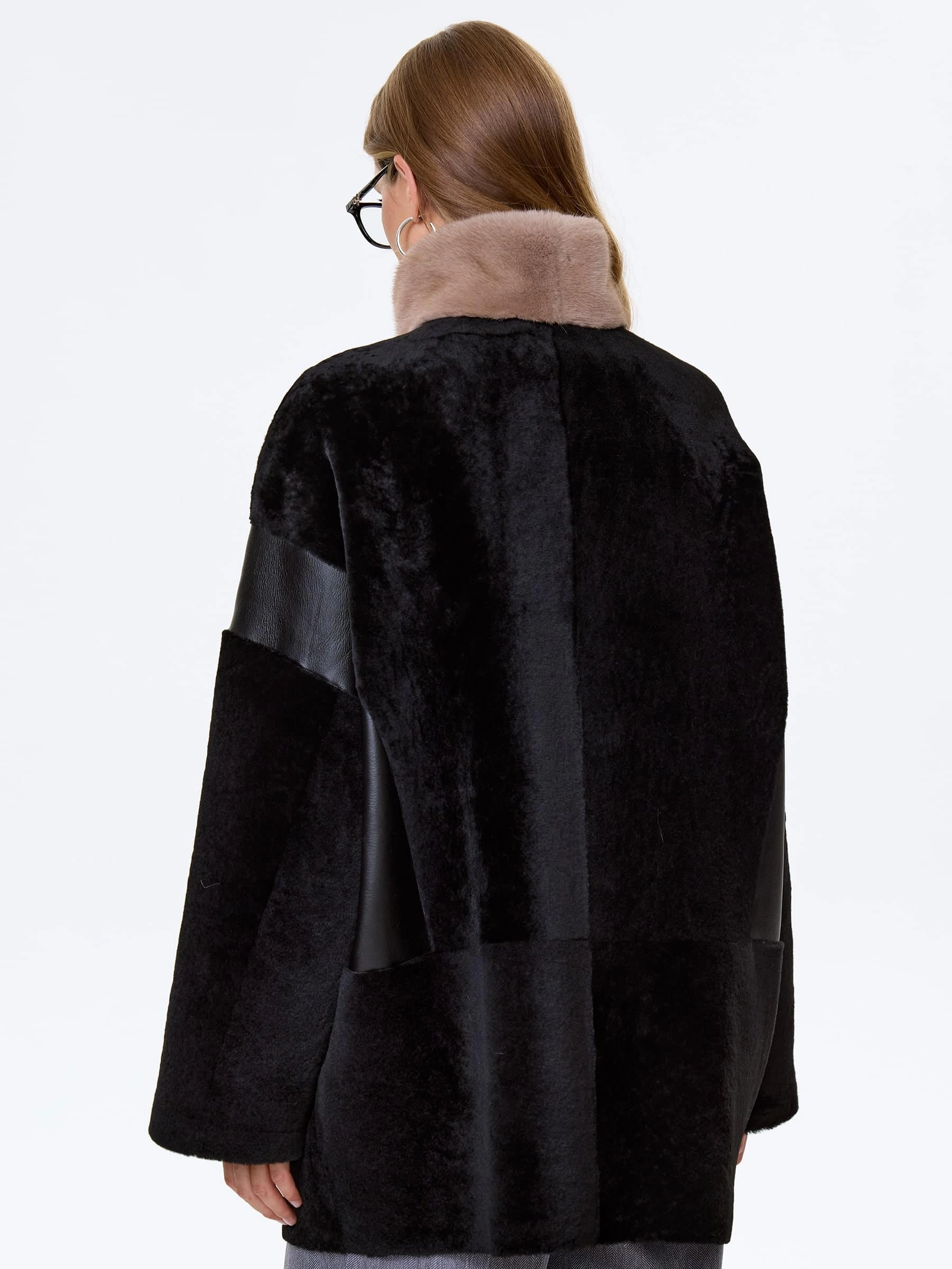 Для пошива короткой дубленки использовали нежную овчину в классическом черном цвете сочетании с гладкой стороной. Комфортный свободный крой не ограничивает движения. Боковые карманы как и само изделие застегиваются молниями. Объемный воротник - стойку дополнили густой норкой.