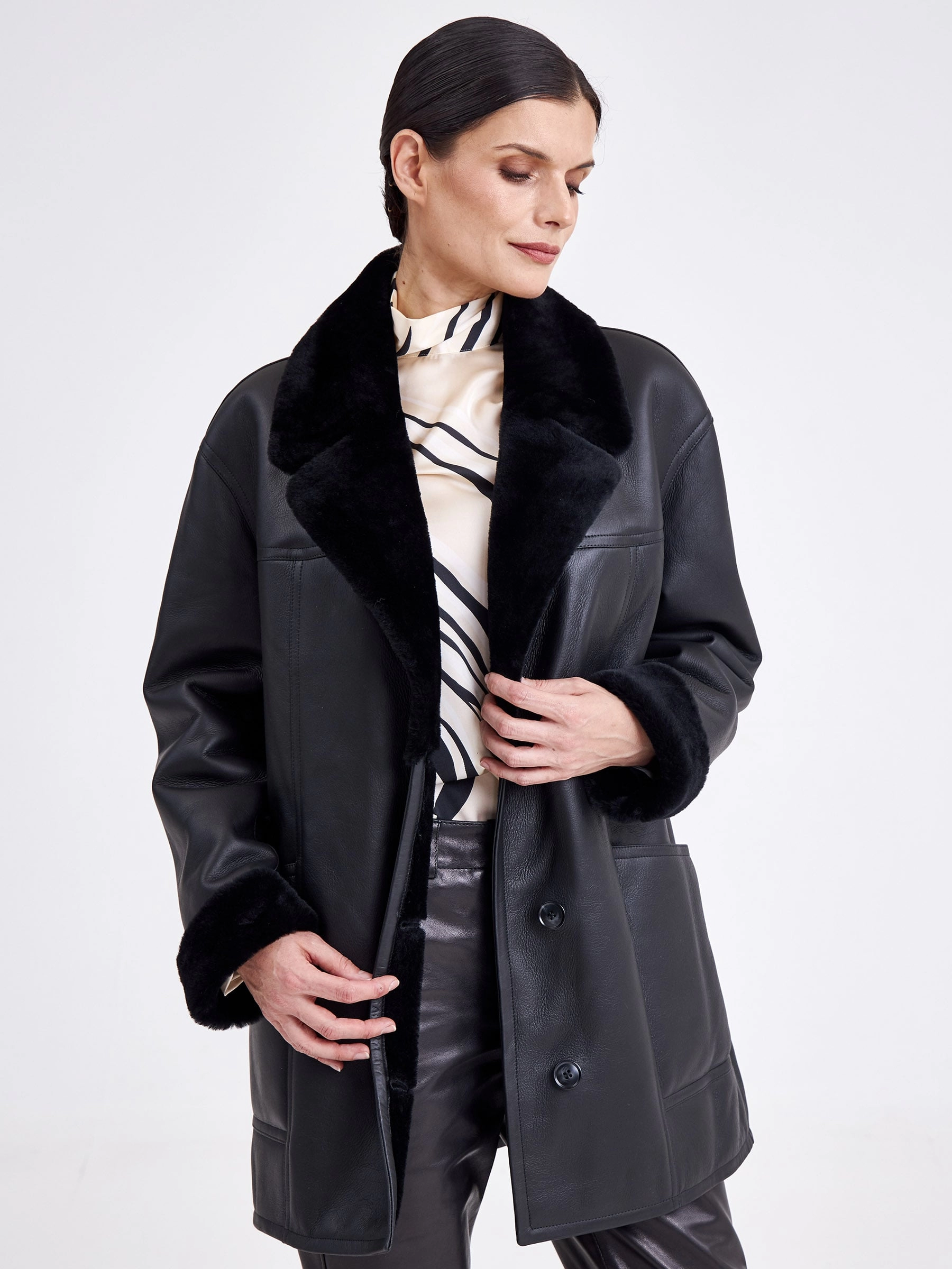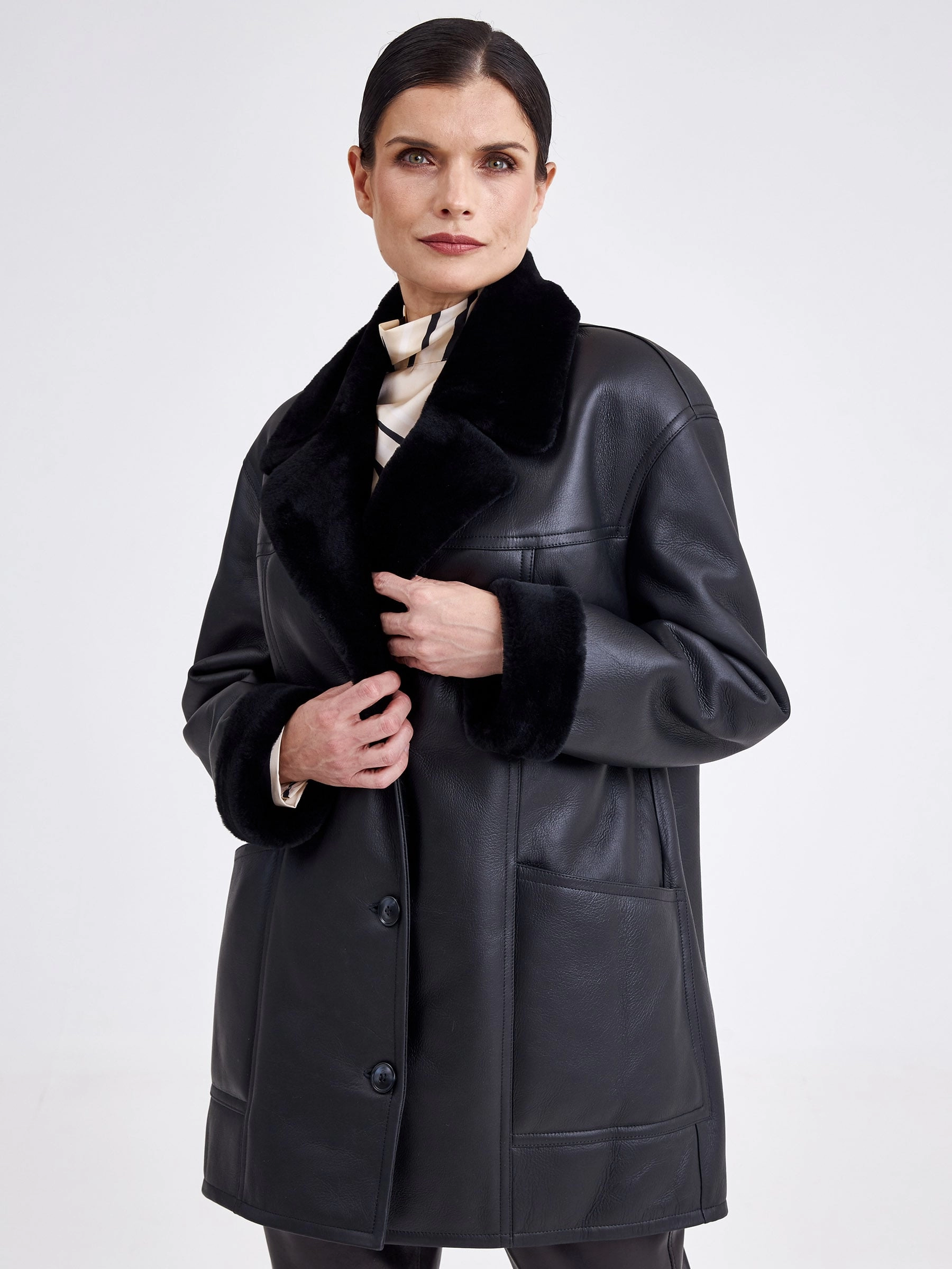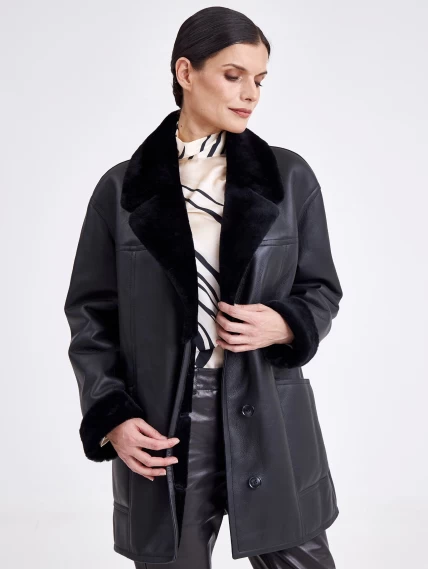 Безупречная элегантность и актуальная классика читается в этой модели. Изделие выполнили в универсальном черном цвете используя плотную овчину бережной выделки. Внутренняя сторона хорошо сохраняет тепло. Прямой крой, английский воротник, застежка-пуговицы.Завершили модель двумя большими карманами и широким поясом, который поможет изменить силуэт.