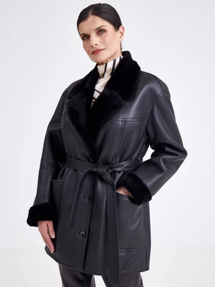 Товар короткая женская дубленка пиджак с поясом премиум класса 2011, черная, размер 48, артикул 62660 выполнен из овчина "мерино" с застежкой пуговицы. Рассчитан на сезон: осень-зима. Длина изделия 75-90 см, силуэт прямой.