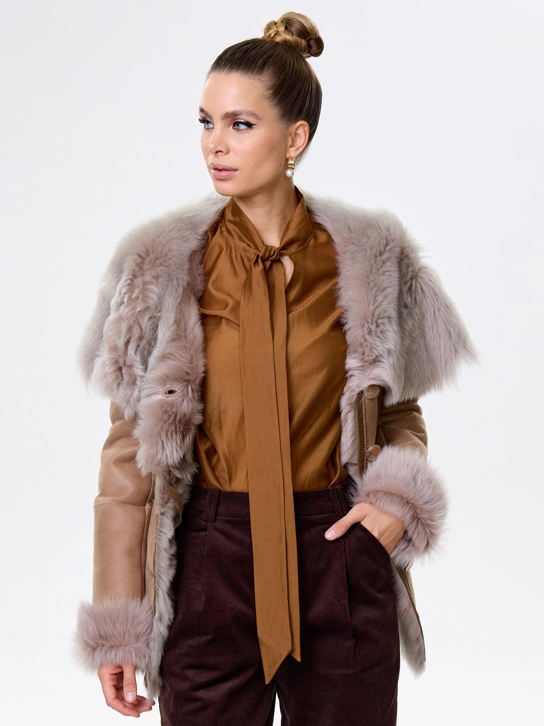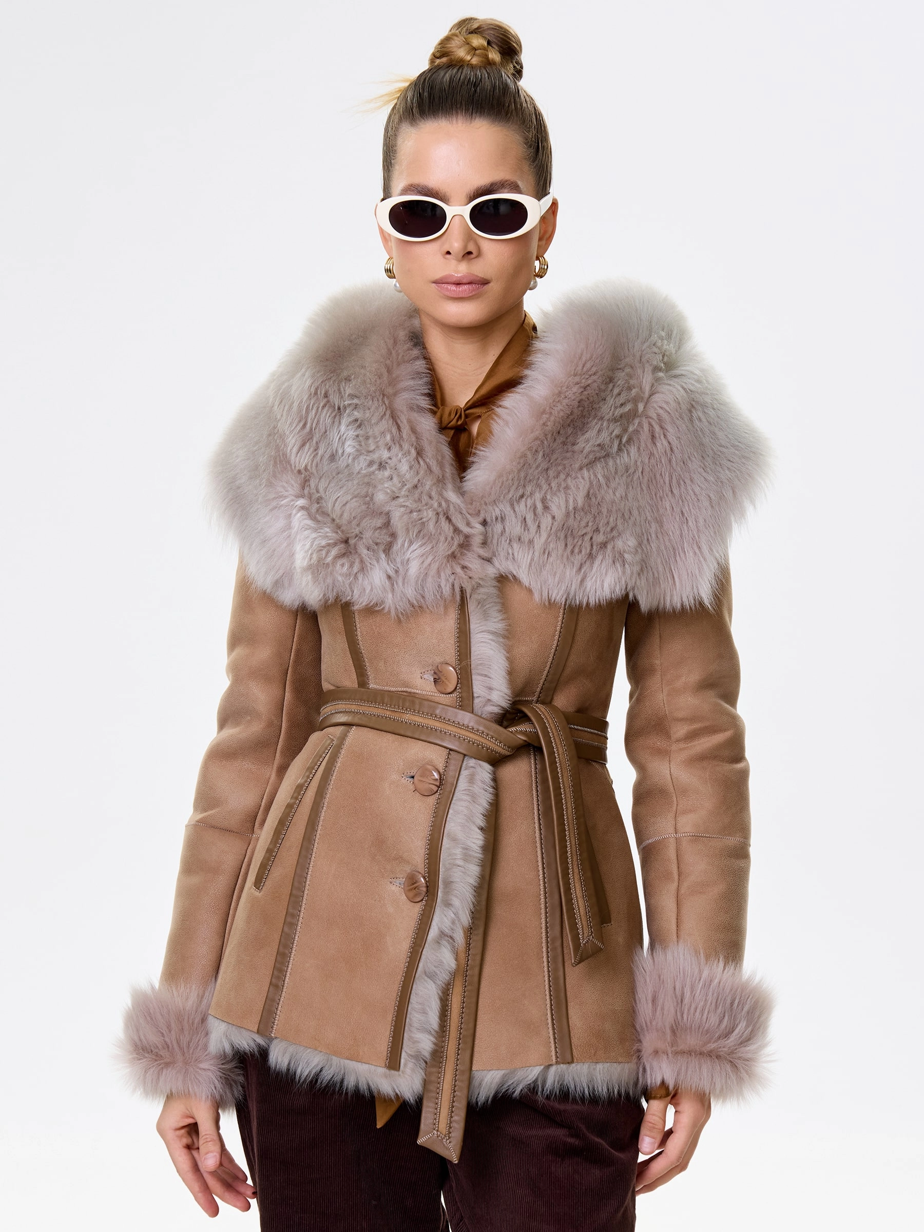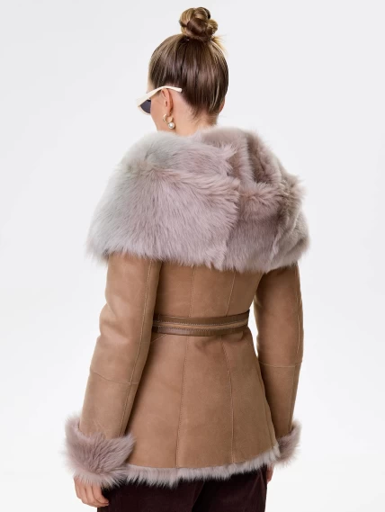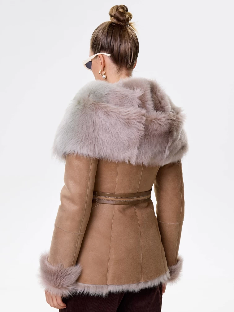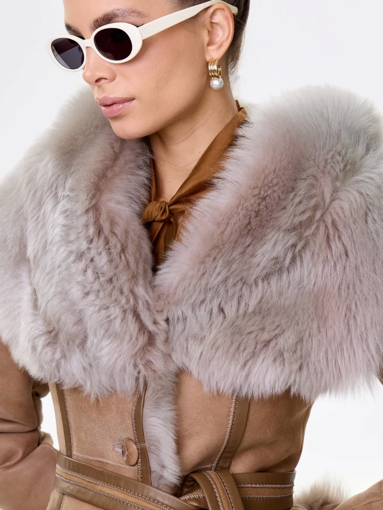 Идеальная полуприлегающая модель премиум-класса: невероятно густой мех тосканской овчины согреет в лютый мороз, а глубокий капюшон-трансформер эффектно завернёт вас в уют или элегантно ляжет шалью на плечи. Защитное покрытие убережёт от царапин, кожаная отделка карманов и борта добавит статусности, а регулируемые манжеты и боковые карманы обеспечат комфорт. Идеальная посадка по фигуре, продуманные швы и длинный пояс подчеркнут силуэт — сочетайте с джинсами, объёмными свитерами или тёмными платьями для дерзкого зимнего образа! Преимущество: короткая длина, полуприлегающий крой - это мобильность для города и элегантность для вечера.