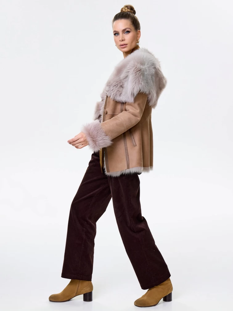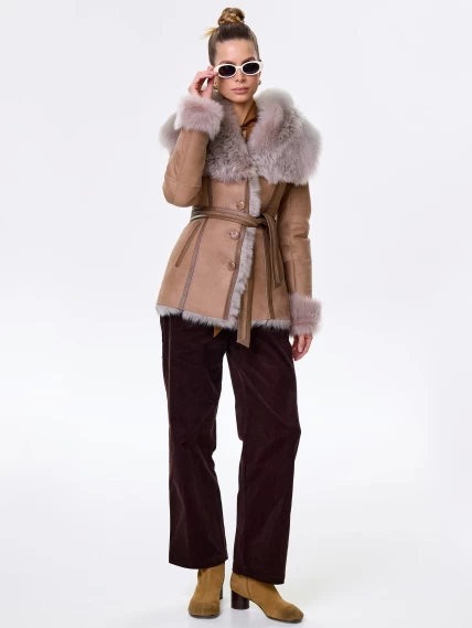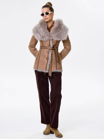 Короткая женская дубленка из тосканы с капюшоном 122, бежевая, размер 40, артикул 61451