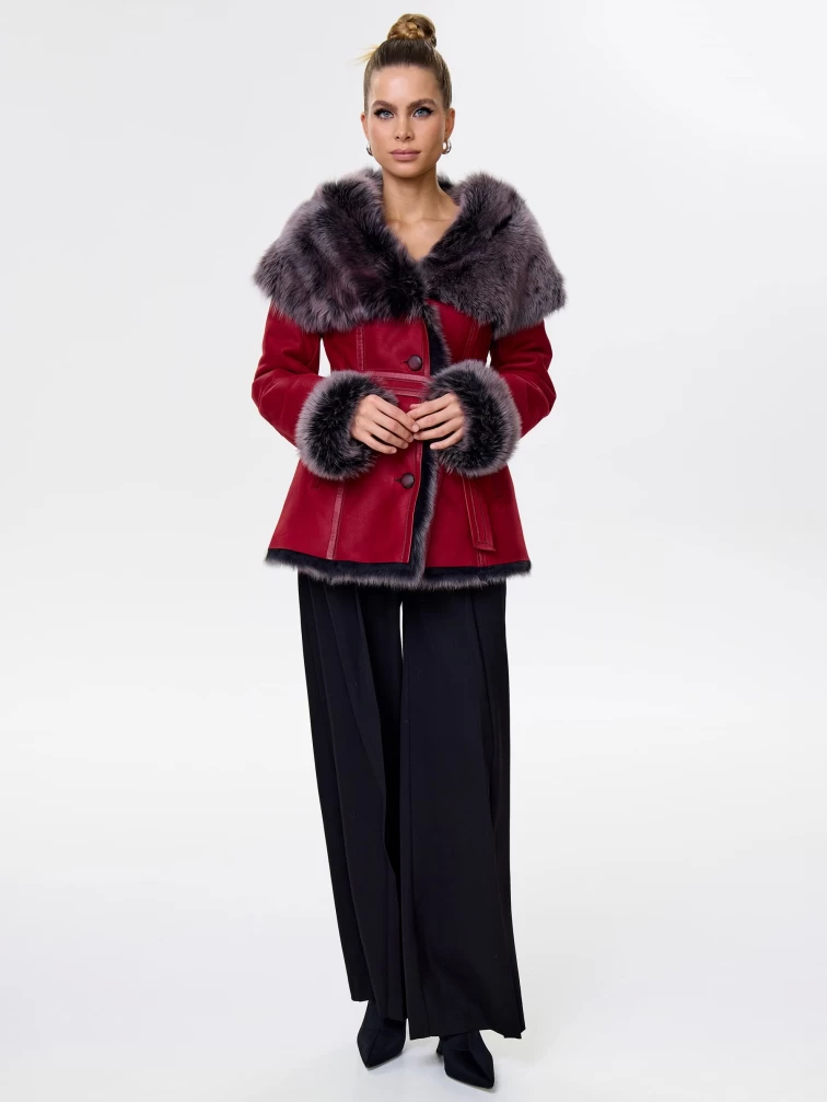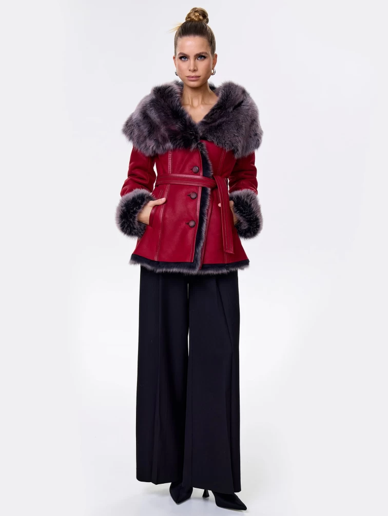 Идеальная полуприлегающая модель премиум-класса: невероятно густой мех тосканской овчины согреет в лютый мороз, а глубокий капюшон-трансформер эффектно завернёт вас в уют или элегантно ляжет шалью на плечи. Защитное покрытие убережёт от царапин, кожаная отделка карманов и борта добавит статусности, а регулируемые манжеты и боковые карманы обеспечат комфорт. Идеальная посадка по фигуре, продуманные швы и длинный пояс подчеркнут силуэт — сочетайте с джинсами, объёмными свитерами или тёмными платьями для дерзкого зимнего образа! Преимущество: короткая длина, полуприлегающий крой - это мобильность для города и элегантность для вечера.