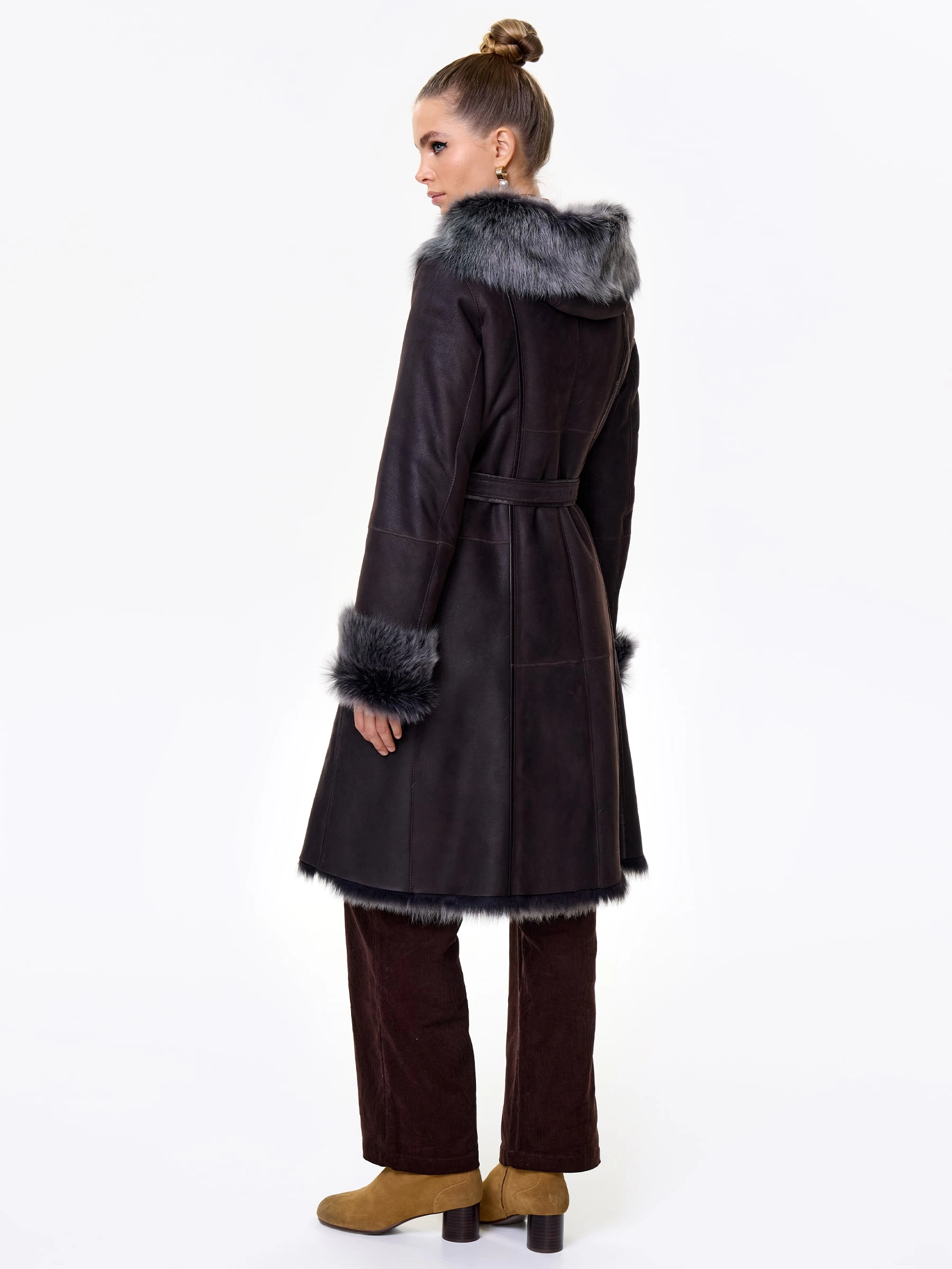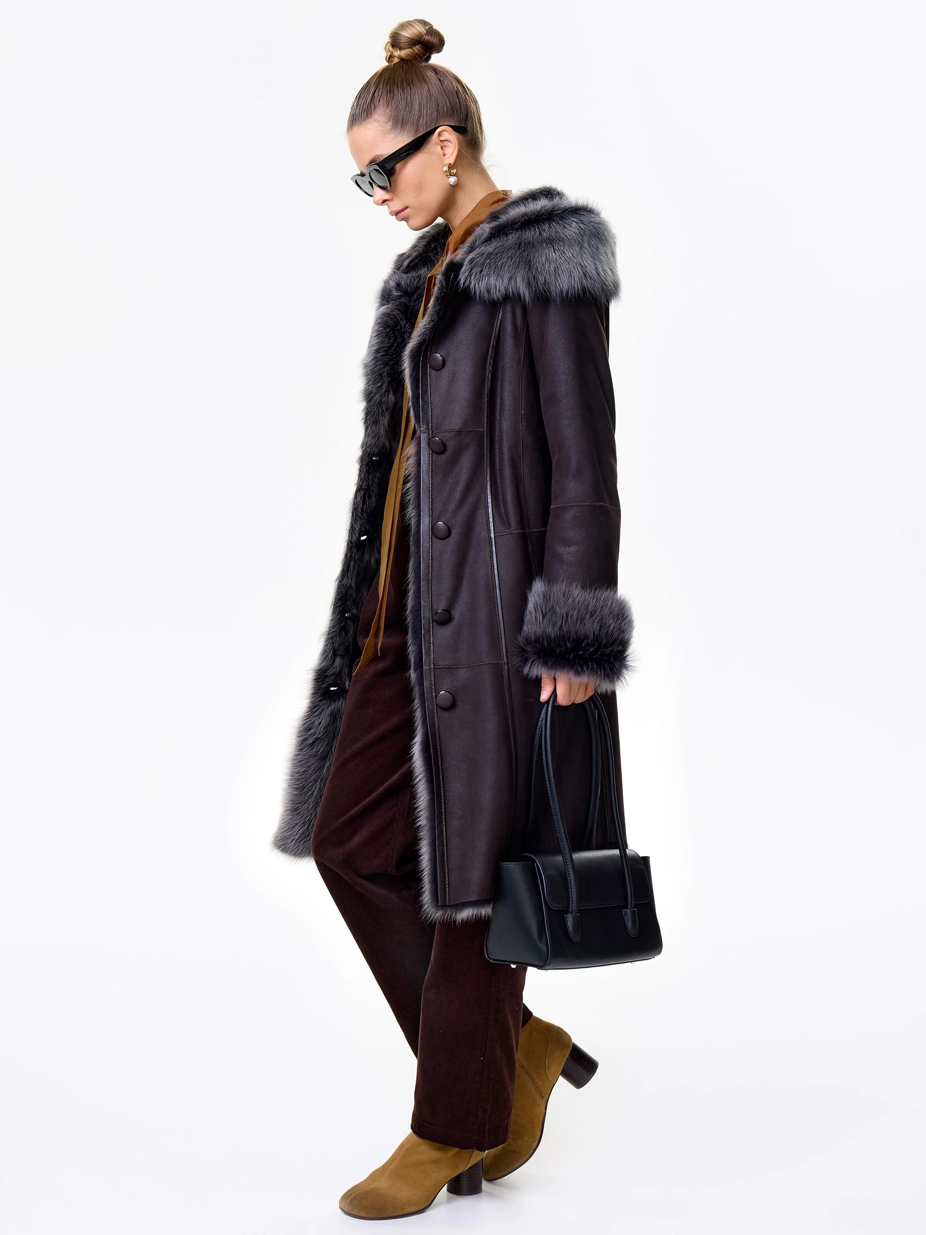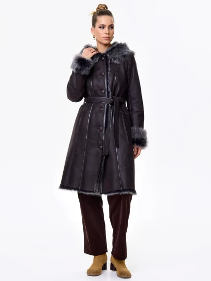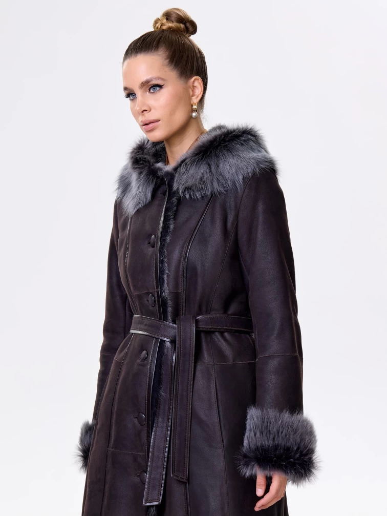 Длинная дублёнка с капюшоном из тосканской овчины. Роскошная полуприлегающая модель премиум-класса: густой нежнейший мех глубокого оттенк подарит королевское тепло даже в лютый мороз, а объёмный капюшон создаст уютный кокон от непогоды или элегантно ниспадет на плечи. Защитное покрытие убережёт от царапин, а идеальная посадка по фигуре, боковые карманы и длинный пояс подчеркнут силуэт — сочетайте с чёрными джинсами, вязаными платьями или кожаными брюками для безупречного зимнего образа! Преимущество: короткая длина, полуприлегающий крой - это мобильность для города и элегантность для вечера.