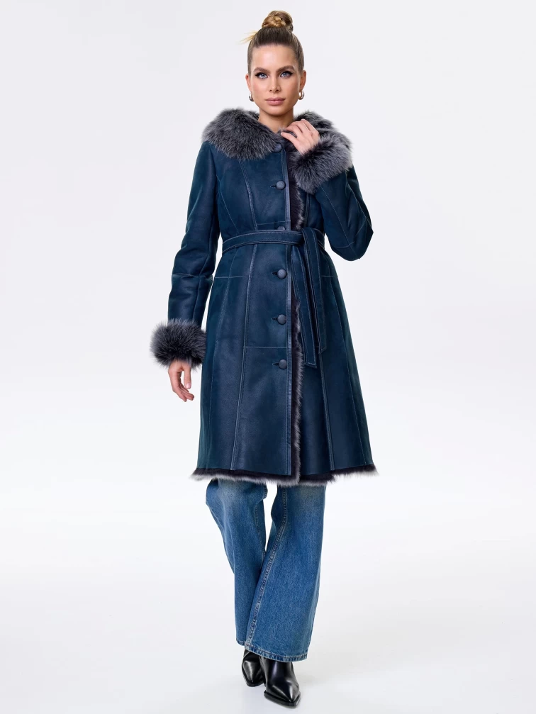 Длинная женская дубленка из тосканы с капюшоном 123нк, синяя, размер 40, артикул 61913