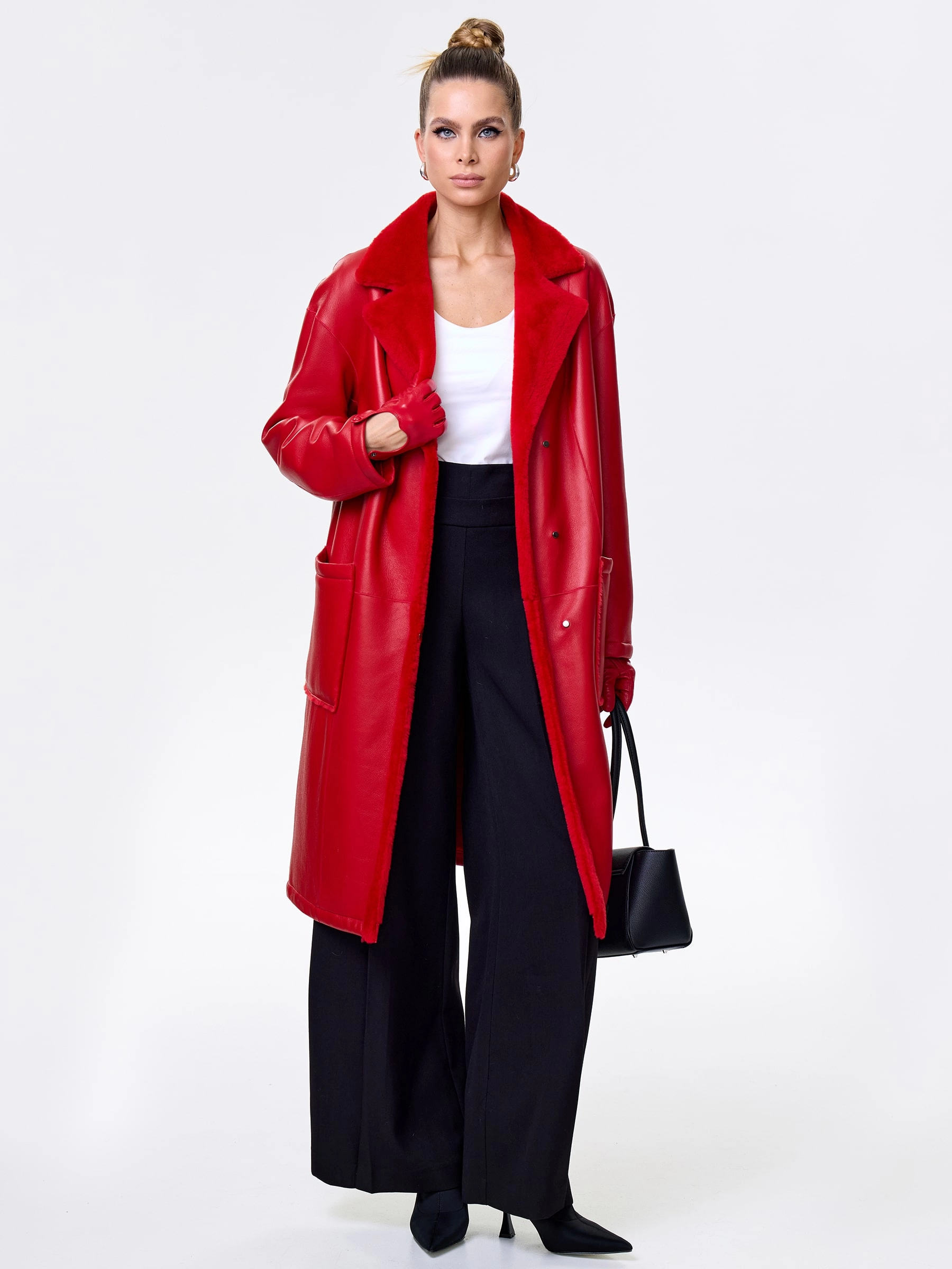 Товар длинная женская дубленка оверсайз премиум класса 2002, красная, размер 46, артикул 62441 выполнен из овчина "мерино" с застежкой кнопки. Рассчитан на сезон: осень-зима. Длина изделия 105 см, силуэт прямой.