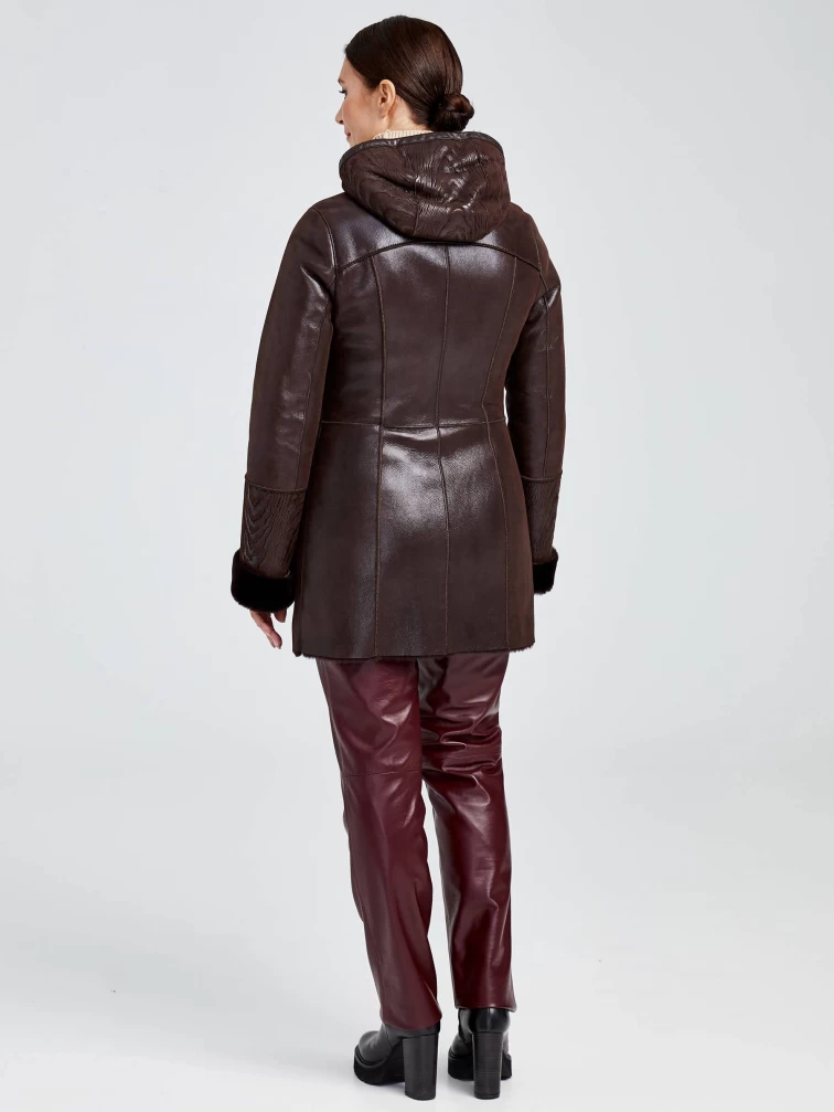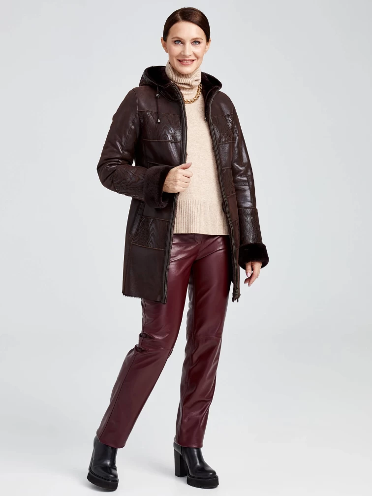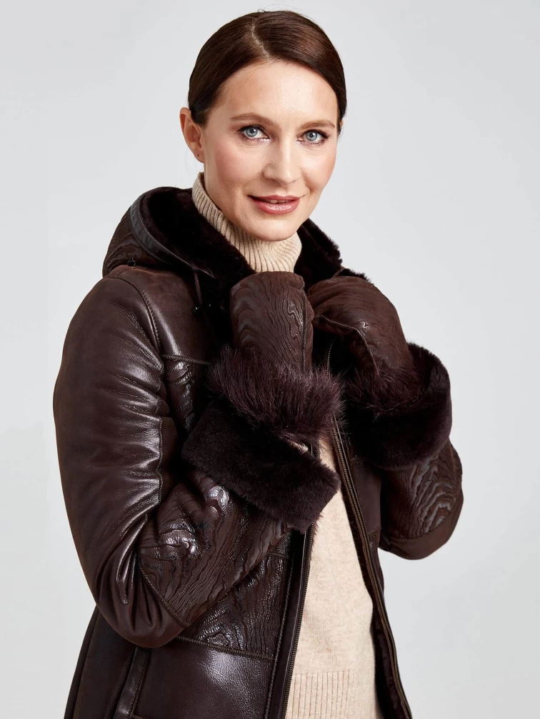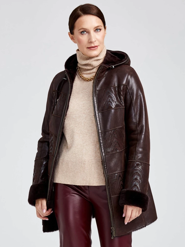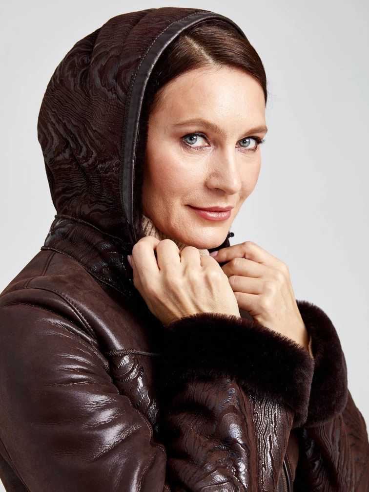 Короткая женская комбинированная дубленка с капюшоном 268, коричневая, размер 42, артикул 62360