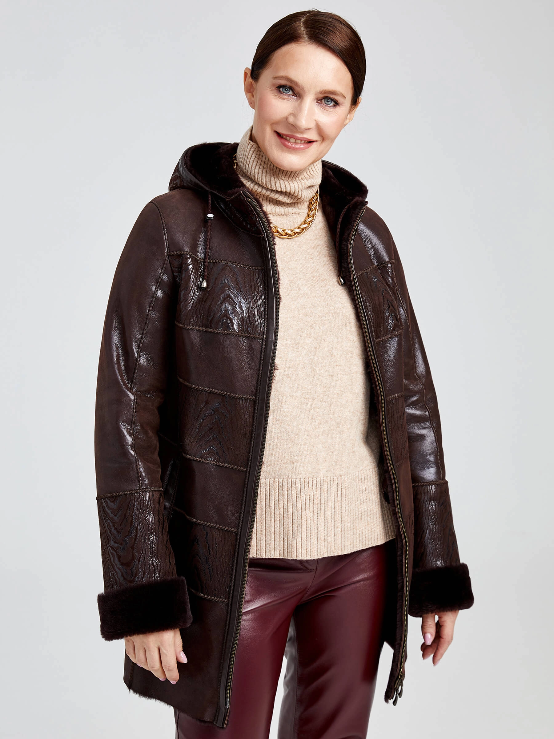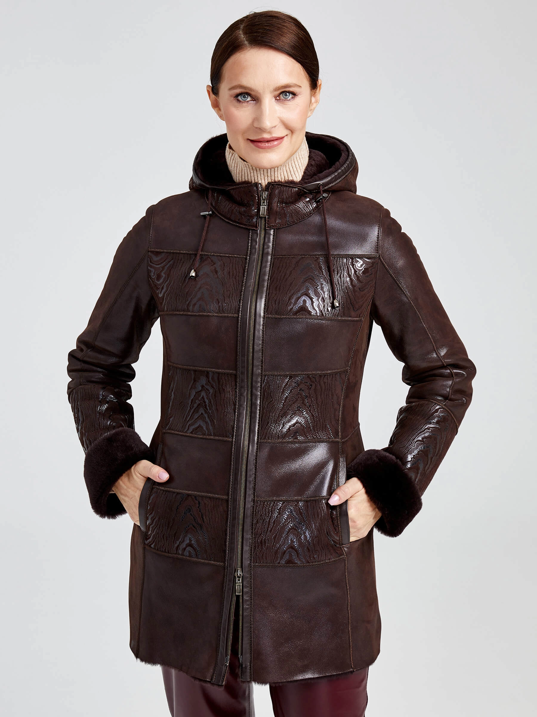 Короткая женская дубленка премиум-класса из натуральной овчины «мерино» на молнии с несъёмным капюшоном на кулиске. Полуприлегающий силуэт длиной 77 см дополнен втачными рукавами и практичными боковыми карманами. Уникальный дизайн с элементами пэчворка и контрастной кожаной отделкой вдоль молнии создаёт элегантный повседневный образ. Совет стилиста: сочетайте с облегающими джинсами или юбкой-миди и грубыми ботинками для сбалансированного кэжуал-образа.