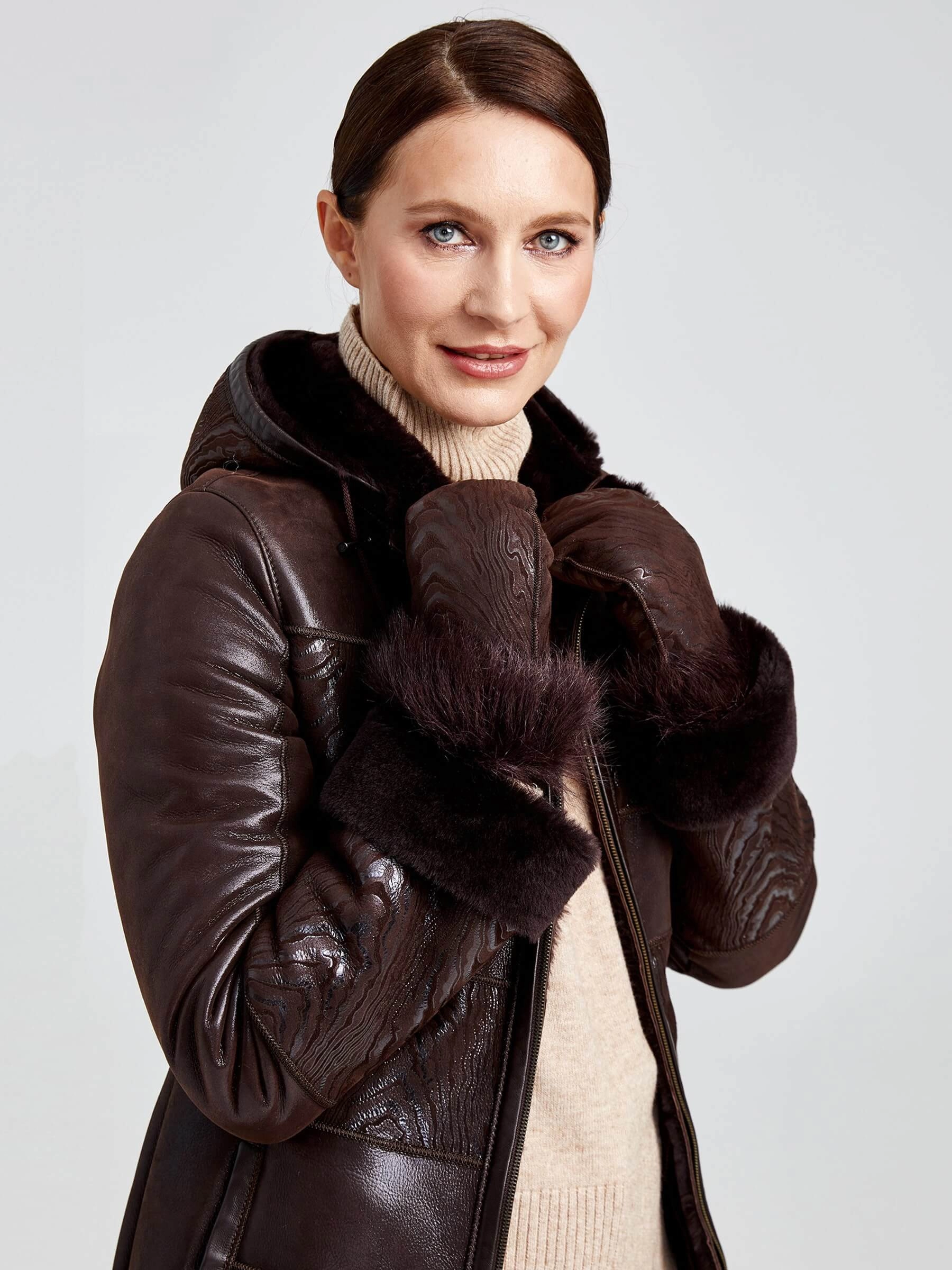 Товар короткая женская комбинированная дубленка с капюшоном 268, коричневая, размер 42, артикул 62360 выполнен из овчина "мерино" с застежкой молния. Рассчитан на сезон: осень-зима. Длина изделия 77 см, силуэт полуприлегающий.