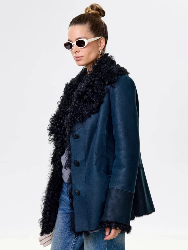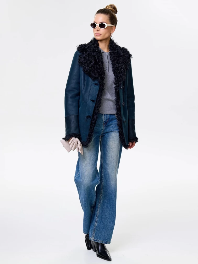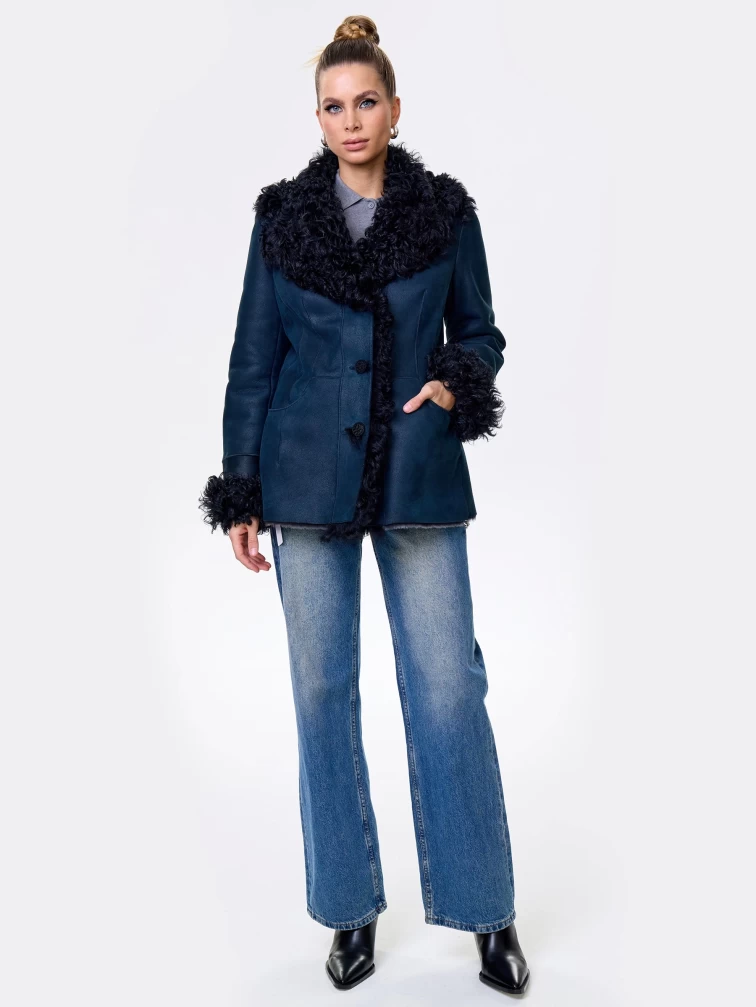 Товар короткая женская дубленка с овчиной тиградо 289, синяя, размер 42, артикул 61951 выполнен из овчина "мерино" с застежкой пуговицы. Рассчитан на сезон: осень-зима. Длина изделия 70 см, силуэт полуприлегающий.