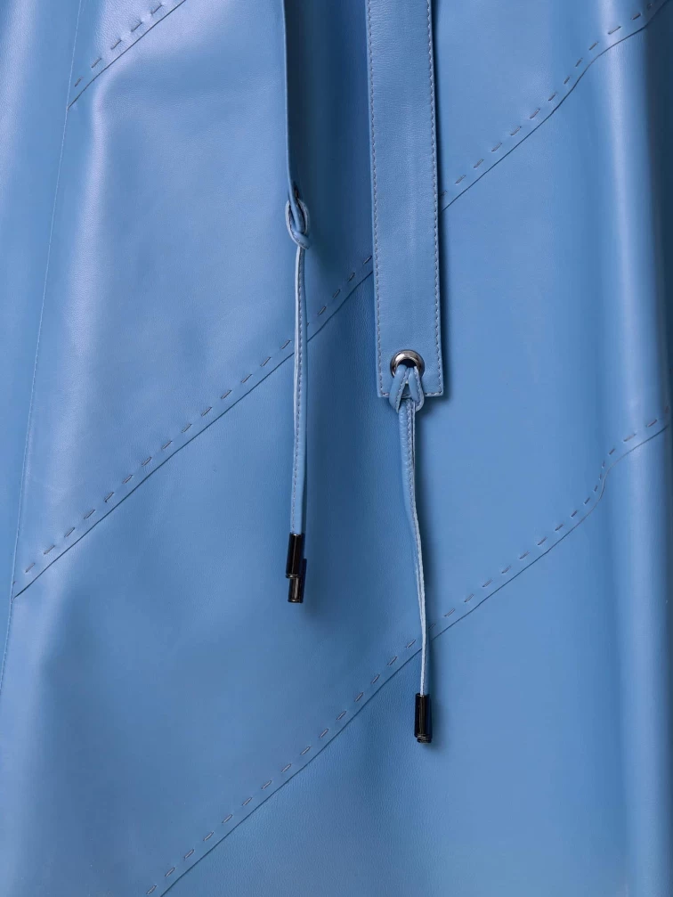 Элегантная расклешённая юбка из натуральной мягкой кожи нежного голубого оттенка с перламутровым переливом — это воплощение утончённости и свежести. Её облегающий крой подчёркивает женственные изгибы, а лёгкий клёш добавляет образу воздушности и динамики. Эксклюзивная ручная строчка, подчёркивает роскошь материала, а удлинённый пояс с декоративной пряжкой в виде волны придаёт модели неповторимый шарм. Потайная молния сзади сохраняет безупречные линии, делая эту юбку идеальным выбором для тех, кто ценит изысканность и индивидуальность.
