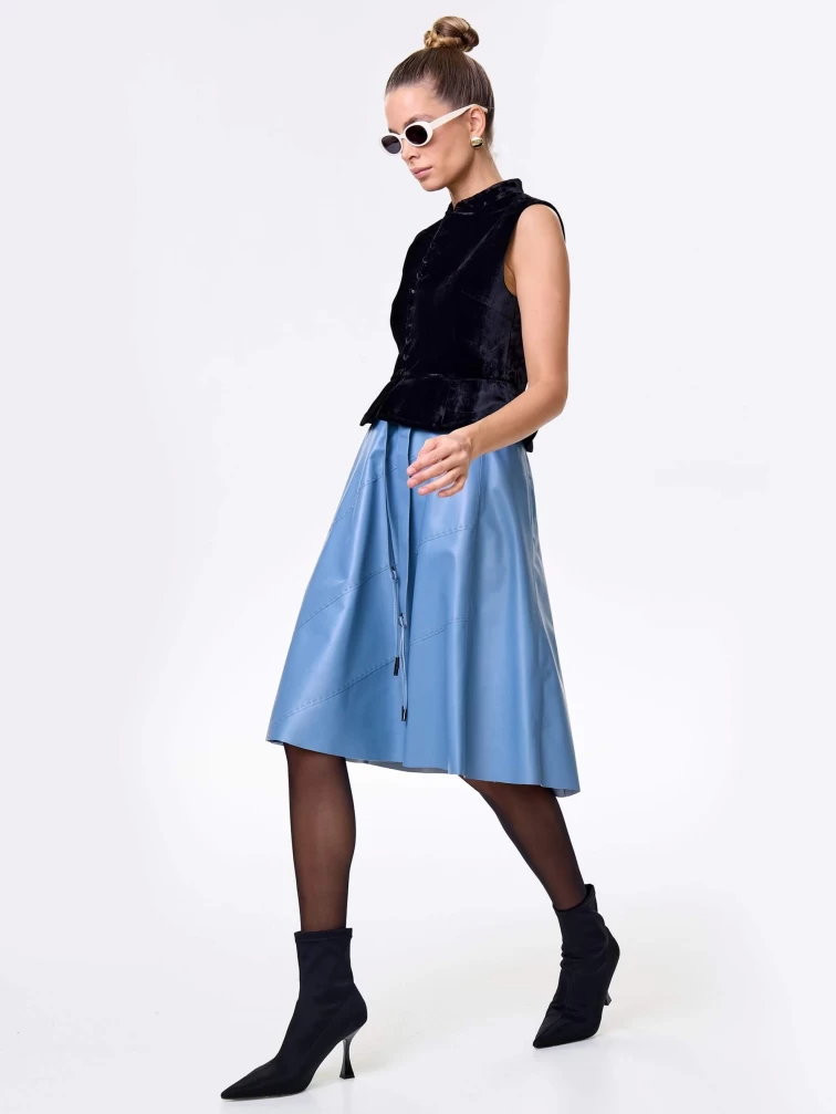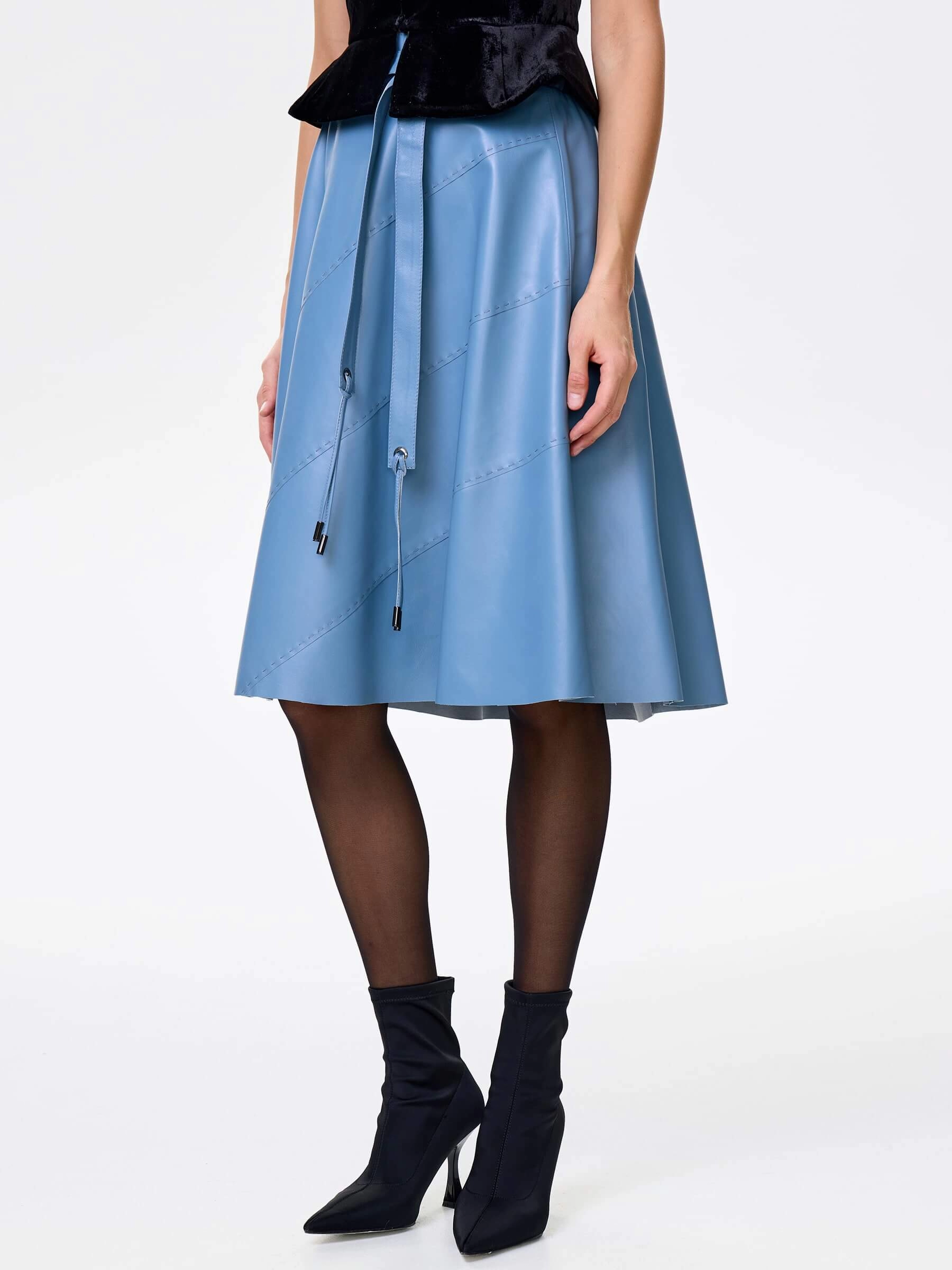 Товар голубая кожаная юбка 01рс, размер 46, артикул 85452 выполнен из натуральной кожи с застежкой молния. Рассчитан на сезон: демисезон. Длина изделия 70 см, силуэт расклешенный.