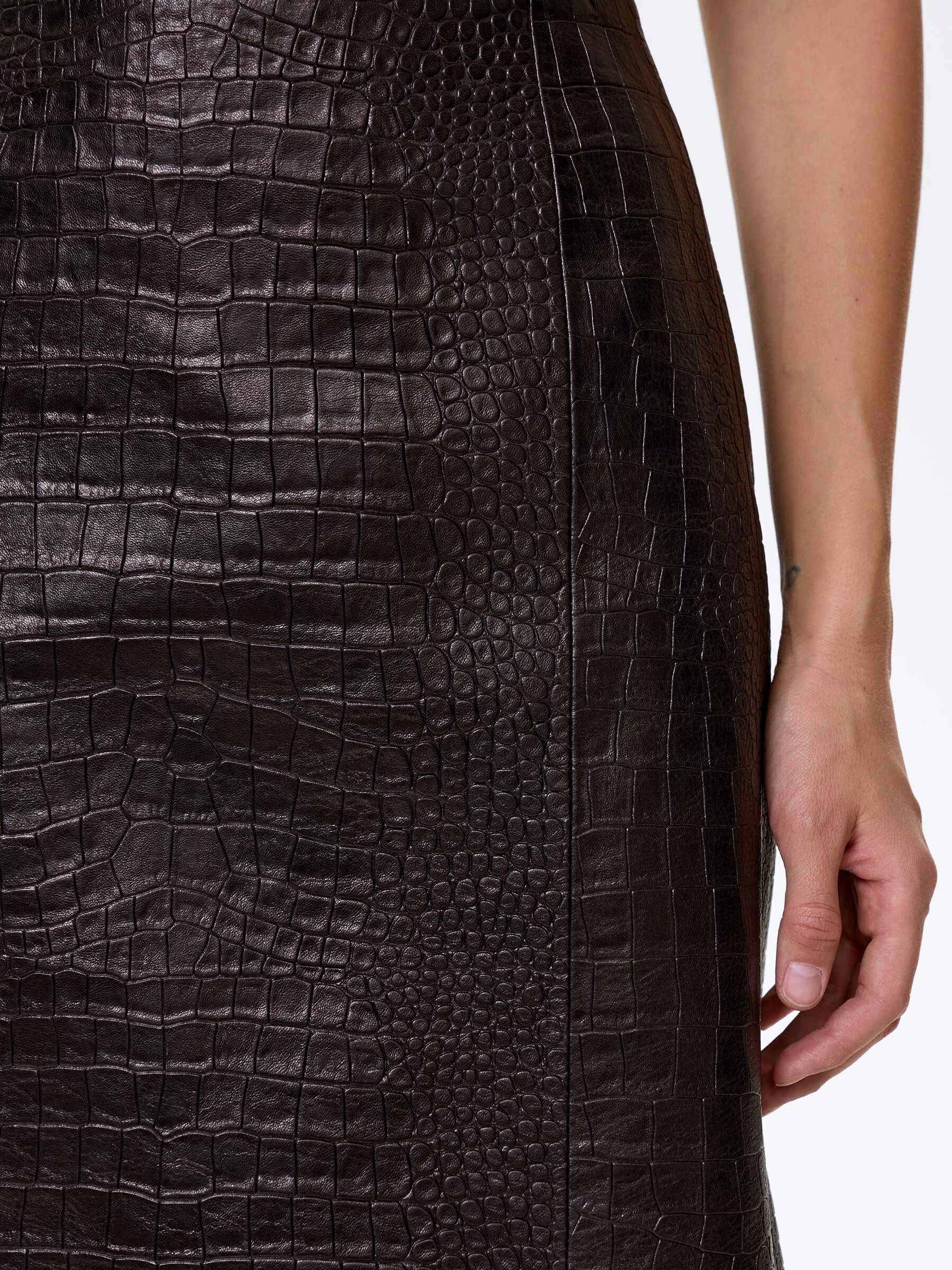 Юбка из мягкой натуральной кожи с эффектным тиснением под крокодила в глубоком черном цвете — образец элегантности и безупречного кроя. Изысканный блеск кожи, удобная застежка и лаконичный силуэт без пояса делают эту модель универсальной основой гардероба. Носите ее с классическими блузами для работы, с массивными джемперами для прогулок или с облегающими топами для вечера — благородная фактура кожи гарантирует безупречный вид в любой ситуации.